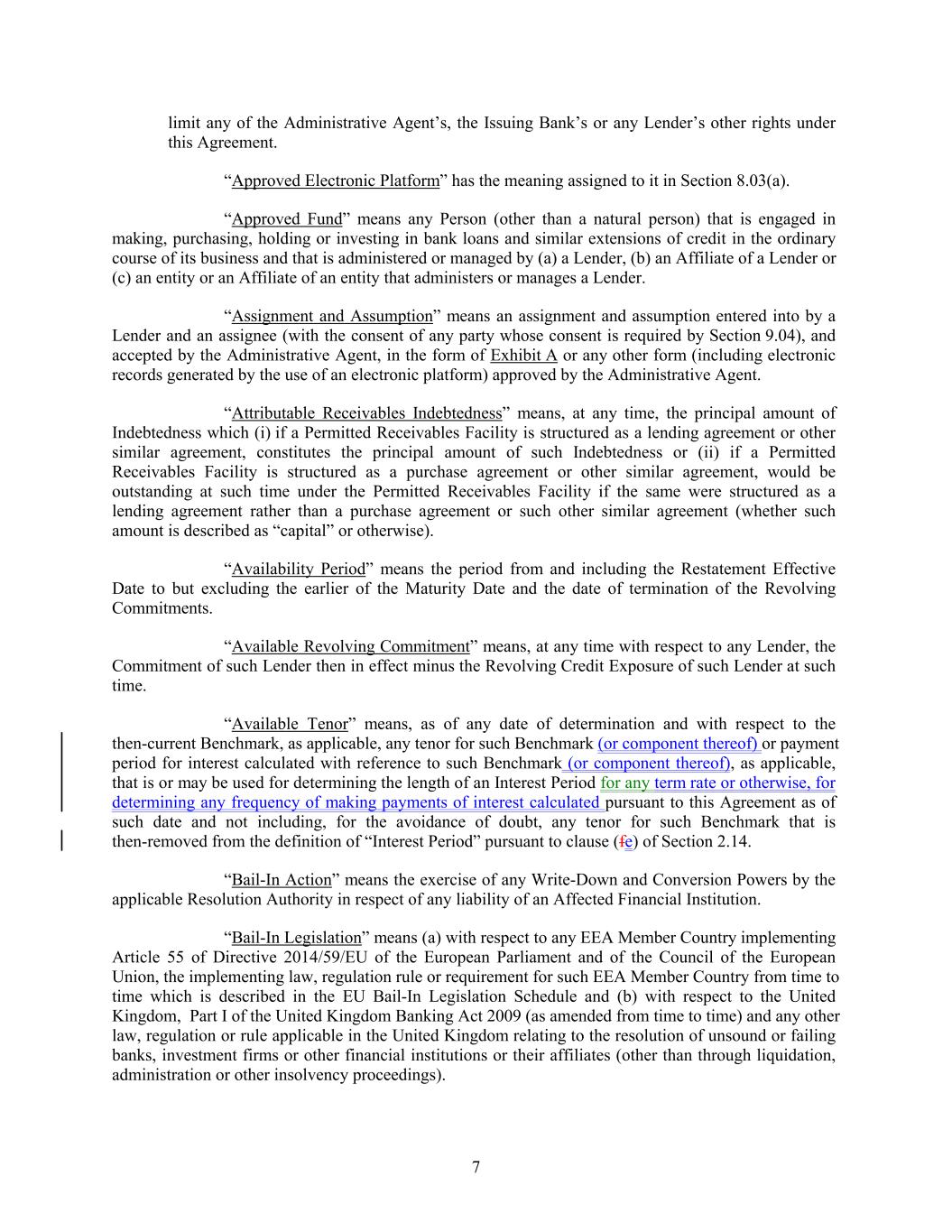 limit any of the Administrative Agent’s, the Issuing Bank’s or any Lender’s other rights under this Agreement. “Approved Electronic Platform” has the meaning assigned to it in Section 8.03(a). “Approved Fund” means any Person (other than a natural person) that is engaged in making, purchasing, holding or investing in bank loans and similar extensions of credit in the ordinary course of its business and that is administered or managed by (a) a Lender, (b) an Affiliate of a Lender or (c) an entity or an Affiliate of an entity that administers or manages a Lender. “Assignment and Assumption” means an assignment and assumption entered into by a Lender and an assignee (with the consent of any party whose consent is required by Section 9.04), and accepted by the Administrative Agent, in the form of Exhibit A or any other form (including electronic records generated by the use of an electronic platform) approved by the Administrative Agent. “Attributable Receivables Indebtedness” means, at any time, the principal amount of Indebtedness which (i) if a Permitted Receivables Facility is structured as a lending agreement or other similar agreement, constitutes the principal amount of such Indebtedness or (ii) if a Permitted Receivables Facility is structured as a purchase agreement or other similar agreement, would be outstanding at such time under the Permitted Receivables Facility if the same were structured as a lending agreement rather than a purchase agreement or such other similar agreement (whether such amount is described as “capital” or otherwise). “Availability Period” means the period from and including the Restatement Effective Date to but excluding the earlier of the Maturity Date and the date of termination of the Revolving Commitments. “Available Revolving Commitment” means, at any time with respect to any Lender, the Commitment of such Lender then in effect minus the Revolving Credit Exposure of such Lender at such time. “Available Tenor” means, as of any date of determination and with respect to the then-current Benchmark, as applicable, any tenor for such Benchmark (or component thereof) or payment period for interest calculated with reference to such Benchmark (or component thereof), as applicable, that is or may be used for determining the length of an Interest Period for any term rate or otherwise, for determining any frequency of making payments of interest calculated pursuant to this Agreement as of such date and not including, for the avoidance of doubt, any tenor for such Benchmark that is then-removed from the definition of “Interest Period” pursuant to clause (fe) of Section 2.14. “Bail-In Action” means the exercise of any Write-Down and Conversion Powers by the applicable Resolution Authority in respect of any liability of an Affected Financial Institution. “Bail-In Legislation” means (a) with respect to any EEA Member Country implementing Article 55 of Directive 2014/59/EU of the European Parliament and of the Council of the European Union, the implementing law, regulation rule or requirement for such EEA Member Country from time to time which is described in the EU Bail-In Legislation Schedule and (b) with respect to the United Kingdom, Part I of the United Kingdom Banking Act 2009 (as amended from time to time) and any other law, regulation or rule applicable in the United Kingdom relating to the resolution of unsound or failing banks, investment firms or other financial institutions or their affiliates (other than through liquidation, administration or other insolvency proceedings). 7