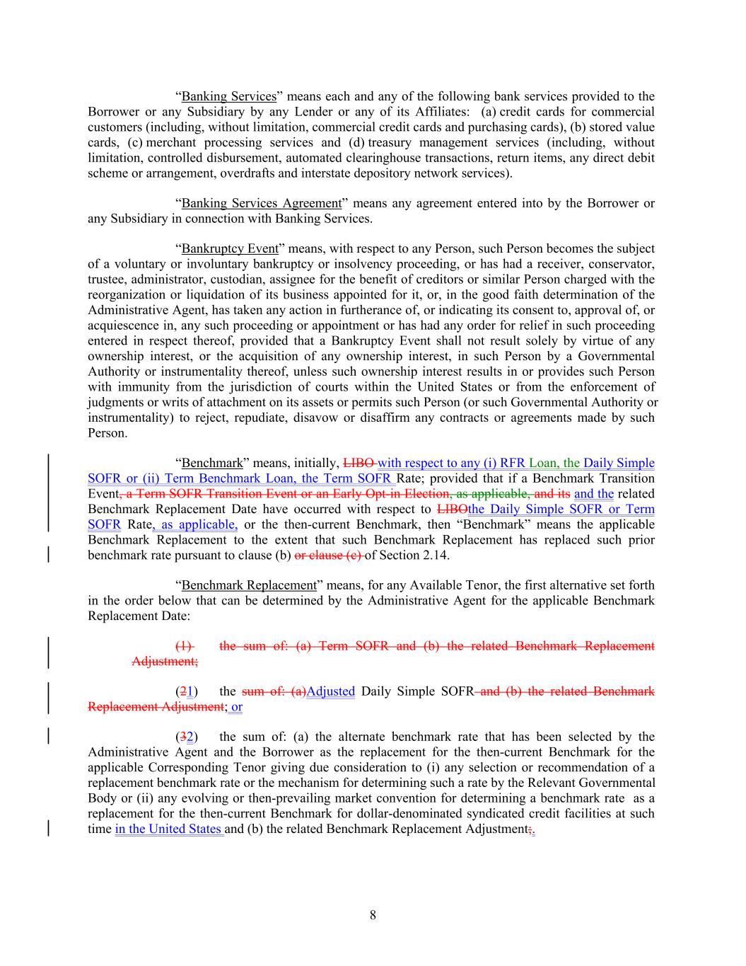 “Banking Services” means each and any of the following bank services provided to the Borrower or any Subsidiary by any Lender or any of its Affiliates: (a) credit cards for commercial customers (including, without limitation, commercial credit cards and purchasing cards), (b) stored value cards, (c) merchant processing services and (d) treasury management services (including, without limitation, controlled disbursement, automated clearinghouse transactions, return items, any direct debit scheme or arrangement, overdrafts and interstate depository network services). “Banking Services Agreement” means any agreement entered into by the Borrower or any Subsidiary in connection with Banking Services. “Bankruptcy Event” means, with respect to any Person, such Person becomes the subject of a voluntary or involuntary bankruptcy or insolvency proceeding, or has had a receiver, conservator, trustee, administrator, custodian, assignee for the benefit of creditors or similar Person charged with the reorganization or liquidation of its business appointed for it, or, in the good faith determination of the Administrative Agent, has taken any action in furtherance of, or indicating its consent to, approval of, or acquiescence in, any such proceeding or appointment or has had any order for relief in such proceeding entered in respect thereof, provided that a Bankruptcy Event shall not result solely by virtue of any ownership interest, or the acquisition of any ownership interest, in such Person by a Governmental Authority or instrumentality thereof, unless such ownership interest results in or provides such Person with immunity from the jurisdiction of courts within the United States or from the enforcement of judgments or writs of attachment on its assets or permits such Person (or such Governmental Authority or instrumentality) to reject, repudiate, disavow or disaffirm any contracts or agreements made by such Person. “Benchmark” means, initially, LIBO with respect to any (i) RFR Loan, the Daily Simple SOFR or (ii) Term Benchmark Loan, the Term SOFR Rate; provided that if a Benchmark Transition Event, a Term SOFR Transition Event or an Early Opt-in Election, as applicable, and its and the related Benchmark Replacement Date have occurred with respect to LIBOthe Daily Simple SOFR or Term SOFR Rate, as applicable, or the then-current Benchmark, then “Benchmark” means the applicable Benchmark Replacement to the extent that such Benchmark Replacement has replaced such prior benchmark rate pursuant to clause (b) or clause (c) of Section 2.14. “Benchmark Replacement” means, for any Available Tenor, the first alternative set forth in the order below that can be determined by the Administrative Agent for the applicable Benchmark Replacement Date: (1) the sum of: (a) Term SOFR and (b) the related Benchmark Replacement Adjustment; (21) the sum of: (a)Adjusted Daily Simple SOFR and (b) the related Benchmark Replacement Adjustment; or (32) the sum of: (a) the alternate benchmark rate that has been selected by the Administrative Agent and the Borrower as the replacement for the then-current Benchmark for the applicable Corresponding Tenor giving due consideration to (i) any selection or recommendation of a replacement benchmark rate or the mechanism for determining such a rate by the Relevant Governmental Body or (ii) any evolving or then-prevailing market convention for determining a benchmark rate as a replacement for the then-current Benchmark for dollar-denominated syndicated credit facilities at such time in the United States and (b) the related Benchmark Replacement Adjustment;. 8