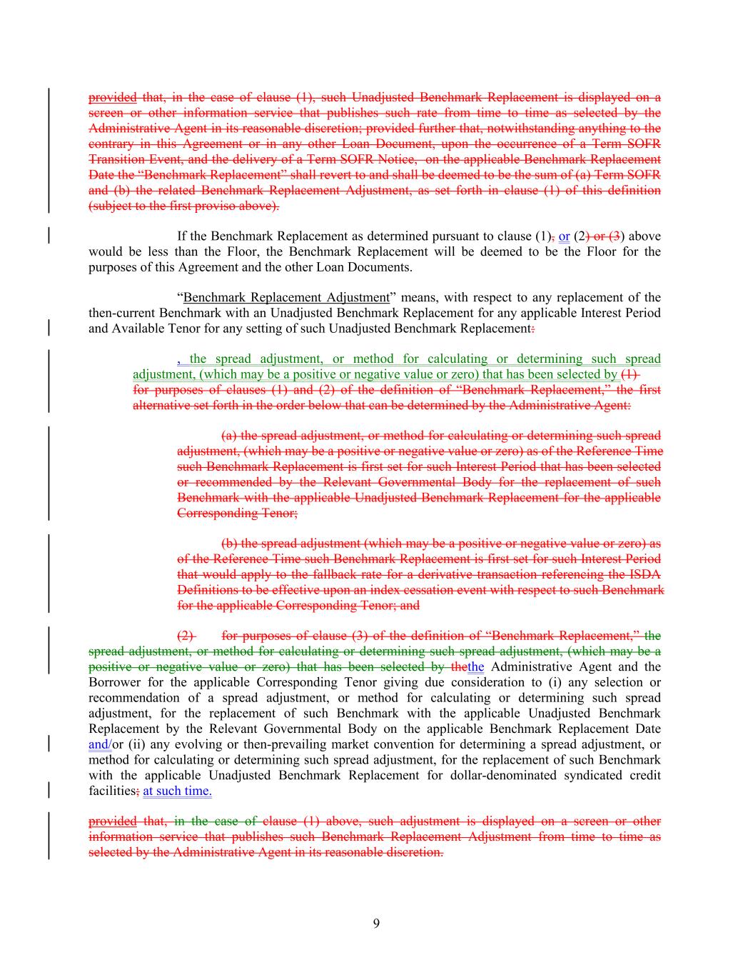 provided that, in the case of clause (1), such Unadjusted Benchmark Replacement is displayed on a screen or other information service that publishes such rate from time to time as selected by the Administrative Agent in its reasonable discretion; provided further that, notwithstanding anything to the contrary in this Agreement or in any other Loan Document, upon the occurrence of a Term SOFR Transition Event, and the delivery of a Term SOFR Notice, on the applicable Benchmark Replacement Date the “Benchmark Replacement” shall revert to and shall be deemed to be the sum of (a) Term SOFR and (b) the related Benchmark Replacement Adjustment, as set forth in clause (1) of this definition (subject to the first proviso above). If the Benchmark Replacement as determined pursuant to clause (1), or (2) or (3) above would be less than the Floor, the Benchmark Replacement will be deemed to be the Floor for the purposes of this Agreement and the other Loan Documents. “Benchmark Replacement Adjustment” means, with respect to any replacement of the then-current Benchmark with an Unadjusted Benchmark Replacement for any applicable Interest Period and Available Tenor for any setting of such Unadjusted Benchmark Replacement: , the spread adjustment, or method for calculating or determining such spread adjustment, (which may be a positive or negative value or zero) that has been selected by (1) for purposes of clauses (1) and (2) of the definition of “Benchmark Replacement,” the first alternative set forth in the order below that can be determined by the Administrative Agent: (a) the spread adjustment, or method for calculating or determining such spread adjustment, (which may be a positive or negative value or zero) as of the Reference Time such Benchmark Replacement is first set for such Interest Period that has been selected or recommended by the Relevant Governmental Body for the replacement of such Benchmark with the applicable Unadjusted Benchmark Replacement for the applicable Corresponding Tenor; (b) the spread adjustment (which may be a positive or negative value or zero) as of the Reference Time such Benchmark Replacement is first set for such Interest Period that would apply to the fallback rate for a derivative transaction referencing the ISDA Definitions to be effective upon an index cessation event with respect to such Benchmark for the applicable Corresponding Tenor; and (2) for purposes of clause (3) of the definition of “Benchmark Replacement,” the spread adjustment, or method for calculating or determining such spread adjustment, (which may be a positive or negative value or zero) that has been selected by thethe Administrative Agent and the Borrower for the applicable Corresponding Tenor giving due consideration to (i) any selection or recommendation of a spread adjustment, or method for calculating or determining such spread adjustment, for the replacement of such Benchmark with the applicable Unadjusted Benchmark Replacement by the Relevant Governmental Body on the applicable Benchmark Replacement Date and/or (ii) any evolving or then-prevailing market convention for determining a spread adjustment, or method for calculating or determining such spread adjustment, for the replacement of such Benchmark with the applicable Unadjusted Benchmark Replacement for dollar-denominated syndicated credit facilities; at such time. provided that, in the case of clause (1) above, such adjustment is displayed on a screen or other information service that publishes such Benchmark Replacement Adjustment from time to time as selected by the Administrative Agent in its reasonable discretion. 9