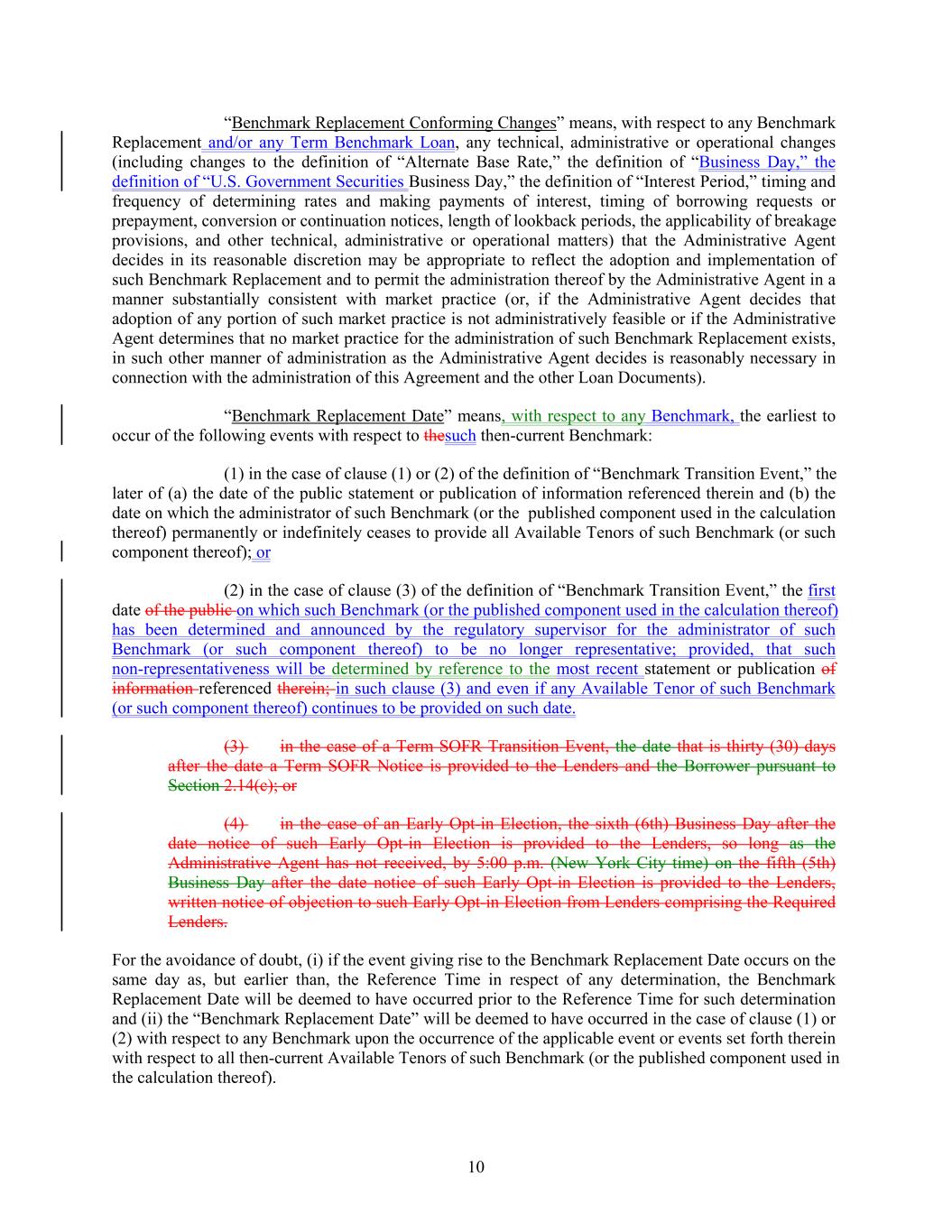 “Benchmark Replacement Conforming Changes” means, with respect to any Benchmark Replacement and/or any Term Benchmark Loan, any technical, administrative or operational changes (including changes to the definition of “Alternate Base Rate,” the definition of “Business Day,” the definition of “U.S. Government Securities Business Day,” the definition of “Interest Period,” timing and frequency of determining rates and making payments of interest, timing of borrowing requests or prepayment, conversion or continuation notices, length of lookback periods, the applicability of breakage provisions, and other technical, administrative or operational matters) that the Administrative Agent decides in its reasonable discretion may be appropriate to reflect the adoption and implementation of such Benchmark Replacement and to permit the administration thereof by the Administrative Agent in a manner substantially consistent with market practice (or, if the Administrative Agent decides that adoption of any portion of such market practice is not administratively feasible or if the Administrative Agent determines that no market practice for the administration of such Benchmark Replacement exists, in such other manner of administration as the Administrative Agent decides is reasonably necessary in connection with the administration of this Agreement and the other Loan Documents). “Benchmark Replacement Date” means, with respect to any Benchmark, the earliest to occur of the following events with respect to thesuch then-current Benchmark: (1) in the case of clause (1) or (2) of the definition of “Benchmark Transition Event,” the later of (a) the date of the public statement or publication of information referenced therein and (b) the date on which the administrator of such Benchmark (or the published component used in the calculation thereof) permanently or indefinitely ceases to provide all Available Tenors of such Benchmark (or such component thereof); or (2) in the case of clause (3) of the definition of “Benchmark Transition Event,” the first date of the public on which such Benchmark (or the published component used in the calculation thereof) has been determined and announced by the regulatory supervisor for the administrator of such Benchmark (or such component thereof) to be no longer representative; provided, that such non-representativeness will be determined by reference to the most recent statement or publication of information referenced therein; in such clause (3) and even if any Available Tenor of such Benchmark (or such component thereof) continues to be provided on such date. (3) in the case of a Term SOFR Transition Event, the date that is thirty (30) days after the date a Term SOFR Notice is provided to the Lenders and the Borrower pursuant to Section 2.14(c); or (4) in the case of an Early Opt-in Election, the sixth (6th) Business Day after the date notice of such Early Opt-in Election is provided to the Lenders, so long as the Administrative Agent has not received, by 5:00 p.m. (New York City time) on the fifth (5th) Business Day after the date notice of such Early Opt-in Election is provided to the Lenders, written notice of objection to such Early Opt-in Election from Lenders comprising the Required Lenders. For the avoidance of doubt, (i) if the event giving rise to the Benchmark Replacement Date occurs on the same day as, but earlier than, the Reference Time in respect of any determination, the Benchmark Replacement Date will be deemed to have occurred prior to the Reference Time for such determination and (ii) the “Benchmark Replacement Date” will be deemed to have occurred in the case of clause (1) or (2) with respect to any Benchmark upon the occurrence of the applicable event or events set forth therein with respect to all then-current Available Tenors of such Benchmark (or the published component used in the calculation thereof). 10