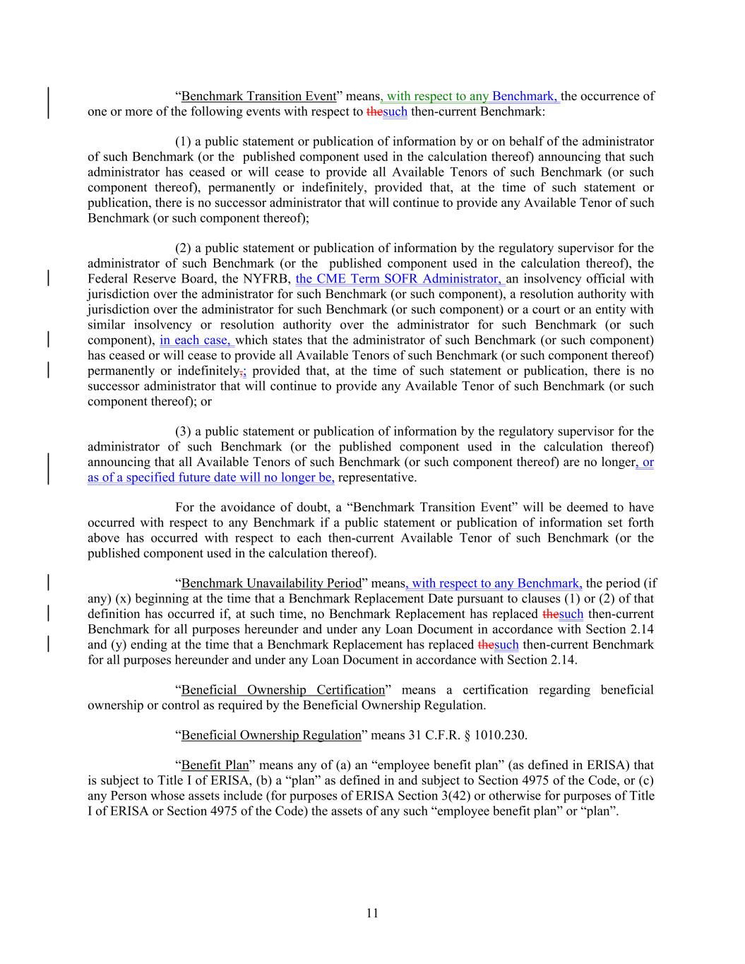 “Benchmark Transition Event” means, with respect to any Benchmark, the occurrence of one or more of the following events with respect to thesuch then-current Benchmark: (1) a public statement or publication of information by or on behalf of the administrator of such Benchmark (or the published component used in the calculation thereof) announcing that such administrator has ceased or will cease to provide all Available Tenors of such Benchmark (or such component thereof), permanently or indefinitely, provided that, at the time of such statement or publication, there is no successor administrator that will continue to provide any Available Tenor of such Benchmark (or such component thereof); (2) a public statement or publication of information by the regulatory supervisor for the administrator of such Benchmark (or the published component used in the calculation thereof), the Federal Reserve Board, the NYFRB, the CME Term SOFR Administrator, an insolvency official with jurisdiction over the administrator for such Benchmark (or such component), a resolution authority with jurisdiction over the administrator for such Benchmark (or such component) or a court or an entity with similar insolvency or resolution authority over the administrator for such Benchmark (or such component), in each case, which states that the administrator of such Benchmark (or such component) has ceased or will cease to provide all Available Tenors of such Benchmark (or such component thereof) permanently or indefinitely,; provided that, at the time of such statement or publication, there is no successor administrator that will continue to provide any Available Tenor of such Benchmark (or such component thereof); or (3) a public statement or publication of information by the regulatory supervisor for the administrator of such Benchmark (or the published component used in the calculation thereof) announcing that all Available Tenors of such Benchmark (or such component thereof) are no longer, or as of a specified future date will no longer be, representative. For the avoidance of doubt, a “Benchmark Transition Event” will be deemed to have occurred with respect to any Benchmark if a public statement or publication of information set forth above has occurred with respect to each then-current Available Tenor of such Benchmark (or the published component used in the calculation thereof). “Benchmark Unavailability Period” means, with respect to any Benchmark, the period (if any) (x) beginning at the time that a Benchmark Replacement Date pursuant to clauses (1) or (2) of that definition has occurred if, at such time, no Benchmark Replacement has replaced thesuch then-current Benchmark for all purposes hereunder and under any Loan Document in accordance with Section 2.14 and (y) ending at the time that a Benchmark Replacement has replaced thesuch then-current Benchmark for all purposes hereunder and under any Loan Document in accordance with Section 2.14. “Beneficial Ownership Certification” means a certification regarding beneficial ownership or control as required by the Beneficial Ownership Regulation. “Beneficial Ownership Regulation” means 31 C.F.R. § 1010.230. “Benefit Plan” means any of (a) an “employee benefit plan” (as defined in ERISA) that is subject to Title I of ERISA, (b) a “plan” as defined in and subject to Section 4975 of the Code, or (c) any Person whose assets include (for purposes of ERISA Section 3(42) or otherwise for purposes of Title I of ERISA or Section 4975 of the Code) the assets of any such “employee benefit plan” or “plan”. 11