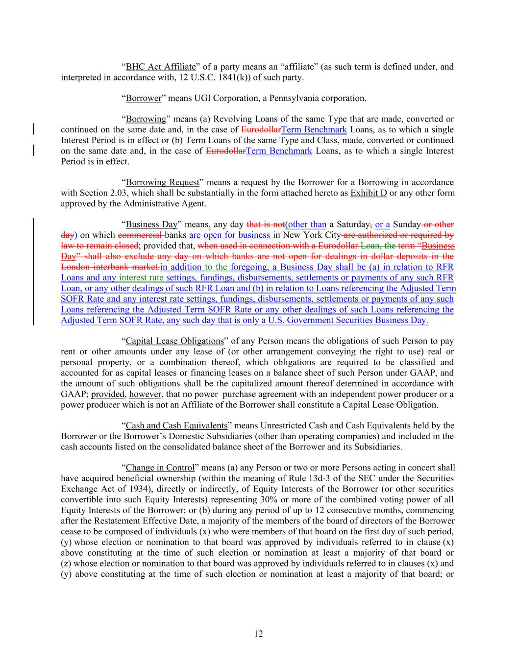 “BHC Act Affiliate” of a party means an “affiliate” (as such term is defined under, and interpreted in accordance with, 12 U.S.C. 1841(k)) of such party. “Borrower” means UGI Corporation, a Pennsylvania corporation. “Borrowing” means (a) Revolving Loans of the same Type that are made, converted or continued on the same date and, in the case of EurodollarTerm Benchmark Loans, as to which a single Interest Period is in effect or (b) Term Loans of the same Type and Class, made, converted or continued on the same date and, in the case of EurodollarTerm Benchmark Loans, as to which a single Interest Period is in effect. “Borrowing Request” means a request by the Borrower for a Borrowing in accordance with Section 2.03, which shall be substantially in the form attached hereto as Exhibit D or any other form approved by the Administrative Agent. “Business Day” means, any day that is not(other than a Saturday, or a Sunday or other day) on which commercial banks are open for business in New York City are authorized or required by law to remain closed; provided that, when used in connection with a Eurodollar Loan, the term “Business Day” shall also exclude any day on which banks are not open for dealings in dollar deposits in the London interbank market.in addition to the foregoing, a Business Day shall be (a) in relation to RFR Loans and any interest rate settings, fundings, disbursements, settlements or payments of any such RFR Loan, or any other dealings of such RFR Loan and (b) in relation to Loans referencing the Adjusted Term SOFR Rate and any interest rate settings, fundings, disbursements, settlements or payments of any such Loans referencing the Adjusted Term SOFR Rate or any other dealings of such Loans referencing the Adjusted Term SOFR Rate, any such day that is only a U.S. Government Securities Business Day. “Capital Lease Obligations” of any Person means the obligations of such Person to pay rent or other amounts under any lease of (or other arrangement conveying the right to use) real or personal property, or a combination thereof, which obligations are required to be classified and accounted for as capital leases or financing leases on a balance sheet of such Person under GAAP, and the amount of such obligations shall be the capitalized amount thereof determined in accordance with GAAP; provided, however, that no power purchase agreement with an independent power producer or a power producer which is not an Affiliate of the Borrower shall constitute a Capital Lease Obligation. “Cash and Cash Equivalents” means Unrestricted Cash and Cash Equivalents held by the Borrower or the Borrower’s Domestic Subsidiaries (other than operating companies) and included in the cash accounts listed on the consolidated balance sheet of the Borrower and its Subsidiaries. “Change in Control” means (a) any Person or two or more Persons acting in concert shall have acquired beneficial ownership (within the meaning of Rule 13d-3 of the SEC under the Securities Exchange Act of 1934), directly or indirectly, of Equity Interests of the Borrower (or other securities convertible into such Equity Interests) representing 30% or more of the combined voting power of all Equity Interests of the Borrower; or (b) during any period of up to 12 consecutive months, commencing after the Restatement Effective Date, a majority of the members of the board of directors of the Borrower cease to be composed of individuals (x) who were members of that board on the first day of such period, (y) whose election or nomination to that board was approved by individuals referred to in clause (x) above constituting at the time of such election or nomination at least a majority of that board or (z) whose election or nomination to that board was approved by individuals referred to in clauses (x) and (y) above constituting at the time of such election or nomination at least a majority of that board; or 12