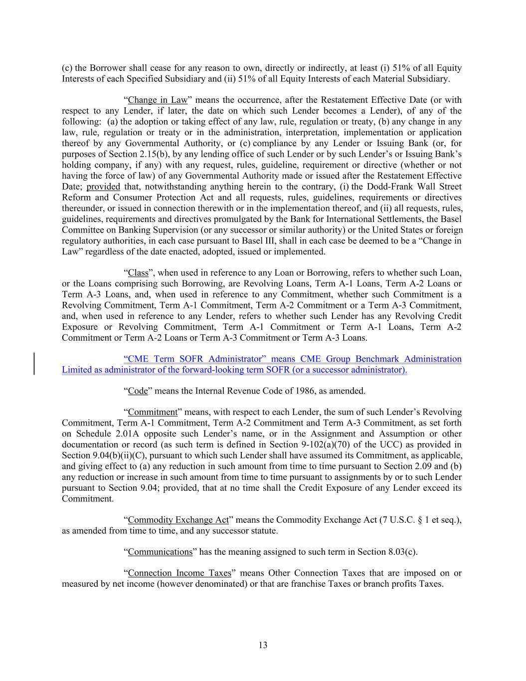 (c) the Borrower shall cease for any reason to own, directly or indirectly, at least (i) 51% of all Equity Interests of each Specified Subsidiary and (ii) 51% of all Equity Interests of each Material Subsidiary. “Change in Law” means the occurrence, after the Restatement Effective Date (or with respect to any Lender, if later, the date on which such Lender becomes a Lender), of any of the following: (a) the adoption or taking effect of any law, rule, regulation or treaty, (b) any change in any law, rule, regulation or treaty or in the administration, interpretation, implementation or application thereof by any Governmental Authority, or (c) compliance by any Lender or Issuing Bank (or, for purposes of Section 2.15(b), by any lending office of such Lender or by such Lender’s or Issuing Bank’s holding company, if any) with any request, rules, guideline, requirement or directive (whether or not having the force of law) of any Governmental Authority made or issued after the Restatement Effective Date; provided that, notwithstanding anything herein to the contrary, (i) the Dodd-Frank Wall Street Reform and Consumer Protection Act and all requests, rules, guidelines, requirements or directives thereunder, or issued in connection therewith or in the implementation thereof, and (ii) all requests, rules, guidelines, requirements and directives promulgated by the Bank for International Settlements, the Basel Committee on Banking Supervision (or any successor or similar authority) or the United States or foreign regulatory authorities, in each case pursuant to Basel III, shall in each case be deemed to be a “Change in Law” regardless of the date enacted, adopted, issued or implemented. “Class”, when used in reference to any Loan or Borrowing, refers to whether such Loan, or the Loans comprising such Borrowing, are Revolving Loans, Term A-1 Loans, Term A-2 Loans or Term A-3 Loans, and, when used in reference to any Commitment, whether such Commitment is a Revolving Commitment, Term A-1 Commitment, Term A-2 Commitment or a Term A-3 Commitment, and, when used in reference to any Lender, refers to whether such Lender has any Revolving Credit Exposure or Revolving Commitment, Term A-1 Commitment or Term A-1 Loans, Term A-2 Commitment or Term A-2 Loans or Term A-3 Commitment or Term A-3 Loans. “CME Term SOFR Administrator” means CME Group Benchmark Administration Limited as administrator of the forward-looking term SOFR (or a successor administrator). “Code” means the Internal Revenue Code of 1986, as amended. “Commitment” means, with respect to each Lender, the sum of such Lender’s Revolving Commitment, Term A-1 Commitment, Term A-2 Commitment and Term A-3 Commitment, as set forth on Schedule 2.01A opposite such Lender’s name, or in the Assignment and Assumption or other documentation or record (as such term is defined in Section 9-102(a)(70) of the UCC) as provided in Section 9.04(b)(ii)(C), pursuant to which such Lender shall have assumed its Commitment, as applicable, and giving effect to (a) any reduction in such amount from time to time pursuant to Section 2.09 and (b) any reduction or increase in such amount from time to time pursuant to assignments by or to such Lender pursuant to Section 9.04; provided, that at no time shall the Credit Exposure of any Lender exceed its Commitment. “Commodity Exchange Act” means the Commodity Exchange Act (7 U.S.C. § 1 et seq.), as amended from time to time, and any successor statute. “Communications” has the meaning assigned to such term in Section 8.03(c). “Connection Income Taxes” means Other Connection Taxes that are imposed on or measured by net income (however denominated) or that are franchise Taxes or branch profits Taxes. 13