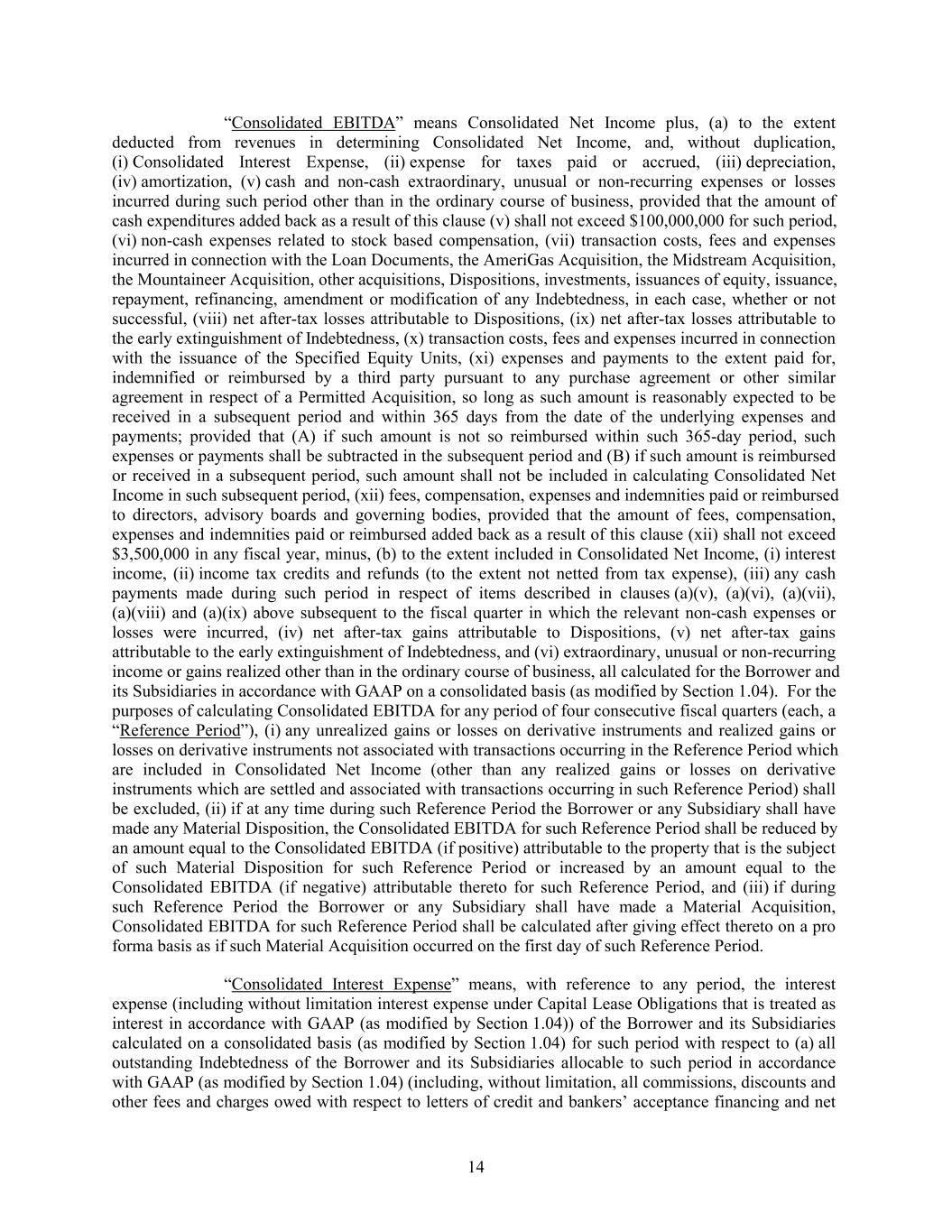 “Consolidated EBITDA” means Consolidated Net Income plus, (a) to the extent deducted from revenues in determining Consolidated Net Income, and, without duplication, (i) Consolidated Interest Expense, (ii) expense for taxes paid or accrued, (iii) depreciation, (iv) amortization, (v) cash and non-cash extraordinary, unusual or non-recurring expenses or losses incurred during such period other than in the ordinary course of business, provided that the amount of cash expenditures added back as a result of this clause (v) shall not exceed $100,000,000 for such period, (vi) non-cash expenses related to stock based compensation, (vii) transaction costs, fees and expenses incurred in connection with the Loan Documents, the AmeriGas Acquisition, the Midstream Acquisition, the Mountaineer Acquisition, other acquisitions, Dispositions, investments, issuances of equity, issuance, repayment, refinancing, amendment or modification of any Indebtedness, in each case, whether or not successful, (viii) net after-tax losses attributable to Dispositions, (ix) net after-tax losses attributable to the early extinguishment of Indebtedness, (x) transaction costs, fees and expenses incurred in connection with the issuance of the Specified Equity Units, (xi) expenses and payments to the extent paid for, indemnified or reimbursed by a third party pursuant to any purchase agreement or other similar agreement in respect of a Permitted Acquisition, so long as such amount is reasonably expected to be received in a subsequent period and within 365 days from the date of the underlying expenses and payments; provided that (A) if such amount is not so reimbursed within such 365-day period, such expenses or payments shall be subtracted in the subsequent period and (B) if such amount is reimbursed or received in a subsequent period, such amount shall not be included in calculating Consolidated Net Income in such subsequent period, (xii) fees, compensation, expenses and indemnities paid or reimbursed to directors, advisory boards and governing bodies, provided that the amount of fees, compensation, expenses and indemnities paid or reimbursed added back as a result of this clause (xii) shall not exceed $3,500,000 in any fiscal year, minus, (b) to the extent included in Consolidated Net Income, (i) interest income, (ii) income tax credits and refunds (to the extent not netted from tax expense), (iii) any cash payments made during such period in respect of items described in clauses (a)(v), (a)(vi), (a)(vii), (a)(viii) and (a)(ix) above subsequent to the fiscal quarter in which the relevant non-cash expenses or losses were incurred, (iv) net after-tax gains attributable to Dispositions, (v) net after-tax gains attributable to the early extinguishment of Indebtedness, and (vi) extraordinary, unusual or non-recurring income or gains realized other than in the ordinary course of business, all calculated for the Borrower and its Subsidiaries in accordance with GAAP on a consolidated basis (as modified by Section 1.04). For the purposes of calculating Consolidated EBITDA for any period of four consecutive fiscal quarters (each, a “Reference Period”), (i) any unrealized gains or losses on derivative instruments and realized gains or losses on derivative instruments not associated with transactions occurring in the Reference Period which are included in Consolidated Net Income (other than any realized gains or losses on derivative instruments which are settled and associated with transactions occurring in such Reference Period) shall be excluded, (ii) if at any time during such Reference Period the Borrower or any Subsidiary shall have made any Material Disposition, the Consolidated EBITDA for such Reference Period shall be reduced by an amount equal to the Consolidated EBITDA (if positive) attributable to the property that is the subject of such Material Disposition for such Reference Period or increased by an amount equal to the Consolidated EBITDA (if negative) attributable thereto for such Reference Period, and (iii) if during such Reference Period the Borrower or any Subsidiary shall have made a Material Acquisition, Consolidated EBITDA for such Reference Period shall be calculated after giving effect thereto on a pro forma basis as if such Material Acquisition occurred on the first day of such Reference Period. “Consolidated Interest Expense” means, with reference to any period, the interest expense (including without limitation interest expense under Capital Lease Obligations that is treated as interest in accordance with GAAP (as modified by Section 1.04)) of the Borrower and its Subsidiaries calculated on a consolidated basis (as modified by Section 1.04) for such period with respect to (a) all outstanding Indebtedness of the Borrower and its Subsidiaries allocable to such period in accordance with GAAP (as modified by Section 1.04) (including, without limitation, all commissions, discounts and other fees and charges owed with respect to letters of credit and bankers’ acceptance financing and net 14