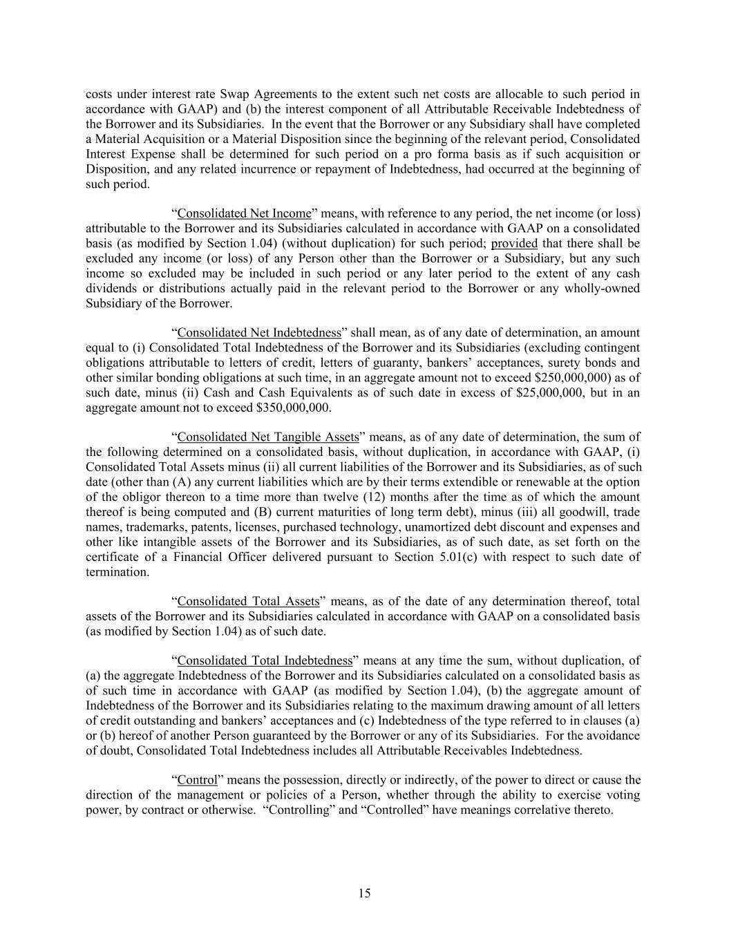 costs under interest rate Swap Agreements to the extent such net costs are allocable to such period in accordance with GAAP) and (b) the interest component of all Attributable Receivable Indebtedness of the Borrower and its Subsidiaries. In the event that the Borrower or any Subsidiary shall have completed a Material Acquisition or a Material Disposition since the beginning of the relevant period, Consolidated Interest Expense shall be determined for such period on a pro forma basis as if such acquisition or Disposition, and any related incurrence or repayment of Indebtedness, had occurred at the beginning of such period. “Consolidated Net Income” means, with reference to any period, the net income (or loss) attributable to the Borrower and its Subsidiaries calculated in accordance with GAAP on a consolidated basis (as modified by Section 1.04) (without duplication) for such period; provided that there shall be excluded any income (or loss) of any Person other than the Borrower or a Subsidiary, but any such income so excluded may be included in such period or any later period to the extent of any cash dividends or distributions actually paid in the relevant period to the Borrower or any wholly-owned Subsidiary of the Borrower. “Consolidated Net Indebtedness” shall mean, as of any date of determination, an amount equal to (i) Consolidated Total Indebtedness of the Borrower and its Subsidiaries (excluding contingent obligations attributable to letters of credit, letters of guaranty, bankers’ acceptances, surety bonds and other similar bonding obligations at such time, in an aggregate amount not to exceed $250,000,000) as of such date, minus (ii) Cash and Cash Equivalents as of such date in excess of $25,000,000, but in an aggregate amount not to exceed $350,000,000. “Consolidated Net Tangible Assets” means, as of any date of determination, the sum of the following determined on a consolidated basis, without duplication, in accordance with GAAP, (i) Consolidated Total Assets minus (ii) all current liabilities of the Borrower and its Subsidiaries, as of such date (other than (A) any current liabilities which are by their terms extendible or renewable at the option of the obligor thereon to a time more than twelve (12) months after the time as of which the amount thereof is being computed and (B) current maturities of long term debt), minus (iii) all goodwill, trade names, trademarks, patents, licenses, purchased technology, unamortized debt discount and expenses and other like intangible assets of the Borrower and its Subsidiaries, as of such date, as set forth on the certificate of a Financial Officer delivered pursuant to Section 5.01(c) with respect to such date of termination. “Consolidated Total Assets” means, as of the date of any determination thereof, total assets of the Borrower and its Subsidiaries calculated in accordance with GAAP on a consolidated basis (as modified by Section 1.04) as of such date. “Consolidated Total Indebtedness” means at any time the sum, without duplication, of (a) the aggregate Indebtedness of the Borrower and its Subsidiaries calculated on a consolidated basis as of such time in accordance with GAAP (as modified by Section 1.04), (b) the aggregate amount of Indebtedness of the Borrower and its Subsidiaries relating to the maximum drawing amount of all letters of credit outstanding and bankers’ acceptances and (c) Indebtedness of the type referred to in clauses (a) or (b) hereof of another Person guaranteed by the Borrower or any of its Subsidiaries. For the avoidance of doubt, Consolidated Total Indebtedness includes all Attributable Receivables Indebtedness. “Control” means the possession, directly or indirectly, of the power to direct or cause the direction of the management or policies of a Person, whether through the ability to exercise voting power, by contract or otherwise. “Controlling” and “Controlled” have meanings correlative thereto. 15