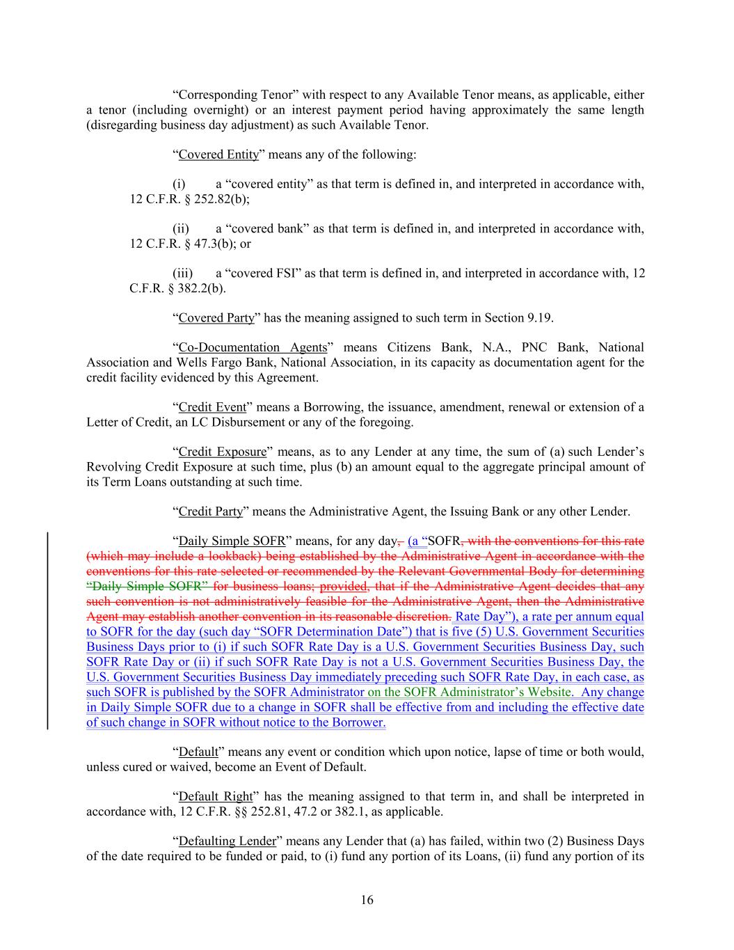“Corresponding Tenor” with respect to any Available Tenor means, as applicable, either a tenor (including overnight) or an interest payment period having approximately the same length (disregarding business day adjustment) as such Available Tenor. “Covered Entity” means any of the following: (i) a “covered entity” as that term is defined in, and interpreted in accordance with, 12 C.F.R. § 252.82(b); (ii) a “covered bank” as that term is defined in, and interpreted in accordance with, 12 C.F.R. § 47.3(b); or (iii) a “covered FSI” as that term is defined in, and interpreted in accordance with, 12 C.F.R. § 382.2(b). “Covered Party” has the meaning assigned to such term in Section 9.19. “Co-Documentation Agents” means Citizens Bank, N.A., PNC Bank, National Association and Wells Fargo Bank, National Association, in its capacity as documentation agent for the credit facility evidenced by this Agreement. “Credit Event” means a Borrowing, the issuance, amendment, renewal or extension of a Letter of Credit, an LC Disbursement or any of the foregoing. “Credit Exposure” means, as to any Lender at any time, the sum of (a) such Lender’s Revolving Credit Exposure at such time, plus (b) an amount equal to the aggregate principal amount of its Term Loans outstanding at such time. “Credit Party” means the Administrative Agent, the Issuing Bank or any other Lender. “Daily Simple SOFR” means, for any day, (a “SOFR, with the conventions for this rate (which may include a lookback) being established by the Administrative Agent in accordance with the conventions for this rate selected or recommended by the Relevant Governmental Body for determining “Daily Simple SOFR” for business loans; provided, that if the Administrative Agent decides that any such convention is not administratively feasible for the Administrative Agent, then the Administrative Agent may establish another convention in its reasonable discretion. Rate Day”), a rate per annum equal to SOFR for the day (such day “SOFR Determination Date”) that is five (5) U.S. Government Securities Business Days prior to (i) if such SOFR Rate Day is a U.S. Government Securities Business Day, such SOFR Rate Day or (ii) if such SOFR Rate Day is not a U.S. Government Securities Business Day, the U.S. Government Securities Business Day immediately preceding such SOFR Rate Day, in each case, as such SOFR is published by the SOFR Administrator on the SOFR Administrator’s Website. Any change in Daily Simple SOFR due to a change in SOFR shall be effective from and including the effective date of such change in SOFR without notice to the Borrower. “Default” means any event or condition which upon notice, lapse of time or both would, unless cured or waived, become an Event of Default. “Default Right” has the meaning assigned to that term in, and shall be interpreted in accordance with, 12 C.F.R. §§ 252.81, 47.2 or 382.1, as applicable. “Defaulting Lender” means any Lender that (a) has failed, within two (2) Business Days of the date required to be funded or paid, to (i) fund any portion of its Loans, (ii) fund any portion of its 16