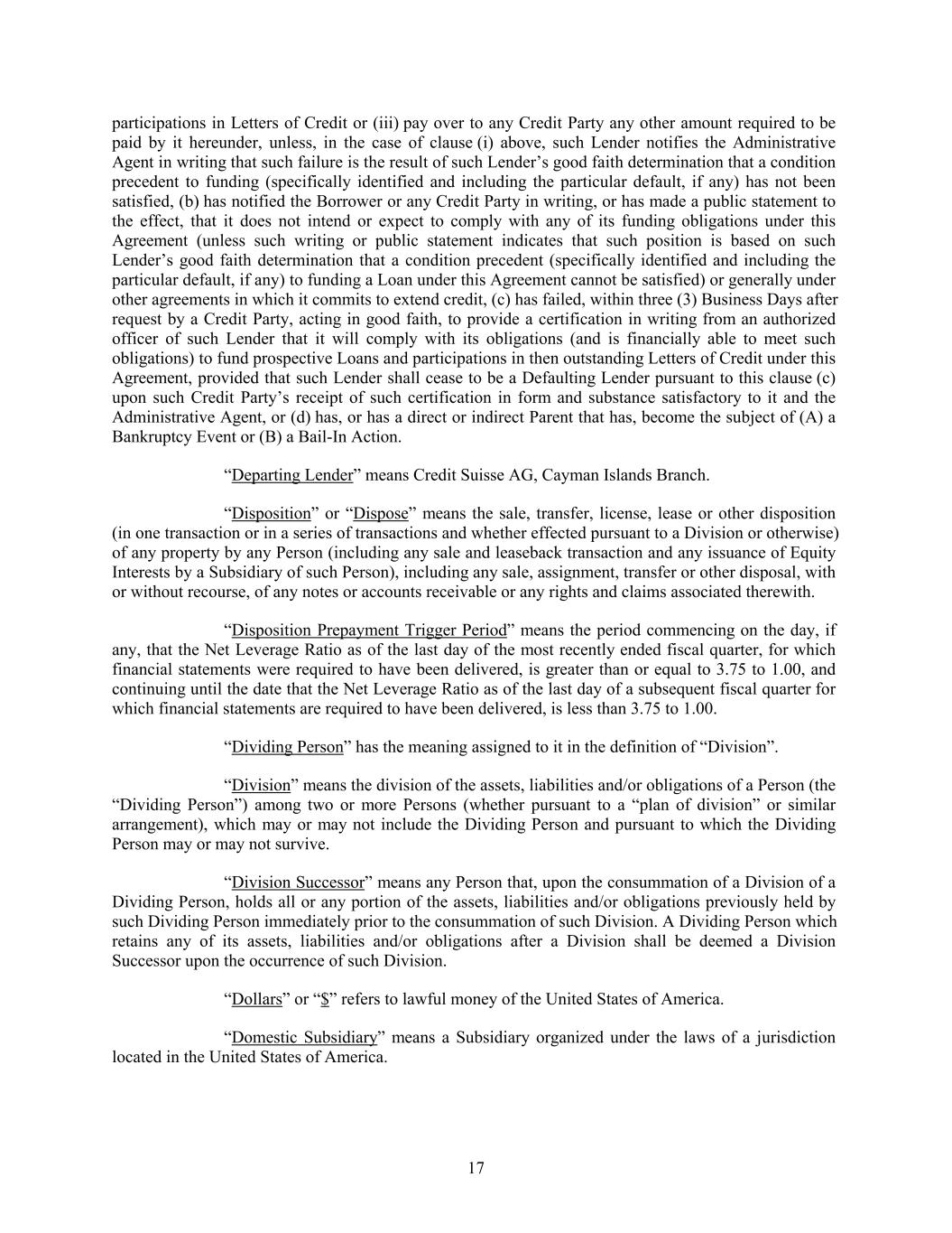 participations in Letters of Credit or (iii) pay over to any Credit Party any other amount required to be paid by it hereunder, unless, in the case of clause (i) above, such Lender notifies the Administrative Agent in writing that such failure is the result of such Lender’s good faith determination that a condition precedent to funding (specifically identified and including the particular default, if any) has not been satisfied, (b) has notified the Borrower or any Credit Party in writing, or has made a public statement to the effect, that it does not intend or expect to comply with any of its funding obligations under this Agreement (unless such writing or public statement indicates that such position is based on such Lender’s good faith determination that a condition precedent (specifically identified and including the particular default, if any) to funding a Loan under this Agreement cannot be satisfied) or generally under other agreements in which it commits to extend credit, (c) has failed, within three (3) Business Days after request by a Credit Party, acting in good faith, to provide a certification in writing from an authorized officer of such Lender that it will comply with its obligations (and is financially able to meet such obligations) to fund prospective Loans and participations in then outstanding Letters of Credit under this Agreement, provided that such Lender shall cease to be a Defaulting Lender pursuant to this clause (c) upon such Credit Party’s receipt of such certification in form and substance satisfactory to it and the Administrative Agent, or (d) has, or has a direct or indirect Parent that has, become the subject of (A) a Bankruptcy Event or (B) a Bail-In Action. “Departing Lender” means Credit Suisse AG, Cayman Islands Branch. “Disposition” or “Dispose” means the sale, transfer, license, lease or other disposition (in one transaction or in a series of transactions and whether effected pursuant to a Division or otherwise) of any property by any Person (including any sale and leaseback transaction and any issuance of Equity Interests by a Subsidiary of such Person), including any sale, assignment, transfer or other disposal, with or without recourse, of any notes or accounts receivable or any rights and claims associated therewith. “Disposition Prepayment Trigger Period” means the period commencing on the day, if any, that the Net Leverage Ratio as of the last day of the most recently ended fiscal quarter, for which financial statements were required to have been delivered, is greater than or equal to 3.75 to 1.00, and continuing until the date that the Net Leverage Ratio as of the last day of a subsequent fiscal quarter for which financial statements are required to have been delivered, is less than 3.75 to 1.00. “Dividing Person” has the meaning assigned to it in the definition of “Division”. “Division” means the division of the assets, liabilities and/or obligations of a Person (the “Dividing Person”) among two or more Persons (whether pursuant to a “plan of division” or similar arrangement), which may or may not include the Dividing Person and pursuant to which the Dividing Person may or may not survive. “Division Successor” means any Person that, upon the consummation of a Division of a Dividing Person, holds all or any portion of the assets, liabilities and/or obligations previously held by such Dividing Person immediately prior to the consummation of such Division. A Dividing Person which retains any of its assets, liabilities and/or obligations after a Division shall be deemed a Division Successor upon the occurrence of such Division. “Dollars” or “$” refers to lawful money of the United States of America. “Domestic Subsidiary” means a Subsidiary organized under the laws of a jurisdiction located in the United States of America. 17