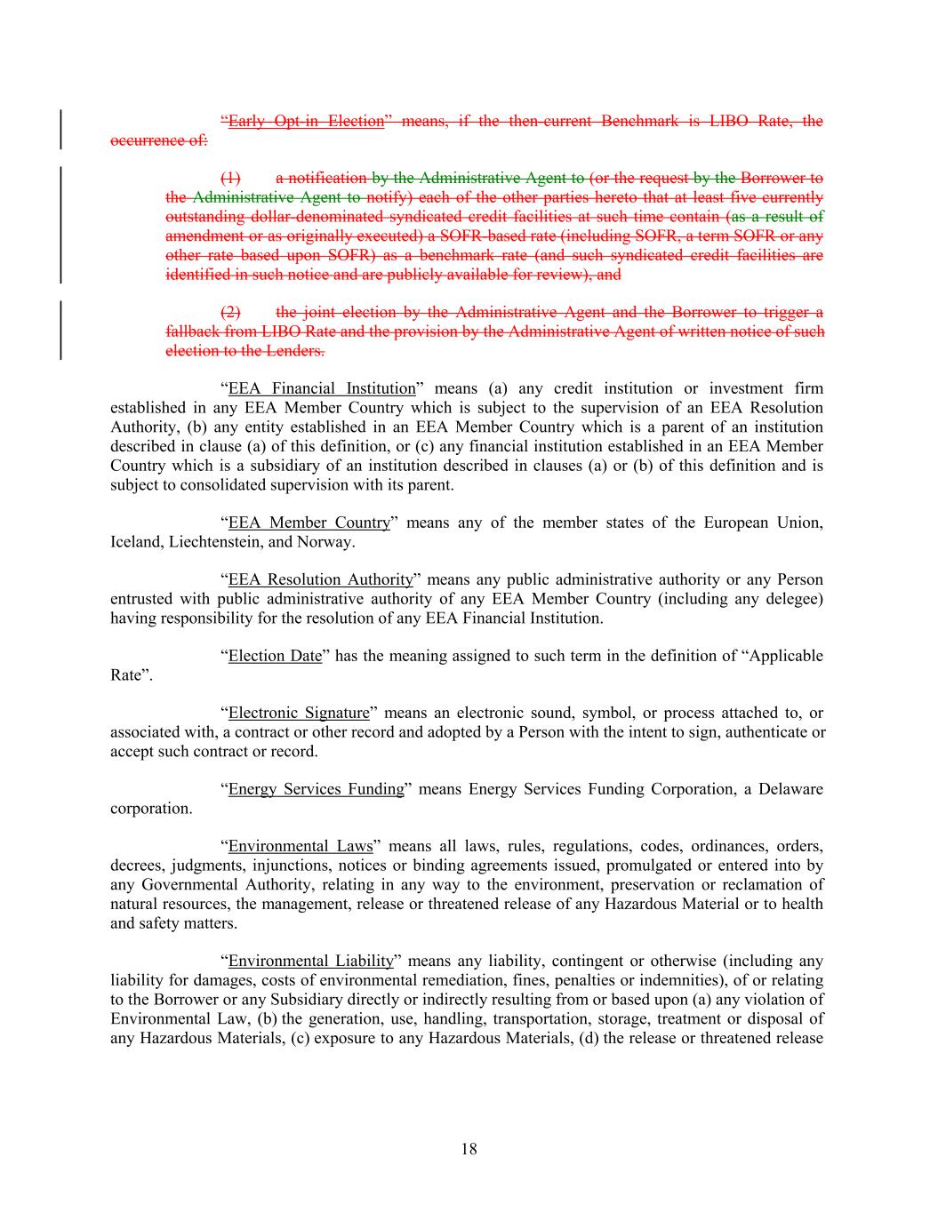 “Early Opt-in Election” means, if the then-current Benchmark is LIBO Rate, the occurrence of: (1) a notification by the Administrative Agent to (or the request by the Borrower to the Administrative Agent to notify) each of the other parties hereto that at least five currently outstanding dollar-denominated syndicated credit facilities at such time contain (as a result of amendment or as originally executed) a SOFR-based rate (including SOFR, a term SOFR or any other rate based upon SOFR) as a benchmark rate (and such syndicated credit facilities are identified in such notice and are publicly available for review), and (2) the joint election by the Administrative Agent and the Borrower to trigger a fallback from LIBO Rate and the provision by the Administrative Agent of written notice of such election to the Lenders. “EEA Financial Institution” means (a) any credit institution or investment firm established in any EEA Member Country which is subject to the supervision of an EEA Resolution Authority, (b) any entity established in an EEA Member Country which is a parent of an institution described in clause (a) of this definition, or (c) any financial institution established in an EEA Member Country which is a subsidiary of an institution described in clauses (a) or (b) of this definition and is subject to consolidated supervision with its parent. “EEA Member Country” means any of the member states of the European Union, Iceland, Liechtenstein, and Norway. “EEA Resolution Authority” means any public administrative authority or any Person entrusted with public administrative authority of any EEA Member Country (including any delegee) having responsibility for the resolution of any EEA Financial Institution. “Election Date” has the meaning assigned to such term in the definition of “Applicable Rate”. “Electronic Signature” means an electronic sound, symbol, or process attached to, or associated with, a contract or other record and adopted by a Person with the intent to sign, authenticate or accept such contract or record. “Energy Services Funding” means Energy Services Funding Corporation, a Delaware corporation. “Environmental Laws” means all laws, rules, regulations, codes, ordinances, orders, decrees, judgments, injunctions, notices or binding agreements issued, promulgated or entered into by any Governmental Authority, relating in any way to the environment, preservation or reclamation of natural resources, the management, release or threatened release of any Hazardous Material or to health and safety matters. “Environmental Liability” means any liability, contingent or otherwise (including any liability for damages, costs of environmental remediation, fines, penalties or indemnities), of or relating to the Borrower or any Subsidiary directly or indirectly resulting from or based upon (a) any violation of Environmental Law, (b) the generation, use, handling, transportation, storage, treatment or disposal of any Hazardous Materials, (c) exposure to any Hazardous Materials, (d) the release or threatened release 18