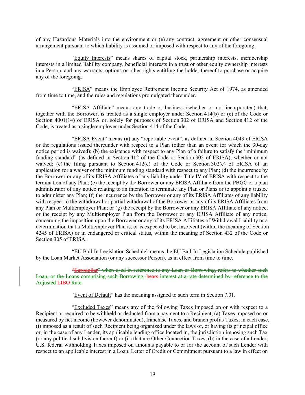 of any Hazardous Materials into the environment or (e) any contract, agreement or other consensual arrangement pursuant to which liability is assumed or imposed with respect to any of the foregoing. “Equity Interests” means shares of capital stock, partnership interests, membership interests in a limited liability company, beneficial interests in a trust or other equity ownership interests in a Person, and any warrants, options or other rights entitling the holder thereof to purchase or acquire any of the foregoing. “ERISA” means the Employee Retirement Income Security Act of 1974, as amended from time to time, and the rules and regulations promulgated thereunder. “ERISA Affiliate” means any trade or business (whether or not incorporated) that, together with the Borrower, is treated as a single employer under Section 414(b) or (c) of the Code or Section 4001(14) of ERISA or, solely for purposes of Section 302 of ERISA and Section 412 of the Code, is treated as a single employer under Section 414 of the Code. “ERISA Event” means (a) any “reportable event”, as defined in Section 4043 of ERISA or the regulations issued thereunder with respect to a Plan (other than an event for which the 30-day notice period is waived); (b) the existence with respect to any Plan of a failure to satisfy the “minimum funding standard” (as defined in Section 412 of the Code or Section 302 of ERISA), whether or not waived; (c) the filing pursuant to Section 412(c) of the Code or Section 302(c) of ERISA of an application for a waiver of the minimum funding standard with respect to any Plan; (d) the incurrence by the Borrower or any of its ERISA Affiliates of any liability under Title IV of ERISA with respect to the termination of any Plan; (e) the receipt by the Borrower or any ERISA Affiliate from the PBGC or a plan administrator of any notice relating to an intention to terminate any Plan or Plans or to appoint a trustee to administer any Plan; (f) the incurrence by the Borrower or any of its ERISA Affiliates of any liability with respect to the withdrawal or partial withdrawal of the Borrower or any of its ERISA Affiliates from any Plan or Multiemployer Plan; or (g) the receipt by the Borrower or any ERISA Affiliate of any notice, or the receipt by any Multiemployer Plan from the Borrower or any ERISA Affiliate of any notice, concerning the imposition upon the Borrower or any of its ERISA Affiliates of Withdrawal Liability or a determination that a Multiemployer Plan is, or is expected to be, insolvent (within the meaning of Section 4245 of ERISA) or in endangered or critical status, within the meaning of Section 432 of the Code or Section 305 of ERISA. “EU Bail-In Legislation Schedule” means the EU Bail-In Legislation Schedule published by the Loan Market Association (or any successor Person), as in effect from time to time. “Eurodollar” when used in reference to any Loan or Borrowing, refers to whether such Loan, or the Loans comprising such Borrowing, bears interest at a rate determined by reference to the Adjusted LIBO Rate. “Event of Default” has the meaning assigned to such term in Section 7.01. “Excluded Taxes” means any of the following Taxes imposed on or with respect to a Recipient or required to be withheld or deducted from a payment to a Recipient, (a) Taxes imposed on or measured by net income (however denominated), franchise Taxes, and branch profits Taxes, in each case, (i) imposed as a result of such Recipient being organized under the laws of, or having its principal office or, in the case of any Lender, its applicable lending office located in, the jurisdiction imposing such Tax (or any political subdivision thereof) or (ii) that are Other Connection Taxes, (b) in the case of a Lender, U.S. federal withholding Taxes imposed on amounts payable to or for the account of such Lender with respect to an applicable interest in a Loan, Letter of Credit or Commitment pursuant to a law in effect on 19