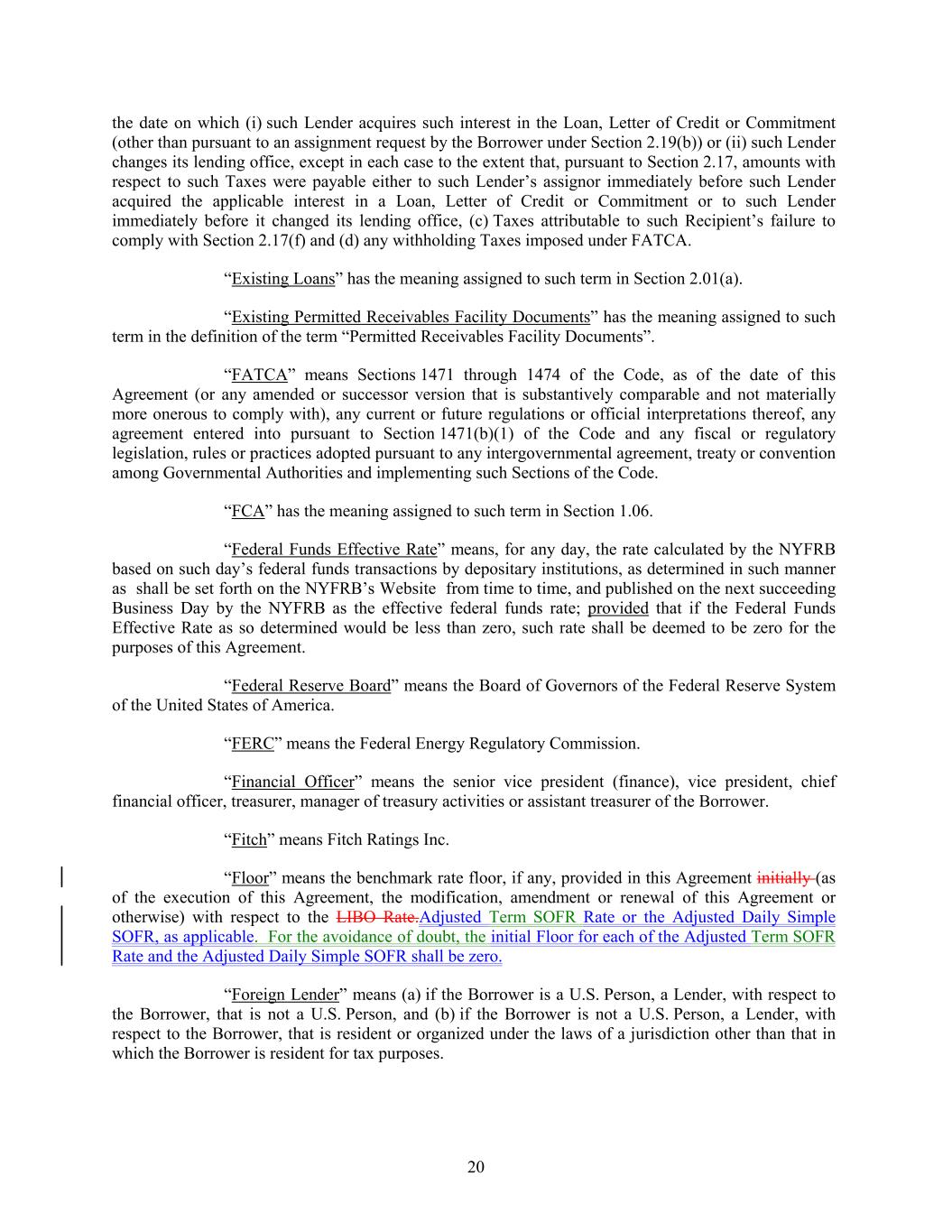 the date on which (i) such Lender acquires such interest in the Loan, Letter of Credit or Commitment (other than pursuant to an assignment request by the Borrower under Section 2.19(b)) or (ii) such Lender changes its lending office, except in each case to the extent that, pursuant to Section 2.17, amounts with respect to such Taxes were payable either to such Lender’s assignor immediately before such Lender acquired the applicable interest in a Loan, Letter of Credit or Commitment or to such Lender immediately before it changed its lending office, (c) Taxes attributable to such Recipient’s failure to comply with Section 2.17(f) and (d) any withholding Taxes imposed under FATCA. “Existing Loans” has the meaning assigned to such term in Section 2.01(a). “Existing Permitted Receivables Facility Documents” has the meaning assigned to such term in the definition of the term “Permitted Receivables Facility Documents”. “FATCA” means Sections 1471 through 1474 of the Code, as of the date of this Agreement (or any amended or successor version that is substantively comparable and not materially more onerous to comply with), any current or future regulations or official interpretations thereof, any agreement entered into pursuant to Section 1471(b)(1) of the Code and any fiscal or regulatory legislation, rules or practices adopted pursuant to any intergovernmental agreement, treaty or convention among Governmental Authorities and implementing such Sections of the Code. “FCA” has the meaning assigned to such term in Section 1.06. “Federal Funds Effective Rate” means, for any day, the rate calculated by the NYFRB based on such day’s federal funds transactions by depositary institutions, as determined in such manner as shall be set forth on the NYFRB’s Website from time to time, and published on the next succeeding Business Day by the NYFRB as the effective federal funds rate; provided that if the Federal Funds Effective Rate as so determined would be less than zero, such rate shall be deemed to be zero for the purposes of this Agreement. “Federal Reserve Board” means the Board of Governors of the Federal Reserve System of the United States of America. “FERC” means the Federal Energy Regulatory Commission. “Financial Officer” means the senior vice president (finance), vice president, chief financial officer, treasurer, manager of treasury activities or assistant treasurer of the Borrower. “Fitch” means Fitch Ratings Inc. “Floor” means the benchmark rate floor, if any, provided in this Agreement initially (as of the execution of this Agreement, the modification, amendment or renewal of this Agreement or otherwise) with respect to the LIBO Rate.Adjusted Term SOFR Rate or the Adjusted Daily Simple SOFR, as applicable. For the avoidance of doubt, the initial Floor for each of the Adjusted Term SOFR Rate and the Adjusted Daily Simple SOFR shall be zero. “Foreign Lender” means (a) if the Borrower is a U.S. Person, a Lender, with respect to the Borrower, that is not a U.S. Person, and (b) if the Borrower is not a U.S. Person, a Lender, with respect to the Borrower, that is resident or organized under the laws of a jurisdiction other than that in which the Borrower is resident for tax purposes. 20