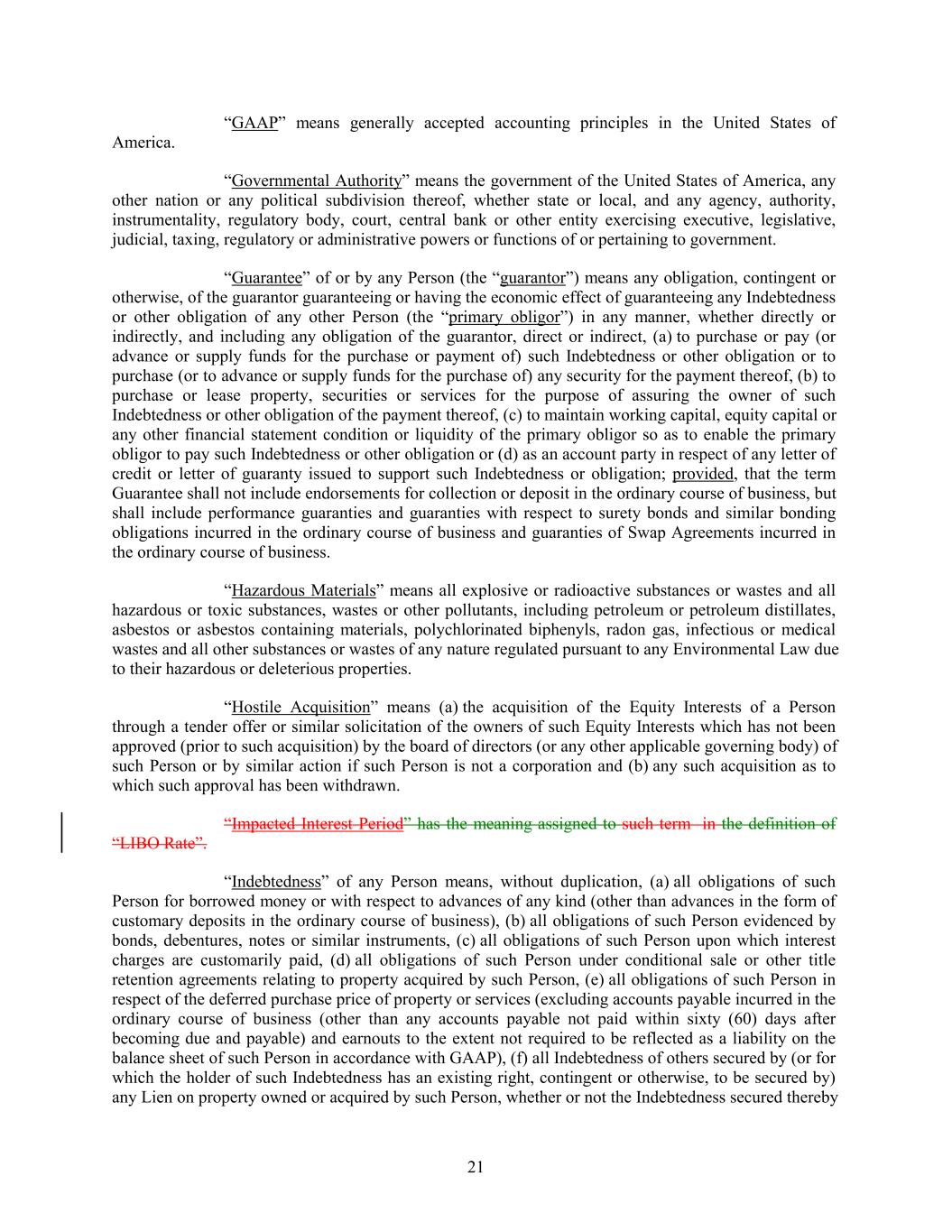 “GAAP” means generally accepted accounting principles in the United States of America. “Governmental Authority” means the government of the United States of America, any other nation or any political subdivision thereof, whether state or local, and any agency, authority, instrumentality, regulatory body, court, central bank or other entity exercising executive, legislative, judicial, taxing, regulatory or administrative powers or functions of or pertaining to government. “Guarantee” of or by any Person (the “guarantor”) means any obligation, contingent or otherwise, of the guarantor guaranteeing or having the economic effect of guaranteeing any Indebtedness or other obligation of any other Person (the “primary obligor”) in any manner, whether directly or indirectly, and including any obligation of the guarantor, direct or indirect, (a) to purchase or pay (or advance or supply funds for the purchase or payment of) such Indebtedness or other obligation or to purchase (or to advance or supply funds for the purchase of) any security for the payment thereof, (b) to purchase or lease property, securities or services for the purpose of assuring the owner of such Indebtedness or other obligation of the payment thereof, (c) to maintain working capital, equity capital or any other financial statement condition or liquidity of the primary obligor so as to enable the primary obligor to pay such Indebtedness or other obligation or (d) as an account party in respect of any letter of credit or letter of guaranty issued to support such Indebtedness or obligation; provided, that the term Guarantee shall not include endorsements for collection or deposit in the ordinary course of business, but shall include performance guaranties and guaranties with respect to surety bonds and similar bonding obligations incurred in the ordinary course of business and guaranties of Swap Agreements incurred in the ordinary course of business. “Hazardous Materials” means all explosive or radioactive substances or wastes and all hazardous or toxic substances, wastes or other pollutants, including petroleum or petroleum distillates, asbestos or asbestos containing materials, polychlorinated biphenyls, radon gas, infectious or medical wastes and all other substances or wastes of any nature regulated pursuant to any Environmental Law due to their hazardous or deleterious properties. “Hostile Acquisition” means (a) the acquisition of the Equity Interests of a Person through a tender offer or similar solicitation of the owners of such Equity Interests which has not been approved (prior to such acquisition) by the board of directors (or any other applicable governing body) of such Person or by similar action if such Person is not a corporation and (b) any such acquisition as to which such approval has been withdrawn. “Impacted Interest Period” has the meaning assigned to such term in the definition of “LIBO Rate”. “Indebtedness” of any Person means, without duplication, (a) all obligations of such Person for borrowed money or with respect to advances of any kind (other than advances in the form of customary deposits in the ordinary course of business), (b) all obligations of such Person evidenced by bonds, debentures, notes or similar instruments, (c) all obligations of such Person upon which interest charges are customarily paid, (d) all obligations of such Person under conditional sale or other title retention agreements relating to property acquired by such Person, (e) all obligations of such Person in respect of the deferred purchase price of property or services (excluding accounts payable incurred in the ordinary course of business (other than any accounts payable not paid within sixty (60) days after becoming due and payable) and earnouts to the extent not required to be reflected as a liability on the balance sheet of such Person in accordance with GAAP), (f) all Indebtedness of others secured by (or for which the holder of such Indebtedness has an existing right, contingent or otherwise, to be secured by) any Lien on property owned or acquired by such Person, whether or not the Indebtedness secured thereby 21