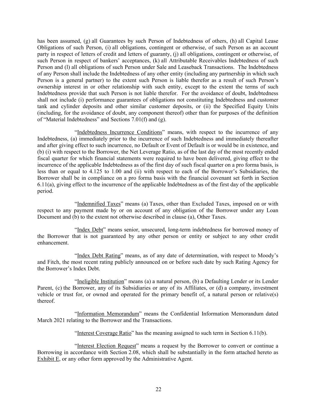 has been assumed, (g) all Guarantees by such Person of Indebtedness of others, (h) all Capital Lease Obligations of such Person, (i) all obligations, contingent or otherwise, of such Person as an account party in respect of letters of credit and letters of guaranty, (j) all obligations, contingent or otherwise, of such Person in respect of bankers’ acceptances, (k) all Attributable Receivables Indebtedness of such Person and (l) all obligations of such Person under Sale and Leaseback Transactions. The Indebtedness of any Person shall include the Indebtedness of any other entity (including any partnership in which such Person is a general partner) to the extent such Person is liable therefor as a result of such Person’s ownership interest in or other relationship with such entity, except to the extent the terms of such Indebtedness provide that such Person is not liable therefor. For the avoidance of doubt, Indebtedness shall not include (i) performance guarantees of obligations not constituting Indebtedness and customer tank and cylinder deposits and other similar customer deposits, or (ii) the Specified Equity Units (including, for the avoidance of doubt, any component thereof) other than for purposes of the definition of “Material Indebtedness” and Sections 7.01(f) and (g). “Indebtedness Incurrence Conditions” means, with respect to the incurrence of any Indebtedness, (a) immediately prior to the incurrence of such Indebtedness and immediately thereafter and after giving effect to such incurrence, no Default or Event of Default is or would be in existence, and (b) (i) with respect to the Borrower, the Net Leverage Ratio, as of the last day of the most recently ended fiscal quarter for which financial statements were required to have been delivered, giving effect to the incurrence of the applicable Indebtedness as of the first day of such fiscal quarter on a pro forma basis, is less than or equal to 4.125 to 1.00 and (ii) with respect to each of the Borrower’s Subsidiaries, the Borrower shall be in compliance on a pro forma basis with the financial covenant set forth in Section 6.11(a), giving effect to the incurrence of the applicable Indebtedness as of the first day of the applicable period. “Indemnified Taxes” means (a) Taxes, other than Excluded Taxes, imposed on or with respect to any payment made by or on account of any obligation of the Borrower under any Loan Document and (b) to the extent not otherwise described in clause (a), Other Taxes. “Index Debt” means senior, unsecured, long-term indebtedness for borrowed money of the Borrower that is not guaranteed by any other person or entity or subject to any other credit enhancement. “Index Debt Rating” means, as of any date of determination, with respect to Moody’s and Fitch, the most recent rating publicly announced on or before such date by such Rating Agency for the Borrower’s Index Debt. “Ineligible Institution” means (a) a natural person, (b) a Defaulting Lender or its Lender Parent, (c) the Borrower, any of its Subsidiaries or any of its Affiliates, or (d) a company, investment vehicle or trust for, or owned and operated for the primary benefit of, a natural person or relative(s) thereof. “Information Memorandum” means the Confidential Information Memorandum dated March 2021 relating to the Borrower and the Transactions. “Interest Coverage Ratio” has the meaning assigned to such term in Section 6.11(b). “Interest Election Request” means a request by the Borrower to convert or continue a Borrowing in accordance with Section 2.08, which shall be substantially in the form attached hereto as Exhibit E, or any other form approved by the Administrative Agent. 22