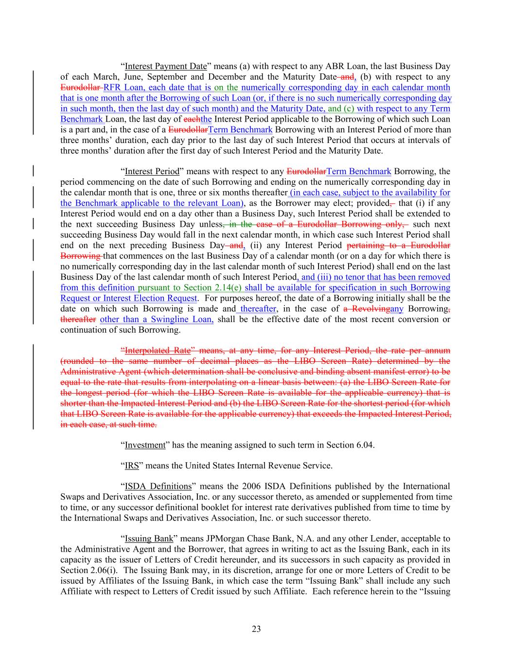 “Interest Payment Date” means (a) with respect to any ABR Loan, the last Business Day of each March, June, September and December and the Maturity Date and, (b) with respect to any Eurodollar RFR Loan, each date that is on the numerically corresponding day in each calendar month that is one month after the Borrowing of such Loan (or, if there is no such numerically corresponding day in such month, then the last day of such month) and the Maturity Date, and (c) with respect to any Term Benchmark Loan, the last day of eachthe Interest Period applicable to the Borrowing of which such Loan is a part and, in the case of a EurodollarTerm Benchmark Borrowing with an Interest Period of more than three months’ duration, each day prior to the last day of such Interest Period that occurs at intervals of three months’ duration after the first day of such Interest Period and the Maturity Date. “Interest Period” means with respect to any EurodollarTerm Benchmark Borrowing, the period commencing on the date of such Borrowing and ending on the numerically corresponding day in the calendar month that is one, three or six months thereafter (in each case, subject to the availability for the Benchmark applicable to the relevant Loan), as the Borrower may elect; provided, that (i) if any Interest Period would end on a day other than a Business Day, such Interest Period shall be extended to the next succeeding Business Day unless, in the case of a Eurodollar Borrowing only, such next succeeding Business Day would fall in the next calendar month, in which case such Interest Period shall end on the next preceding Business Day and, (ii) any Interest Period pertaining to a Eurodollar Borrowing that commences on the last Business Day of a calendar month (or on a day for which there is no numerically corresponding day in the last calendar month of such Interest Period) shall end on the last Business Day of the last calendar month of such Interest Period, and (iii) no tenor that has been removed from this definition pursuant to Section 2.14(e) shall be available for specification in such Borrowing Request or Interest Election Request. For purposes hereof, the date of a Borrowing initially shall be the date on which such Borrowing is made and thereafter, in the case of a Revolvingany Borrowing, thereafter other than a Swingline Loan, shall be the effective date of the most recent conversion or continuation of such Borrowing. “Interpolated Rate” means, at any time, for any Interest Period, the rate per annum (rounded to the same number of decimal places as the LIBO Screen Rate) determined by the Administrative Agent (which determination shall be conclusive and binding absent manifest error) to be equal to the rate that results from interpolating on a linear basis between: (a) the LIBO Screen Rate for the longest period (for which the LIBO Screen Rate is available for the applicable currency) that is shorter than the Impacted Interest Period and (b) the LIBO Screen Rate for the shortest period (for which that LIBO Screen Rate is available for the applicable currency) that exceeds the Impacted Interest Period, in each case, at such time. “Investment” has the meaning assigned to such term in Section 6.04. “IRS” means the United States Internal Revenue Service. “ISDA Definitions” means the 2006 ISDA Definitions published by the International Swaps and Derivatives Association, Inc. or any successor thereto, as amended or supplemented from time to time, or any successor definitional booklet for interest rate derivatives published from time to time by the International Swaps and Derivatives Association, Inc. or such successor thereto. “Issuing Bank” means JPMorgan Chase Bank, N.A. and any other Lender, acceptable to the Administrative Agent and the Borrower, that agrees in writing to act as the Issuing Bank, each in its capacity as the issuer of Letters of Credit hereunder, and its successors in such capacity as provided in Section 2.06(i). The Issuing Bank may, in its discretion, arrange for one or more Letters of Credit to be issued by Affiliates of the Issuing Bank, in which case the term “Issuing Bank” shall include any such Affiliate with respect to Letters of Credit issued by such Affiliate. Each reference herein to the “Issuing 23