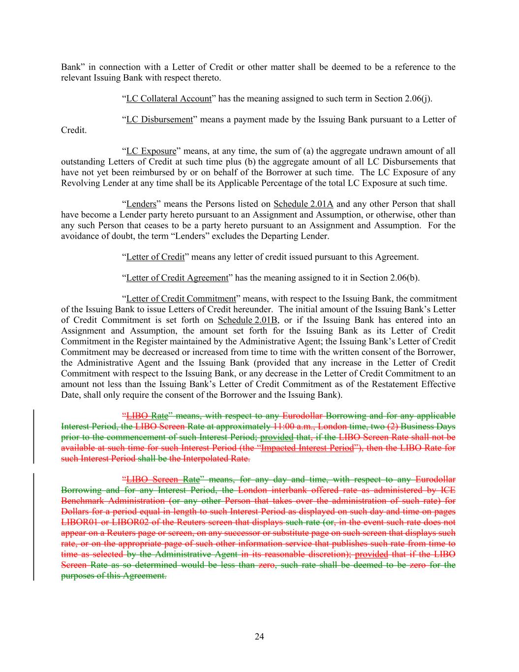 Bank” in connection with a Letter of Credit or other matter shall be deemed to be a reference to the relevant Issuing Bank with respect thereto. “LC Collateral Account” has the meaning assigned to such term in Section 2.06(j). “LC Disbursement” means a payment made by the Issuing Bank pursuant to a Letter of Credit. “LC Exposure” means, at any time, the sum of (a) the aggregate undrawn amount of all outstanding Letters of Credit at such time plus (b) the aggregate amount of all LC Disbursements that have not yet been reimbursed by or on behalf of the Borrower at such time. The LC Exposure of any Revolving Lender at any time shall be its Applicable Percentage of the total LC Exposure at such time. “Lenders” means the Persons listed on Schedule 2.01A and any other Person that shall have become a Lender party hereto pursuant to an Assignment and Assumption, or otherwise, other than any such Person that ceases to be a party hereto pursuant to an Assignment and Assumption. For the avoidance of doubt, the term “Lenders” excludes the Departing Lender. “Letter of Credit” means any letter of credit issued pursuant to this Agreement. “Letter of Credit Agreement” has the meaning assigned to it in Section 2.06(b). “Letter of Credit Commitment” means, with respect to the Issuing Bank, the commitment of the Issuing Bank to issue Letters of Credit hereunder. The initial amount of the Issuing Bank’s Letter of Credit Commitment is set forth on Schedule 2.01B, or if the Issuing Bank has entered into an Assignment and Assumption, the amount set forth for the Issuing Bank as its Letter of Credit Commitment in the Register maintained by the Administrative Agent; the Issuing Bank’s Letter of Credit Commitment may be decreased or increased from time to time with the written consent of the Borrower, the Administrative Agent and the Issuing Bank (provided that any increase in the Letter of Credit Commitment with respect to the Issuing Bank, or any decrease in the Letter of Credit Commitment to an amount not less than the Issuing Bank’s Letter of Credit Commitment as of the Restatement Effective Date, shall only require the consent of the Borrower and the Issuing Bank). “LIBO Rate” means, with respect to any Eurodollar Borrowing and for any applicable Interest Period, the LIBO Screen Rate at approximately 11:00 a.m., London time, two (2) Business Days prior to the commencement of such Interest Period; provided that, if the LIBO Screen Rate shall not be available at such time for such Interest Period (the “Impacted Interest Period”), then the LIBO Rate for such Interest Period shall be the Interpolated Rate. “LIBO Screen Rate” means, for any day and time, with respect to any Eurodollar Borrowing and for any Interest Period, the London interbank offered rate as administered by ICE Benchmark Administration (or any other Person that takes over the administration of such rate) for Dollars for a period equal in length to such Interest Period as displayed on such day and time on pages LIBOR01 or LIBOR02 of the Reuters screen that displays such rate (or, in the event such rate does not appear on a Reuters page or screen, on any successor or substitute page on such screen that displays such rate, or on the appropriate page of such other information service that publishes such rate from time to time as selected by the Administrative Agent in its reasonable discretion); provided that if the LIBO Screen Rate as so determined would be less than zero, such rate shall be deemed to be zero for the purposes of this Agreement. 24