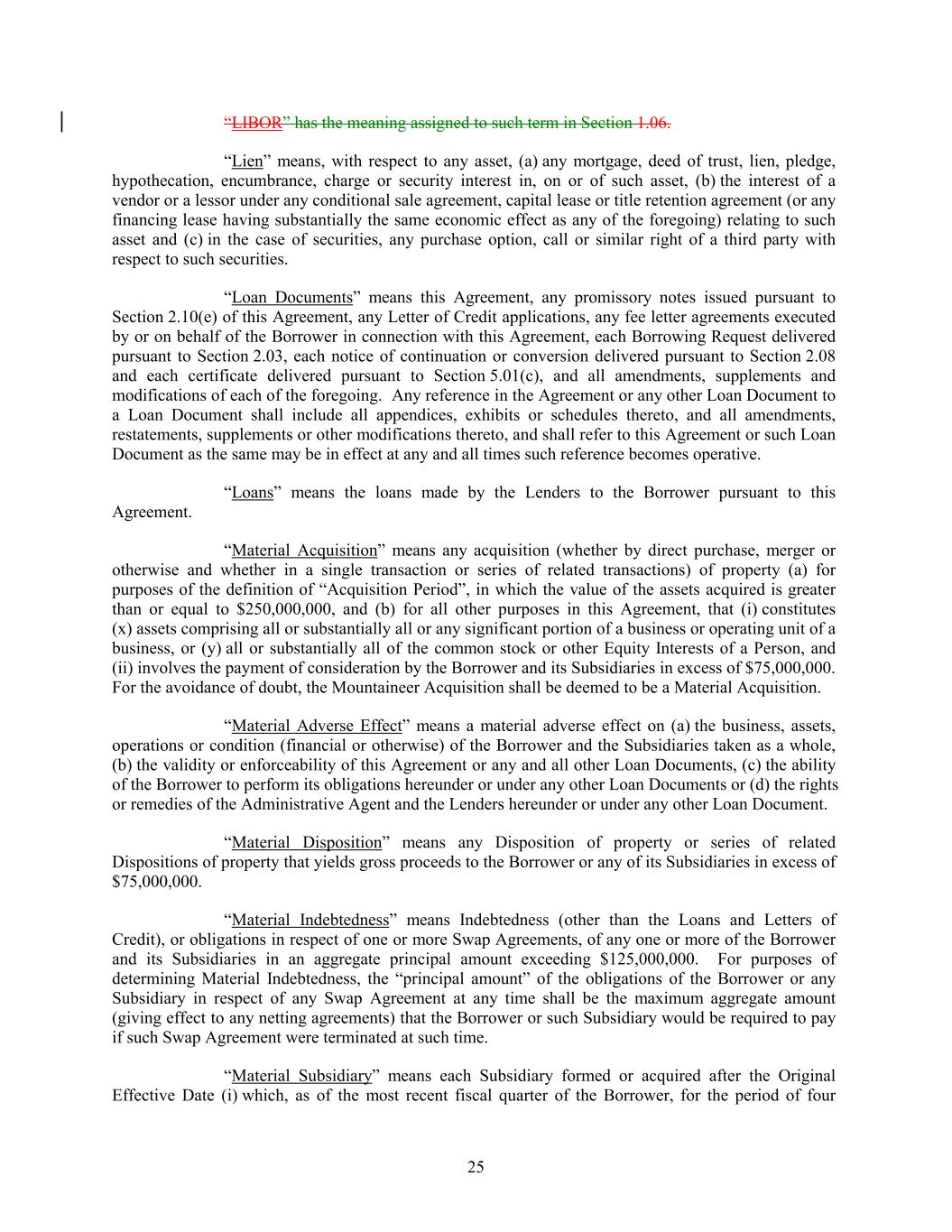 “LIBOR” has the meaning assigned to such term in Section 1.06. “Lien” means, with respect to any asset, (a) any mortgage, deed of trust, lien, pledge, hypothecation, encumbrance, charge or security interest in, on or of such asset, (b) the interest of a vendor or a lessor under any conditional sale agreement, capital lease or title retention agreement (or any financing lease having substantially the same economic effect as any of the foregoing) relating to such asset and (c) in the case of securities, any purchase option, call or similar right of a third party with respect to such securities. “Loan Documents” means this Agreement, any promissory notes issued pursuant to Section 2.10(e) of this Agreement, any Letter of Credit applications, any fee letter agreements executed by or on behalf of the Borrower in connection with this Agreement, each Borrowing Request delivered pursuant to Section 2.03, each notice of continuation or conversion delivered pursuant to Section 2.08 and each certificate delivered pursuant to Section 5.01(c), and all amendments, supplements and modifications of each of the foregoing. Any reference in the Agreement or any other Loan Document to a Loan Document shall include all appendices, exhibits or schedules thereto, and all amendments, restatements, supplements or other modifications thereto, and shall refer to this Agreement or such Loan Document as the same may be in effect at any and all times such reference becomes operative. “Loans” means the loans made by the Lenders to the Borrower pursuant to this Agreement. “Material Acquisition” means any acquisition (whether by direct purchase, merger or otherwise and whether in a single transaction or series of related transactions) of property (a) for purposes of the definition of “Acquisition Period”, in which the value of the assets acquired is greater than or equal to $250,000,000, and (b) for all other purposes in this Agreement, that (i) constitutes (x) assets comprising all or substantially all or any significant portion of a business or operating unit of a business, or (y) all or substantially all of the common stock or other Equity Interests of a Person, and (ii) involves the payment of consideration by the Borrower and its Subsidiaries in excess of $75,000,000. For the avoidance of doubt, the Mountaineer Acquisition shall be deemed to be a Material Acquisition. “Material Adverse Effect” means a material adverse effect on (a) the business, assets, operations or condition (financial or otherwise) of the Borrower and the Subsidiaries taken as a whole, (b) the validity or enforceability of this Agreement or any and all other Loan Documents, (c) the ability of the Borrower to perform its obligations hereunder or under any other Loan Documents or (d) the rights or remedies of the Administrative Agent and the Lenders hereunder or under any other Loan Document. “Material Disposition” means any Disposition of property or series of related Dispositions of property that yields gross proceeds to the Borrower or any of its Subsidiaries in excess of $75,000,000. “Material Indebtedness” means Indebtedness (other than the Loans and Letters of Credit), or obligations in respect of one or more Swap Agreements, of any one or more of the Borrower and its Subsidiaries in an aggregate principal amount exceeding $125,000,000. For purposes of determining Material Indebtedness, the “principal amount” of the obligations of the Borrower or any Subsidiary in respect of any Swap Agreement at any time shall be the maximum aggregate amount (giving effect to any netting agreements) that the Borrower or such Subsidiary would be required to pay if such Swap Agreement were terminated at such time. “Material Subsidiary” means each Subsidiary formed or acquired after the Original Effective Date (i) which, as of the most recent fiscal quarter of the Borrower, for the period of four 25