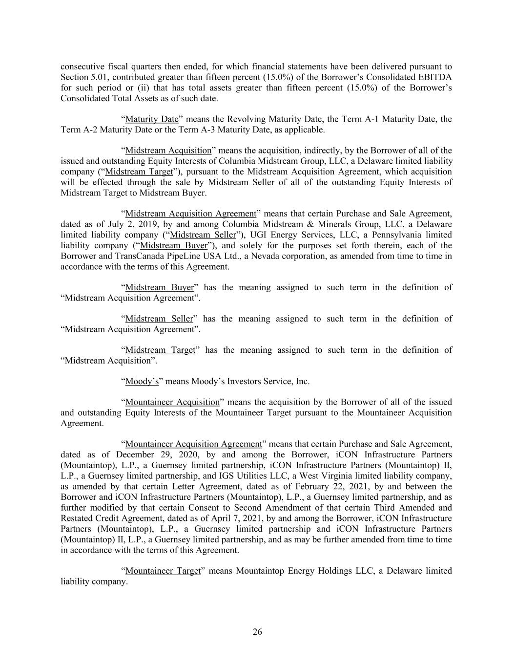 consecutive fiscal quarters then ended, for which financial statements have been delivered pursuant to Section 5.01, contributed greater than fifteen percent (15.0%) of the Borrower’s Consolidated EBITDA for such period or (ii) that has total assets greater than fifteen percent (15.0%) of the Borrower’s Consolidated Total Assets as of such date. “Maturity Date” means the Revolving Maturity Date, the Term A-1 Maturity Date, the Term A-2 Maturity Date or the Term A-3 Maturity Date, as applicable. “Midstream Acquisition” means the acquisition, indirectly, by the Borrower of all of the issued and outstanding Equity Interests of Columbia Midstream Group, LLC, a Delaware limited liability company (“Midstream Target”), pursuant to the Midstream Acquisition Agreement, which acquisition will be effected through the sale by Midstream Seller of all of the outstanding Equity Interests of Midstream Target to Midstream Buyer. “Midstream Acquisition Agreement” means that certain Purchase and Sale Agreement, dated as of July 2, 2019, by and among Columbia Midstream & Minerals Group, LLC, a Delaware limited liability company (“Midstream Seller”), UGI Energy Services, LLC, a Pennsylvania limited liability company (“Midstream Buyer”), and solely for the purposes set forth therein, each of the Borrower and TransCanada PipeLine USA Ltd., a Nevada corporation, as amended from time to time in accordance with the terms of this Agreement. “Midstream Buyer” has the meaning assigned to such term in the definition of “Midstream Acquisition Agreement”. “Midstream Seller” has the meaning assigned to such term in the definition of “Midstream Acquisition Agreement”. “Midstream Target” has the meaning assigned to such term in the definition of “Midstream Acquisition”. “Moody’s” means Moody’s Investors Service, Inc. “Mountaineer Acquisition” means the acquisition by the Borrower of all of the issued and outstanding Equity Interests of the Mountaineer Target pursuant to the Mountaineer Acquisition Agreement. “Mountaineer Acquisition Agreement” means that certain Purchase and Sale Agreement, dated as of December 29, 2020, by and among the Borrower, iCON Infrastructure Partners (Mountaintop), L.P., a Guernsey limited partnership, iCON Infrastructure Partners (Mountaintop) II, L.P., a Guernsey limited partnership, and IGS Utilities LLC, a West Virginia limited liability company, as amended by that certain Letter Agreement, dated as of February 22, 2021, by and between the Borrower and iCON Infrastructure Partners (Mountaintop), L.P., a Guernsey limited partnership, and as further modified by that certain Consent to Second Amendment of that certain Third Amended and Restated Credit Agreement, dated as of April 7, 2021, by and among the Borrower, iCON Infrastructure Partners (Mountaintop), L.P., a Guernsey limited partnership and iCON Infrastructure Partners (Mountaintop) II, L.P., a Guernsey limited partnership, and as may be further amended from time to time in accordance with the terms of this Agreement. “Mountaineer Target” means Mountaintop Energy Holdings LLC, a Delaware limited liability company. 26