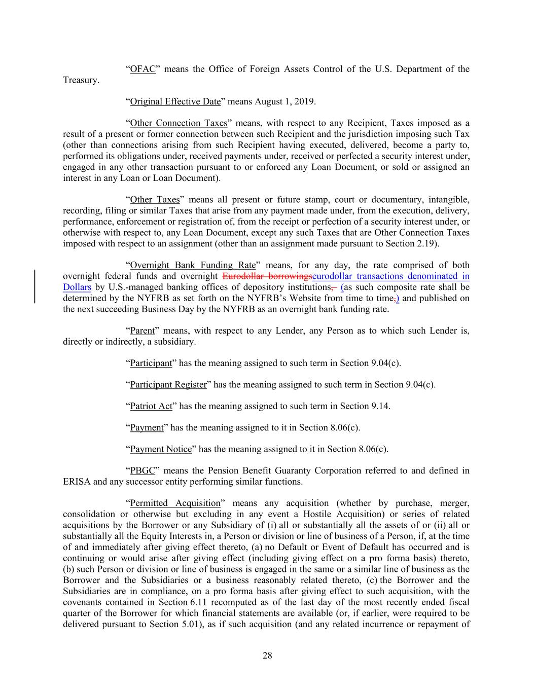 “OFAC” means the Office of Foreign Assets Control of the U.S. Department of the Treasury. “Original Effective Date” means August 1, 2019. “Other Connection Taxes” means, with respect to any Recipient, Taxes imposed as a result of a present or former connection between such Recipient and the jurisdiction imposing such Tax (other than connections arising from such Recipient having executed, delivered, become a party to, performed its obligations under, received payments under, received or perfected a security interest under, engaged in any other transaction pursuant to or enforced any Loan Document, or sold or assigned an interest in any Loan or Loan Document). “Other Taxes” means all present or future stamp, court or documentary, intangible, recording, filing or similar Taxes that arise from any payment made under, from the execution, delivery, performance, enforcement or registration of, from the receipt or perfection of a security interest under, or otherwise with respect to, any Loan Document, except any such Taxes that are Other Connection Taxes imposed with respect to an assignment (other than an assignment made pursuant to Section 2.19). “Overnight Bank Funding Rate” means, for any day, the rate comprised of both overnight federal funds and overnight Eurodollar borrowingseurodollar transactions denominated in Dollars by U.S.-managed banking offices of depository institutions, (as such composite rate shall be determined by the NYFRB as set forth on the NYFRB’s Website from time to time,) and published on the next succeeding Business Day by the NYFRB as an overnight bank funding rate. “Parent” means, with respect to any Lender, any Person as to which such Lender is, directly or indirectly, a subsidiary. “Participant” has the meaning assigned to such term in Section 9.04(c). “Participant Register” has the meaning assigned to such term in Section 9.04(c). “Patriot Act” has the meaning assigned to such term in Section 9.14. “Payment” has the meaning assigned to it in Section 8.06(c). “Payment Notice” has the meaning assigned to it in Section 8.06(c). “PBGC” means the Pension Benefit Guaranty Corporation referred to and defined in ERISA and any successor entity performing similar functions. “Permitted Acquisition” means any acquisition (whether by purchase, merger, consolidation or otherwise but excluding in any event a Hostile Acquisition) or series of related acquisitions by the Borrower or any Subsidiary of (i) all or substantially all the assets of or (ii) all or substantially all the Equity Interests in, a Person or division or line of business of a Person, if, at the time of and immediately after giving effect thereto, (a) no Default or Event of Default has occurred and is continuing or would arise after giving effect (including giving effect on a pro forma basis) thereto, (b) such Person or division or line of business is engaged in the same or a similar line of business as the Borrower and the Subsidiaries or a business reasonably related thereto, (c) the Borrower and the Subsidiaries are in compliance, on a pro forma basis after giving effect to such acquisition, with the covenants contained in Section 6.11 recomputed as of the last day of the most recently ended fiscal quarter of the Borrower for which financial statements are available (or, if earlier, were required to be delivered pursuant to Section 5.01), as if such acquisition (and any related incurrence or repayment of 28