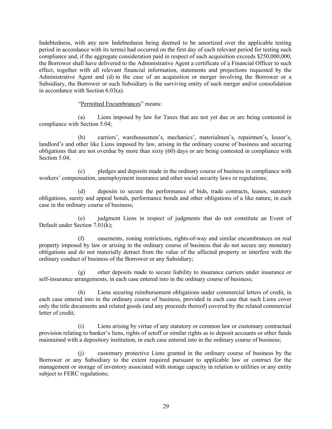 Indebtedness, with any new Indebtedness being deemed to be amortized over the applicable testing period in accordance with its terms) had occurred on the first day of each relevant period for testing such compliance and, if the aggregate consideration paid in respect of such acquisition exceeds $250,000,000, the Borrower shall have delivered to the Administrative Agent a certificate of a Financial Officer to such effect, together with all relevant financial information, statements and projections requested by the Administrative Agent and (d) in the case of an acquisition or merger involving the Borrower or a Subsidiary, the Borrower or such Subsidiary is the surviving entity of such merger and/or consolidation in accordance with Section 6.03(a). “Permitted Encumbrances” means: (a) Liens imposed by law for Taxes that are not yet due or are being contested in compliance with Section 5.04; (b) carriers’, warehousemen’s, mechanics’, materialmen’s, repairmen’s, lessor’s, landlord’s and other like Liens imposed by law, arising in the ordinary course of business and securing obligations that are not overdue by more than sixty (60) days or are being contested in compliance with Section 5.04; (c) pledges and deposits made in the ordinary course of business in compliance with workers’ compensation, unemployment insurance and other social security laws or regulations; (d) deposits to secure the performance of bids, trade contracts, leases, statutory obligations, surety and appeal bonds, performance bonds and other obligations of a like nature, in each case in the ordinary course of business; (e) judgment Liens in respect of judgments that do not constitute an Event of Default under Section 7.01(k); (f) easements, zoning restrictions, rights-of-way and similar encumbrances on real property imposed by law or arising in the ordinary course of business that do not secure any monetary obligations and do not materially detract from the value of the affected property or interfere with the ordinary conduct of business of the Borrower or any Subsidiary; (g) other deposits made to secure liability to insurance carriers under insurance or self-insurance arrangements, in each case entered into in the ordinary course of business; (h) Liens securing reimbursement obligations under commercial letters of credit, in each case entered into in the ordinary course of business, provided in each case that such Liens cover only the title documents and related goods (and any proceeds thereof) covered by the related commercial letter of credit; (i) Liens arising by virtue of any statutory or common law or customary contractual provision relating to banker’s liens, rights of setoff or similar rights as to deposit accounts or other funds maintained with a depository institution, in each case entered into in the ordinary course of business; (j) customary protective Liens granted in the ordinary course of business by the Borrower or any Subsidiary to the extent required pursuant to applicable law or contract for the management or storage of inventory associated with storage capacity in relation to utilities or any entity subject to FERC regulations; 29