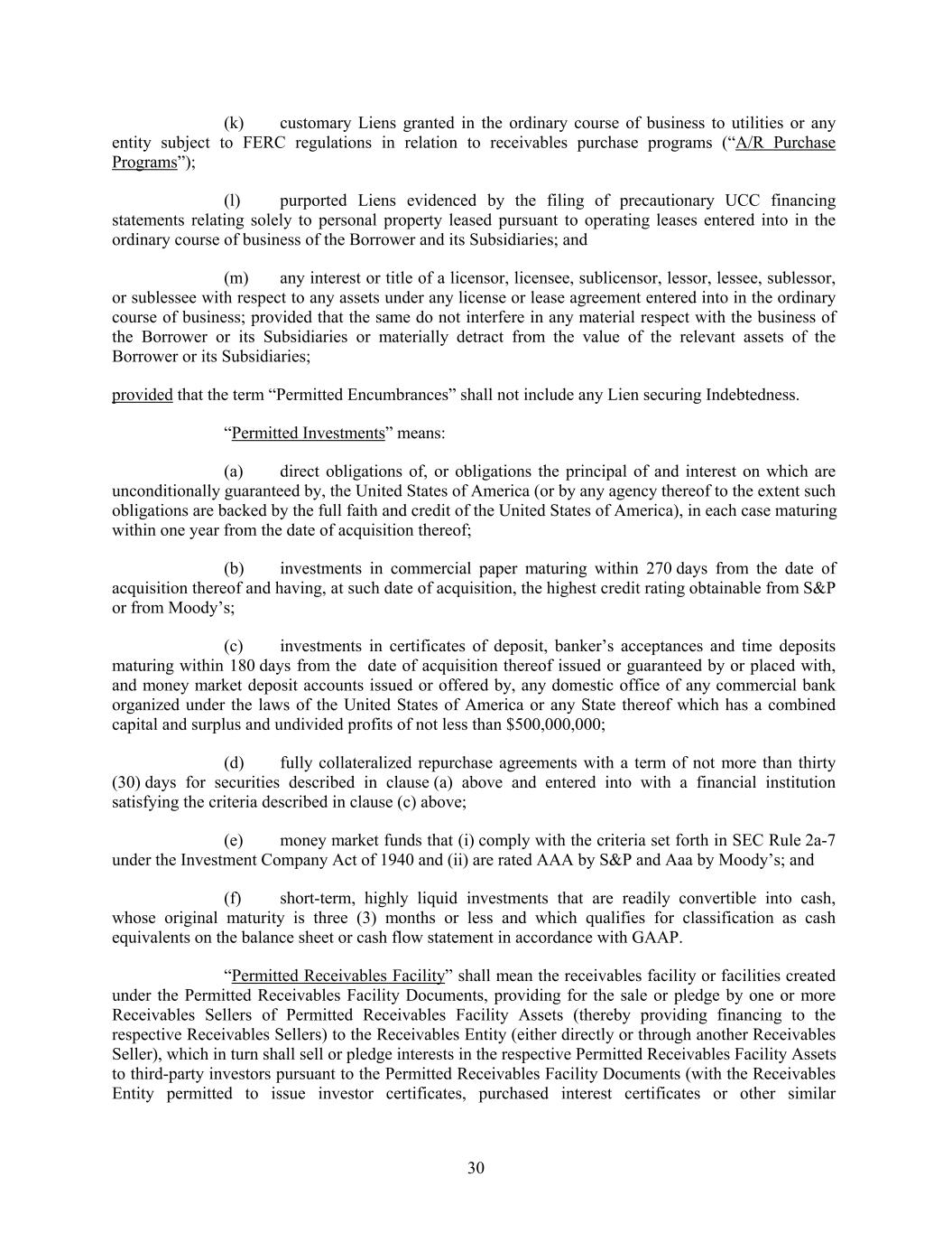 (k) customary Liens granted in the ordinary course of business to utilities or any entity subject to FERC regulations in relation to receivables purchase programs (“A/R Purchase Programs”); (l) purported Liens evidenced by the filing of precautionary UCC financing statements relating solely to personal property leased pursuant to operating leases entered into in the ordinary course of business of the Borrower and its Subsidiaries; and (m) any interest or title of a licensor, licensee, sublicensor, lessor, lessee, sublessor, or sublessee with respect to any assets under any license or lease agreement entered into in the ordinary course of business; provided that the same do not interfere in any material respect with the business of the Borrower or its Subsidiaries or materially detract from the value of the relevant assets of the Borrower or its Subsidiaries; provided that the term “Permitted Encumbrances” shall not include any Lien securing Indebtedness. “Permitted Investments” means: (a) direct obligations of, or obligations the principal of and interest on which are unconditionally guaranteed by, the United States of America (or by any agency thereof to the extent such obligations are backed by the full faith and credit of the United States of America), in each case maturing within one year from the date of acquisition thereof; (b) investments in commercial paper maturing within 270 days from the date of acquisition thereof and having, at such date of acquisition, the highest credit rating obtainable from S&P or from Moody’s; (c) investments in certificates of deposit, banker’s acceptances and time deposits maturing within 180 days from the date of acquisition thereof issued or guaranteed by or placed with, and money market deposit accounts issued or offered by, any domestic office of any commercial bank organized under the laws of the United States of America or any State thereof which has a combined capital and surplus and undivided profits of not less than $500,000,000; (d) fully collateralized repurchase agreements with a term of not more than thirty (30) days for securities described in clause (a) above and entered into with a financial institution satisfying the criteria described in clause (c) above; (e) money market funds that (i) comply with the criteria set forth in SEC Rule 2a-7 under the Investment Company Act of 1940 and (ii) are rated AAA by S&P and Aaa by Moody’s; and (f) short-term, highly liquid investments that are readily convertible into cash, whose original maturity is three (3) months or less and which qualifies for classification as cash equivalents on the balance sheet or cash flow statement in accordance with GAAP. “Permitted Receivables Facility” shall mean the receivables facility or facilities created under the Permitted Receivables Facility Documents, providing for the sale or pledge by one or more Receivables Sellers of Permitted Receivables Facility Assets (thereby providing financing to the respective Receivables Sellers) to the Receivables Entity (either directly or through another Receivables Seller), which in turn shall sell or pledge interests in the respective Permitted Receivables Facility Assets to third-party investors pursuant to the Permitted Receivables Facility Documents (with the Receivables Entity permitted to issue investor certificates, purchased interest certificates or other similar 30