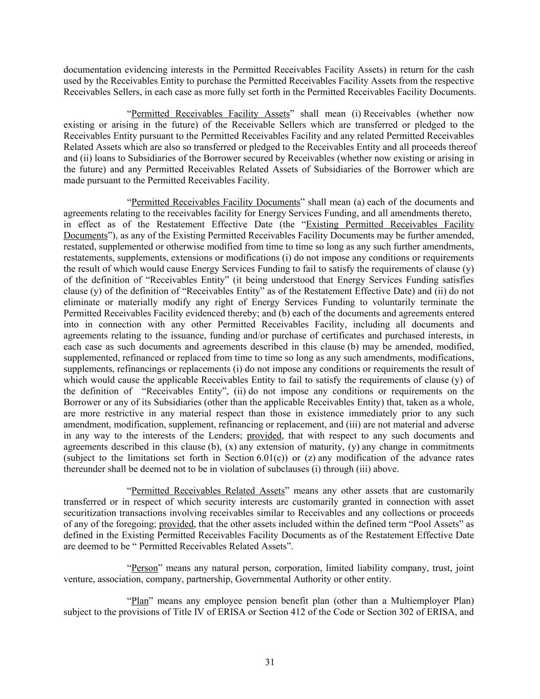 documentation evidencing interests in the Permitted Receivables Facility Assets) in return for the cash used by the Receivables Entity to purchase the Permitted Receivables Facility Assets from the respective Receivables Sellers, in each case as more fully set forth in the Permitted Receivables Facility Documents. “Permitted Receivables Facility Assets” shall mean (i) Receivables (whether now existing or arising in the future) of the Receivable Sellers which are transferred or pledged to the Receivables Entity pursuant to the Permitted Receivables Facility and any related Permitted Receivables Related Assets which are also so transferred or pledged to the Receivables Entity and all proceeds thereof and (ii) loans to Subsidiaries of the Borrower secured by Receivables (whether now existing or arising in the future) and any Permitted Receivables Related Assets of Subsidiaries of the Borrower which are made pursuant to the Permitted Receivables Facility. “Permitted Receivables Facility Documents” shall mean (a) each of the documents and agreements relating to the receivables facility for Energy Services Funding, and all amendments thereto, in effect as of the Restatement Effective Date (the “Existing Permitted Receivables Facility Documents”), as any of the Existing Permitted Receivables Facility Documents may be further amended, restated, supplemented or otherwise modified from time to time so long as any such further amendments, restatements, supplements, extensions or modifications (i) do not impose any conditions or requirements the result of which would cause Energy Services Funding to fail to satisfy the requirements of clause (y) of the definition of “Receivables Entity” (it being understood that Energy Services Funding satisfies clause (y) of the definition of “Receivables Entity” as of the Restatement Effective Date) and (ii) do not eliminate or materially modify any right of Energy Services Funding to voluntarily terminate the Permitted Receivables Facility evidenced thereby; and (b) each of the documents and agreements entered into in connection with any other Permitted Receivables Facility, including all documents and agreements relating to the issuance, funding and/or purchase of certificates and purchased interests, in each case as such documents and agreements described in this clause (b) may be amended, modified, supplemented, refinanced or replaced from time to time so long as any such amendments, modifications, supplements, refinancings or replacements (i) do not impose any conditions or requirements the result of which would cause the applicable Receivables Entity to fail to satisfy the requirements of clause (y) of the definition of “Receivables Entity”, (ii) do not impose any conditions or requirements on the Borrower or any of its Subsidiaries (other than the applicable Receivables Entity) that, taken as a whole, are more restrictive in any material respect than those in existence immediately prior to any such amendment, modification, supplement, refinancing or replacement, and (iii) are not material and adverse in any way to the interests of the Lenders; provided, that with respect to any such documents and agreements described in this clause (b), (x) any extension of maturity, (y) any change in commitments (subject to the limitations set forth in Section 6.01(c)) or (z) any modification of the advance rates thereunder shall be deemed not to be in violation of subclauses (i) through (iii) above. “Permitted Receivables Related Assets” means any other assets that are customarily transferred or in respect of which security interests are customarily granted in connection with asset securitization transactions involving receivables similar to Receivables and any collections or proceeds of any of the foregoing; provided, that the other assets included within the defined term “Pool Assets” as defined in the Existing Permitted Receivables Facility Documents as of the Restatement Effective Date are deemed to be “ Permitted Receivables Related Assets”. “Person” means any natural person, corporation, limited liability company, trust, joint venture, association, company, partnership, Governmental Authority or other entity. “Plan” means any employee pension benefit plan (other than a Multiemployer Plan) subject to the provisions of Title IV of ERISA or Section 412 of the Code or Section 302 of ERISA, and 31