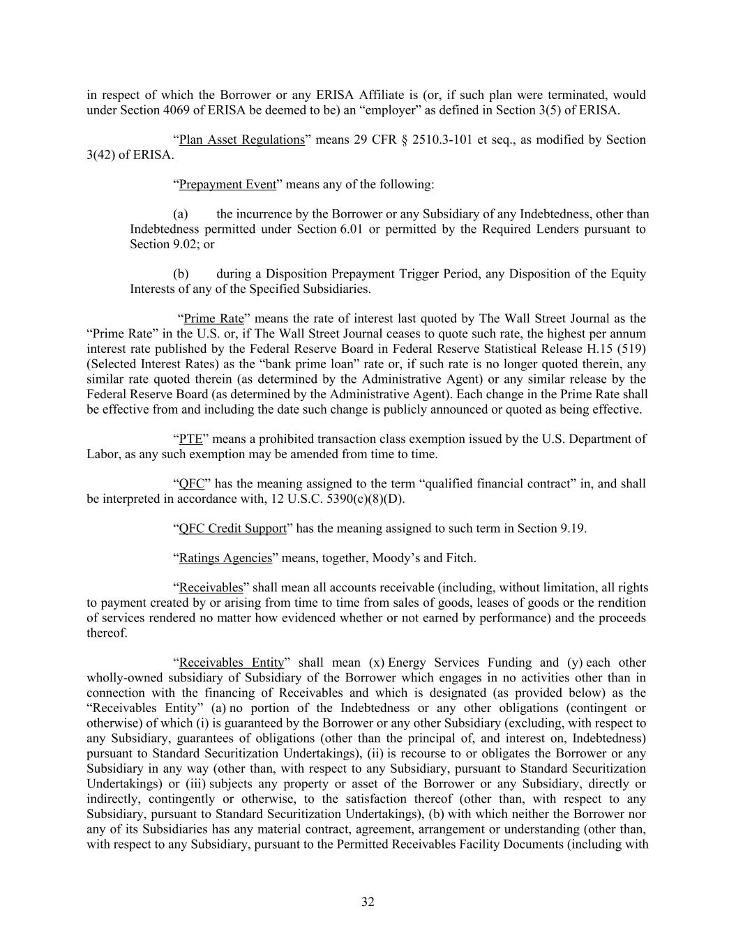 in respect of which the Borrower or any ERISA Affiliate is (or, if such plan were terminated, would under Section 4069 of ERISA be deemed to be) an “employer” as defined in Section 3(5) of ERISA. “Plan Asset Regulations” means 29 CFR § 2510.3-101 et seq., as modified by Section 3(42) of ERISA. “Prepayment Event” means any of the following: (a) the incurrence by the Borrower or any Subsidiary of any Indebtedness, other than Indebtedness permitted under Section 6.01 or permitted by the Required Lenders pursuant to Section 9.02; or (b) during a Disposition Prepayment Trigger Period, any Disposition of the Equity Interests of any of the Specified Subsidiaries. “Prime Rate” means the rate of interest last quoted by The Wall Street Journal as the “Prime Rate” in the U.S. or, if The Wall Street Journal ceases to quote such rate, the highest per annum interest rate published by the Federal Reserve Board in Federal Reserve Statistical Release H.15 (519) (Selected Interest Rates) as the “bank prime loan” rate or, if such rate is no longer quoted therein, any similar rate quoted therein (as determined by the Administrative Agent) or any similar release by the Federal Reserve Board (as determined by the Administrative Agent). Each change in the Prime Rate shall be effective from and including the date such change is publicly announced or quoted as being effective. “PTE” means a prohibited transaction class exemption issued by the U.S. Department of Labor, as any such exemption may be amended from time to time. “QFC” has the meaning assigned to the term “qualified financial contract” in, and shall be interpreted in accordance with, 12 U.S.C. 5390(c)(8)(D). “QFC Credit Support” has the meaning assigned to such term in Section 9.19. “Ratings Agencies” means, together, Moody’s and Fitch. “Receivables” shall mean all accounts receivable (including, without limitation, all rights to payment created by or arising from time to time from sales of goods, leases of goods or the rendition of services rendered no matter how evidenced whether or not earned by performance) and the proceeds thereof. “Receivables Entity” shall mean (x) Energy Services Funding and (y) each other wholly-owned subsidiary of Subsidiary of the Borrower which engages in no activities other than in connection with the financing of Receivables and which is designated (as provided below) as the “Receivables Entity” (a) no portion of the Indebtedness or any other obligations (contingent or otherwise) of which (i) is guaranteed by the Borrower or any other Subsidiary (excluding, with respect to any Subsidiary, guarantees of obligations (other than the principal of, and interest on, Indebtedness) pursuant to Standard Securitization Undertakings), (ii) is recourse to or obligates the Borrower or any Subsidiary in any way (other than, with respect to any Subsidiary, pursuant to Standard Securitization Undertakings) or (iii) subjects any property or asset of the Borrower or any Subsidiary, directly or indirectly, contingently or otherwise, to the satisfaction thereof (other than, with respect to any Subsidiary, pursuant to Standard Securitization Undertakings), (b) with which neither the Borrower nor any of its Subsidiaries has any material contract, agreement, arrangement or understanding (other than, with respect to any Subsidiary, pursuant to the Permitted Receivables Facility Documents (including with 32