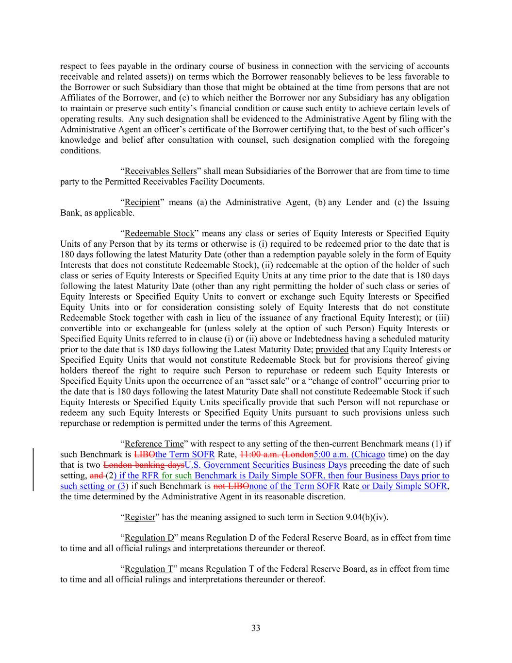 respect to fees payable in the ordinary course of business in connection with the servicing of accounts receivable and related assets)) on terms which the Borrower reasonably believes to be less favorable to the Borrower or such Subsidiary than those that might be obtained at the time from persons that are not Affiliates of the Borrower, and (c) to which neither the Borrower nor any Subsidiary has any obligation to maintain or preserve such entity’s financial condition or cause such entity to achieve certain levels of operating results. Any such designation shall be evidenced to the Administrative Agent by filing with the Administrative Agent an officer’s certificate of the Borrower certifying that, to the best of such officer’s knowledge and belief after consultation with counsel, such designation complied with the foregoing conditions. “Receivables Sellers” shall mean Subsidiaries of the Borrower that are from time to time party to the Permitted Receivables Facility Documents. “Recipient” means (a) the Administrative Agent, (b) any Lender and (c) the Issuing Bank, as applicable. “Redeemable Stock” means any class or series of Equity Interests or Specified Equity Units of any Person that by its terms or otherwise is (i) required to be redeemed prior to the date that is 180 days following the latest Maturity Date (other than a redemption payable solely in the form of Equity Interests that does not constitute Redeemable Stock), (ii) redeemable at the option of the holder of such class or series of Equity Interests or Specified Equity Units at any time prior to the date that is 180 days following the latest Maturity Date (other than any right permitting the holder of such class or series of Equity Interests or Specified Equity Units to convert or exchange such Equity Interests or Specified Equity Units into or for consideration consisting solely of Equity Interests that do not constitute Redeemable Stock together with cash in lieu of the issuance of any fractional Equity Interest); or (iii) convertible into or exchangeable for (unless solely at the option of such Person) Equity Interests or Specified Equity Units referred to in clause (i) or (ii) above or Indebtedness having a scheduled maturity prior to the date that is 180 days following the Latest Maturity Date; provided that any Equity Interests or Specified Equity Units that would not constitute Redeemable Stock but for provisions thereof giving holders thereof the right to require such Person to repurchase or redeem such Equity Interests or Specified Equity Units upon the occurrence of an “asset sale” or a “change of control” occurring prior to the date that is 180 days following the latest Maturity Date shall not constitute Redeemable Stock if such Equity Interests or Specified Equity Units specifically provide that such Person will not repurchase or redeem any such Equity Interests or Specified Equity Units pursuant to such provisions unless such repurchase or redemption is permitted under the terms of this Agreement. “Reference Time” with respect to any setting of the then-current Benchmark means (1) if such Benchmark is LIBOthe Term SOFR Rate, 11:00 a.m. (London5:00 a.m. (Chicago time) on the day that is two London banking daysU.S. Government Securities Business Days preceding the date of such setting, and (2) if the RFR for such Benchmark is Daily Simple SOFR, then four Business Days prior to such setting or (3) if such Benchmark is not LIBOnone of the Term SOFR Rate or Daily Simple SOFR, the time determined by the Administrative Agent in its reasonable discretion. “Register” has the meaning assigned to such term in Section 9.04(b)(iv). “Regulation D” means Regulation D of the Federal Reserve Board, as in effect from time to time and all official rulings and interpretations thereunder or thereof. “Regulation T” means Regulation T of the Federal Reserve Board, as in effect from time to time and all official rulings and interpretations thereunder or thereof. 33