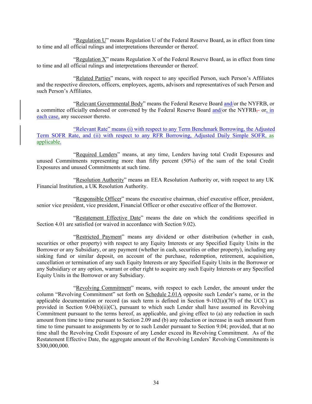 “Regulation U” means Regulation U of the Federal Reserve Board, as in effect from time to time and all official rulings and interpretations thereunder or thereof. “Regulation X” means Regulation X of the Federal Reserve Board, as in effect from time to time and all official rulings and interpretations thereunder or thereof. “Related Parties” means, with respect to any specified Person, such Person’s Affiliates and the respective directors, officers, employees, agents, advisors and representatives of such Person and such Person’s Affiliates. “Relevant Governmental Body” means the Federal Reserve Board and/or the NYFRB, or a committee officially endorsed or convened by the Federal Reserve Board and/or the NYFRB, or, in each case, any successor thereto. “Relevant Rate” means (i) with respect to any Term Benchmark Borrowing, the Adjusted Term SOFR Rate, and (ii) with respect to any RFR Borrowing, Adjusted Daily Simple SOFR, as applicable. “Required Lenders” means, at any time, Lenders having total Credit Exposures and unused Commitments representing more than fifty percent (50%) of the sum of the total Credit Exposures and unused Commitments at such time. “Resolution Authority” means an EEA Resolution Authority or, with respect to any UK Financial Institution, a UK Resolution Authority. “Responsible Officer” means the executive chairman, chief executive officer, president, senior vice president, vice president, Financial Officer or other executive officer of the Borrower. “Restatement Effective Date” means the date on which the conditions specified in Section 4.01 are satisfied (or waived in accordance with Section 9.02). “Restricted Payment” means any dividend or other distribution (whether in cash, securities or other property) with respect to any Equity Interests or any Specified Equity Units in the Borrower or any Subsidiary, or any payment (whether in cash, securities or other property), including any sinking fund or similar deposit, on account of the purchase, redemption, retirement, acquisition, cancellation or termination of any such Equity Interests or any Specified Equity Units in the Borrower or any Subsidiary or any option, warrant or other right to acquire any such Equity Interests or any Specified Equity Units in the Borrower or any Subsidiary. “Revolving Commitment” means, with respect to each Lender, the amount under the column “Revolving Commitment” set forth on Schedule 2.01A opposite such Lender’s name, or in the applicable documentation or record (as such term is defined in Section 9-102(a)(70) of the UCC) as provided in Section 9.04(b)(ii)(C), pursuant to which such Lender shall have assumed its Revolving Commitment pursuant to the terms hereof, as applicable, and giving effect to (a) any reduction in such amount from time to time pursuant to Section 2.09 and (b) any reduction or increase in such amount from time to time pursuant to assignments by or to such Lender pursuant to Section 9.04; provided, that at no time shall the Revolving Credit Exposure of any Lender exceed its Revolving Commitment. As of the Restatement Effective Date, the aggregate amount of the Revolving Lenders’ Revolving Commitments is $300,000,000. 34