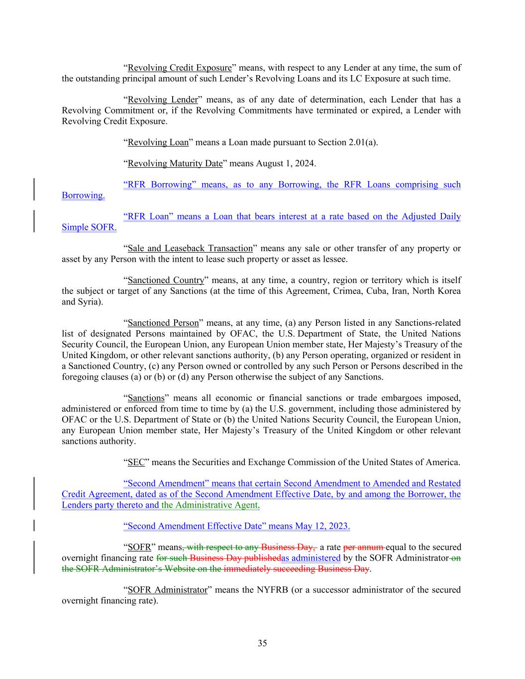 “Revolving Credit Exposure” means, with respect to any Lender at any time, the sum of the outstanding principal amount of such Lender’s Revolving Loans and its LC Exposure at such time. “Revolving Lender” means, as of any date of determination, each Lender that has a Revolving Commitment or, if the Revolving Commitments have terminated or expired, a Lender with Revolving Credit Exposure. “Revolving Loan” means a Loan made pursuant to Section 2.01(a). “Revolving Maturity Date” means August 1, 2024. “RFR Borrowing” means, as to any Borrowing, the RFR Loans comprising such Borrowing. “RFR Loan” means a Loan that bears interest at a rate based on the Adjusted Daily Simple SOFR. “Sale and Leaseback Transaction” means any sale or other transfer of any property or asset by any Person with the intent to lease such property or asset as lessee. “Sanctioned Country” means, at any time, a country, region or territory which is itself the subject or target of any Sanctions (at the time of this Agreement, Crimea, Cuba, Iran, North Korea and Syria). “Sanctioned Person” means, at any time, (a) any Person listed in any Sanctions-related list of designated Persons maintained by OFAC, the U.S. Department of State, the United Nations Security Council, the European Union, any European Union member state, Her Majesty’s Treasury of the United Kingdom, or other relevant sanctions authority, (b) any Person operating, organized or resident in a Sanctioned Country, (c) any Person owned or controlled by any such Person or Persons described in the foregoing clauses (a) or (b) or (d) any Person otherwise the subject of any Sanctions. “Sanctions” means all economic or financial sanctions or trade embargoes imposed, administered or enforced from time to time by (a) the U.S. government, including those administered by OFAC or the U.S. Department of State or (b) the United Nations Security Council, the European Union, any European Union member state, Her Majesty’s Treasury of the United Kingdom or other relevant sanctions authority. “SEC” means the Securities and Exchange Commission of the United States of America. “Second Amendment” means that certain Second Amendment to Amended and Restated Credit Agreement, dated as of the Second Amendment Effective Date, by and among the Borrower, the Lenders party thereto and the Administrative Agent. “Second Amendment Effective Date” means May 12, 2023. “SOFR” means, with respect to any Business Day, a rate per annum equal to the secured overnight financing rate for such Business Day publishedas administered by the SOFR Administrator on the SOFR Administrator’s Website on the immediately succeeding Business Day. “SOFR Administrator” means the NYFRB (or a successor administrator of the secured overnight financing rate). 35