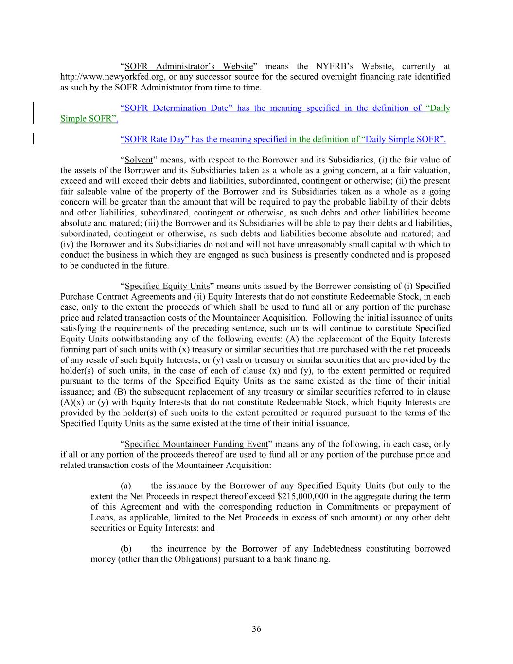 “SOFR Administrator’s Website” means the NYFRB’s Website, currently at http://www.newyorkfed.org, or any successor source for the secured overnight financing rate identified as such by the SOFR Administrator from time to time. “SOFR Determination Date” has the meaning specified in the definition of “Daily Simple SOFR”. “SOFR Rate Day” has the meaning specified in the definition of “Daily Simple SOFR”. “Solvent” means, with respect to the Borrower and its Subsidiaries, (i) the fair value of the assets of the Borrower and its Subsidiaries taken as a whole as a going concern, at a fair valuation, exceed and will exceed their debts and liabilities, subordinated, contingent or otherwise; (ii) the present fair saleable value of the property of the Borrower and its Subsidiaries taken as a whole as a going concern will be greater than the amount that will be required to pay the probable liability of their debts and other liabilities, subordinated, contingent or otherwise, as such debts and other liabilities become absolute and matured; (iii) the Borrower and its Subsidiaries will be able to pay their debts and liabilities, subordinated, contingent or otherwise, as such debts and liabilities become absolute and matured; and (iv) the Borrower and its Subsidiaries do not and will not have unreasonably small capital with which to conduct the business in which they are engaged as such business is presently conducted and is proposed to be conducted in the future. “Specified Equity Units” means units issued by the Borrower consisting of (i) Specified Purchase Contract Agreements and (ii) Equity Interests that do not constitute Redeemable Stock, in each case, only to the extent the proceeds of which shall be used to fund all or any portion of the purchase price and related transaction costs of the Mountaineer Acquisition. Following the initial issuance of units satisfying the requirements of the preceding sentence, such units will continue to constitute Specified Equity Units notwithstanding any of the following events: (A) the replacement of the Equity Interests forming part of such units with (x) treasury or similar securities that are purchased with the net proceeds of any resale of such Equity Interests; or (y) cash or treasury or similar securities that are provided by the holder(s) of such units, in the case of each of clause (x) and (y), to the extent permitted or required pursuant to the terms of the Specified Equity Units as the same existed as the time of their initial issuance; and (B) the subsequent replacement of any treasury or similar securities referred to in clause (A)(x) or (y) with Equity Interests that do not constitute Redeemable Stock, which Equity Interests are provided by the holder(s) of such units to the extent permitted or required pursuant to the terms of the Specified Equity Units as the same existed at the time of their initial issuance. “Specified Mountaineer Funding Event” means any of the following, in each case, only if all or any portion of the proceeds thereof are used to fund all or any portion of the purchase price and related transaction costs of the Mountaineer Acquisition: (a) the issuance by the Borrower of any Specified Equity Units (but only to the extent the Net Proceeds in respect thereof exceed $215,000,000 in the aggregate during the term of this Agreement and with the corresponding reduction in Commitments or prepayment of Loans, as applicable, limited to the Net Proceeds in excess of such amount) or any other debt securities or Equity Interests; and (b) the incurrence by the Borrower of any Indebtedness constituting borrowed money (other than the Obligations) pursuant to a bank financing. 36