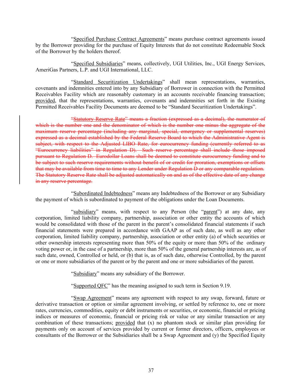 “Specified Purchase Contract Agreements” means purchase contract agreements issued by the Borrower providing for the purchase of Equity Interests that do not constitute Redeemable Stock of the Borrower by the holders thereof. “Specified Subsidiaries” means, collectively, UGI Utilities, Inc., UGI Energy Services, AmeriGas Partners, L.P. and UGI International, LLC. “Standard Securitization Undertakings” shall mean representations, warranties, covenants and indemnities entered into by any Subsidiary of Borrower in connection with the Permitted Receivables Facility which are reasonably customary in an accounts receivable financing transaction; provided, that the representations, warranties, covenants and indemnities set forth in the Existing Permitted Receivables Facility Documents are deemed to be “Standard Securitization Undertakings”. “Statutory Reserve Rate” means a fraction (expressed as a decimal), the numerator of which is the number one and the denominator of which is the number one minus the aggregate of the maximum reserve percentage (including any marginal, special, emergency or supplemental reserves) expressed as a decimal established by the Federal Reserve Board to which the Administrative Agent is subject, with respect to the Adjusted LIBO Rate, for eurocurrency funding (currently referred to as “Eurocurrency liabilities” in Regulation D). Such reserve percentage shall include those imposed pursuant to Regulation D. Eurodollar Loans shall be deemed to constitute eurocurrency funding and to be subject to such reserve requirements without benefit of or credit for proration, exemptions or offsets that may be available from time to time to any Lender under Regulation D or any comparable regulation. The Statutory Reserve Rate shall be adjusted automatically on and as of the effective date of any change in any reserve percentage. “Subordinated Indebtedness” means any Indebtedness of the Borrower or any Subsidiary the payment of which is subordinated to payment of the obligations under the Loan Documents. “subsidiary” means, with respect to any Person (the “parent”) at any date, any corporation, limited liability company, partnership, association or other entity the accounts of which would be consolidated with those of the parent in the parent’s consolidated financial statements if such financial statements were prepared in accordance with GAAP as of such date, as well as any other corporation, limited liability company, partnership, association or other entity (a) of which securities or other ownership interests representing more than 50% of the equity or more than 50% of the ordinary voting power or, in the case of a partnership, more than 50% of the general partnership interests are, as of such date, owned, Controlled or held, or (b) that is, as of such date, otherwise Controlled, by the parent or one or more subsidiaries of the parent or by the parent and one or more subsidiaries of the parent. “Subsidiary” means any subsidiary of the Borrower. “Supported QFC” has the meaning assigned to such term in Section 9.19. “Swap Agreement” means any agreement with respect to any swap, forward, future or derivative transaction or option or similar agreement involving, or settled by reference to, one or more rates, currencies, commodities, equity or debt instruments or securities, or economic, financial or pricing indices or measures of economic, financial or pricing risk or value or any similar transaction or any combination of these transactions; provided that (x) no phantom stock or similar plan providing for payments only on account of services provided by current or former directors, officers, employees or consultants of the Borrower or the Subsidiaries shall be a Swap Agreement and (y) the Specified Equity 37