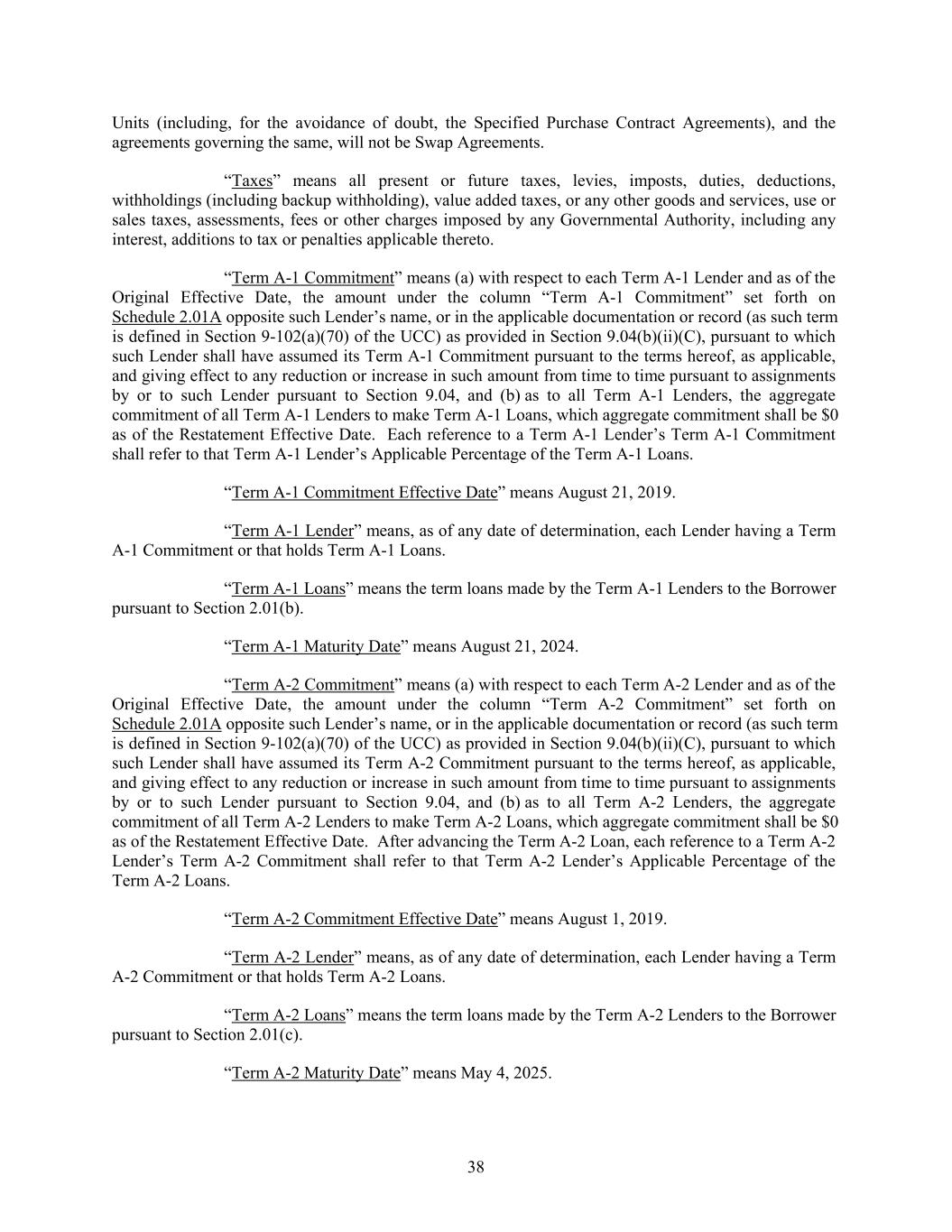 Units (including, for the avoidance of doubt, the Specified Purchase Contract Agreements), and the agreements governing the same, will not be Swap Agreements. “Taxes” means all present or future taxes, levies, imposts, duties, deductions, withholdings (including backup withholding), value added taxes, or any other goods and services, use or sales taxes, assessments, fees or other charges imposed by any Governmental Authority, including any interest, additions to tax or penalties applicable thereto. “Term A-1 Commitment” means (a) with respect to each Term A-1 Lender and as of the Original Effective Date, the amount under the column “Term A-1 Commitment” set forth on Schedule 2.01A opposite such Lender’s name, or in the applicable documentation or record (as such term is defined in Section 9-102(a)(70) of the UCC) as provided in Section 9.04(b)(ii)(C), pursuant to which such Lender shall have assumed its Term A-1 Commitment pursuant to the terms hereof, as applicable, and giving effect to any reduction or increase in such amount from time to time pursuant to assignments by or to such Lender pursuant to Section 9.04, and (b) as to all Term A-1 Lenders, the aggregate commitment of all Term A-1 Lenders to make Term A-1 Loans, which aggregate commitment shall be $0 as of the Restatement Effective Date. Each reference to a Term A-1 Lender’s Term A-1 Commitment shall refer to that Term A-1 Lender’s Applicable Percentage of the Term A-1 Loans. “Term A-1 Commitment Effective Date” means August 21, 2019. “Term A-1 Lender” means, as of any date of determination, each Lender having a Term A-1 Commitment or that holds Term A-1 Loans. “Term A-1 Loans” means the term loans made by the Term A-1 Lenders to the Borrower pursuant to Section 2.01(b). “Term A-1 Maturity Date” means August 21, 2024. “Term A-2 Commitment” means (a) with respect to each Term A-2 Lender and as of the Original Effective Date, the amount under the column “Term A-2 Commitment” set forth on Schedule 2.01A opposite such Lender’s name, or in the applicable documentation or record (as such term is defined in Section 9-102(a)(70) of the UCC) as provided in Section 9.04(b)(ii)(C), pursuant to which such Lender shall have assumed its Term A-2 Commitment pursuant to the terms hereof, as applicable, and giving effect to any reduction or increase in such amount from time to time pursuant to assignments by or to such Lender pursuant to Section 9.04, and (b) as to all Term A-2 Lenders, the aggregate commitment of all Term A-2 Lenders to make Term A-2 Loans, which aggregate commitment shall be $0 as of the Restatement Effective Date. After advancing the Term A-2 Loan, each reference to a Term A-2 Lender’s Term A-2 Commitment shall refer to that Term A-2 Lender’s Applicable Percentage of the Term A-2 Loans. “Term A-2 Commitment Effective Date” means August 1, 2019. “Term A-2 Lender” means, as of any date of determination, each Lender having a Term A-2 Commitment or that holds Term A-2 Loans. “Term A-2 Loans” means the term loans made by the Term A-2 Lenders to the Borrower pursuant to Section 2.01(c). “Term A-2 Maturity Date” means May 4, 2025. 38