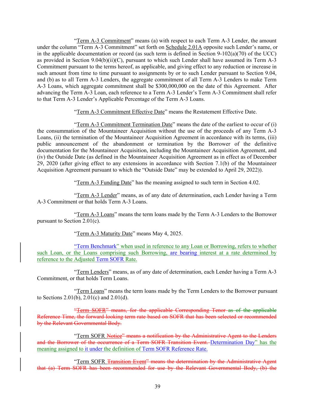 “Term A-3 Commitment” means (a) with respect to each Term A-3 Lender, the amount under the column “Term A-3 Commitment” set forth on Schedule 2.01A opposite such Lender’s name, or in the applicable documentation or record (as such term is defined in Section 9-102(a)(70) of the UCC) as provided in Section 9.04(b)(ii)(C), pursuant to which such Lender shall have assumed its Term A-3 Commitment pursuant to the terms hereof, as applicable, and giving effect to any reduction or increase in such amount from time to time pursuant to assignments by or to such Lender pursuant to Section 9.04, and (b) as to all Term A-3 Lenders, the aggregate commitment of all Term A-3 Lenders to make Term A-3 Loans, which aggregate commitment shall be $300,000,000 on the date of this Agreement. After advancing the Term A-3 Loan, each reference to a Term A-3 Lender’s Term A-3 Commitment shall refer to that Term A-3 Lender’s Applicable Percentage of the Term A-3 Loans. “Term A-3 Commitment Effective Date” means the Restatement Effective Date. “Term A-3 Commitment Termination Date” means the date of the earliest to occur of (i) the consummation of the Mountaineer Acquisition without the use of the proceeds of any Term A-3 Loans, (ii) the termination of the Mountaineer Acquisition Agreement in accordance with its terms, (iii) public announcement of the abandonment or termination by the Borrower of the definitive documentation for the Mountaineer Acquisition, including the Mountaineer Acquisition Agreement, and (iv) the Outside Date (as defined in the Mountaineer Acquisition Agreement as in effect as of December 29, 2020 (after giving effect to any extensions in accordance with Section 7.1(b) of the Mountaineer Acquisition Agreement pursuant to which the “Outside Date” may be extended to April 29, 2022)). “Term A-3 Funding Date” has the meaning assigned to such term in Section 4.02. “Term A-3 Lender” means, as of any date of determination, each Lender having a Term A-3 Commitment or that holds Term A-3 Loans. “Term A-3 Loans” means the term loans made by the Term A-3 Lenders to the Borrower pursuant to Section 2.01(c). “Term A-3 Maturity Date” means May 4, 2025. “Term Benchmark” when used in reference to any Loan or Borrowing, refers to whether such Loan, or the Loans comprising such Borrowing, are bearing interest at a rate determined by reference to the Adjusted Term SOFR Rate. “Term Lenders” means, as of any date of determination, each Lender having a Term A-3 Commitment, or that holds Term Loans. “Term Loans” means the term loans made by the Term Lenders to the Borrower pursuant to Sections 2.01(b), 2.01(c) and 2.01(d). “Term SOFR” means, for the applicable Corresponding Tenor as of the applicable Reference Time, the forward-looking term rate based on SOFR that has been selected or recommended by the Relevant Governmental Body. “Term SOFR Notice” means a notification by the Administrative Agent to the Lenders and the Borrower of the occurrence of a Term SOFR Transition Event. Determination Day” has the meaning assigned to it under the definition of Term SOFR Reference Rate. “Term SOFR Transition Event” means the determination by the Administrative Agent that (a) Term SOFR has been recommended for use by the Relevant Governmental Body, (b) the 39