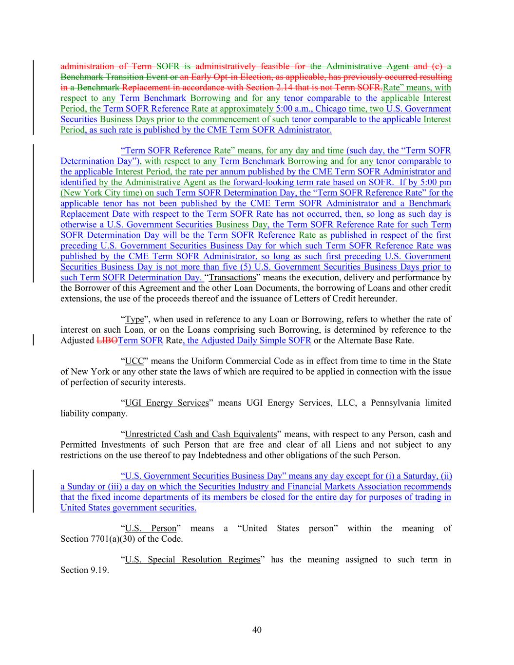 administration of Term SOFR is administratively feasible for the Administrative Agent and (c) a Benchmark Transition Event or an Early Opt-in Election, as applicable, has previously occurred resulting in a Benchmark Replacement in accordance with Section 2.14 that is not Term SOFR.Rate” means, with respect to any Term Benchmark Borrowing and for any tenor comparable to the applicable Interest Period, the Term SOFR Reference Rate at approximately 5:00 a.m., Chicago time, two U.S. Government Securities Business Days prior to the commencement of such tenor comparable to the applicable Interest Period, as such rate is published by the CME Term SOFR Administrator. “Term SOFR Reference Rate” means, for any day and time (such day, the “Term SOFR Determination Day”), with respect to any Term Benchmark Borrowing and for any tenor comparable to the applicable Interest Period, the rate per annum published by the CME Term SOFR Administrator and identified by the Administrative Agent as the forward-looking term rate based on SOFR. If by 5:00 pm (New York City time) on such Term SOFR Determination Day, the “Term SOFR Reference Rate” for the applicable tenor has not been published by the CME Term SOFR Administrator and a Benchmark Replacement Date with respect to the Term SOFR Rate has not occurred, then, so long as such day is otherwise a U.S. Government Securities Business Day, the Term SOFR Reference Rate for such Term SOFR Determination Day will be the Term SOFR Reference Rate as published in respect of the first preceding U.S. Government Securities Business Day for which such Term SOFR Reference Rate was published by the CME Term SOFR Administrator, so long as such first preceding U.S. Government Securities Business Day is not more than five (5) U.S. Government Securities Business Days prior to such Term SOFR Determination Day. “Transactions” means the execution, delivery and performance by the Borrower of this Agreement and the other Loan Documents, the borrowing of Loans and other credit extensions, the use of the proceeds thereof and the issuance of Letters of Credit hereunder. “Type”, when used in reference to any Loan or Borrowing, refers to whether the rate of interest on such Loan, or on the Loans comprising such Borrowing, is determined by reference to the Adjusted LIBOTerm SOFR Rate, the Adjusted Daily Simple SOFR or the Alternate Base Rate. “UCC” means the Uniform Commercial Code as in effect from time to time in the State of New York or any other state the laws of which are required to be applied in connection with the issue of perfection of security interests. “UGI Energy Services” means UGI Energy Services, LLC, a Pennsylvania limited liability company. “Unrestricted Cash and Cash Equivalents” means, with respect to any Person, cash and Permitted Investments of such Person that are free and clear of all Liens and not subject to any restrictions on the use thereof to pay Indebtedness and other obligations of the such Person. “U.S. Government Securities Business Day” means any day except for (i) a Saturday, (ii) a Sunday or (iii) a day on which the Securities Industry and Financial Markets Association recommends that the fixed income departments of its members be closed for the entire day for purposes of trading in United States government securities. “U.S. Person” means a “United States person” within the meaning of Section 7701(a)(30) of the Code. “U.S. Special Resolution Regimes” has the meaning assigned to such term in Section 9.19. 40
