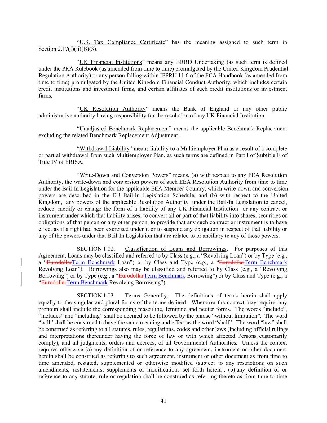 “U.S. Tax Compliance Certificate” has the meaning assigned to such term in Section 2.17(f)(ii)(B)(3). “UK Financial Institutions” means any BRRD Undertaking (as such term is defined under the PRA Rulebook (as amended from time to time) promulgated by the United Kingdom Prudential Regulation Authority) or any person falling within IFPRU 11.6 of the FCA Handbook (as amended from time to time) promulgated by the United Kingdom Financial Conduct Authority, which includes certain credit institutions and investment firms, and certain affiliates of such credit institutions or investment firms. “UK Resolution Authority” means the Bank of England or any other public administrative authority having responsibility for the resolution of any UK Financial Institution. “Unadjusted Benchmark Replacement” means the applicable Benchmark Replacement excluding the related Benchmark Replacement Adjustment. “Withdrawal Liability” means liability to a Multiemployer Plan as a result of a complete or partial withdrawal from such Multiemployer Plan, as such terms are defined in Part I of Subtitle E of Title IV of ERISA. “Write-Down and Conversion Powers” means, (a) with respect to any EEA Resolution Authority, the write-down and conversion powers of such EEA Resolution Authority from time to time under the Bail-In Legislation for the applicable EEA Member Country, which write-down and conversion powers are described in the EU Bail-In Legislation Schedule, and (b) with respect to the United Kingdom, any powers of the applicable Resolution Authority under the Bail-In Legislation to cancel, reduce, modify or change the form of a liability of any UK Financial Institution or any contract or instrument under which that liability arises, to convert all or part of that liability into shares, securities or obligations of that person or any other person, to provide that any such contract or instrument is to have effect as if a right had been exercised under it or to suspend any obligation in respect of that liability or any of the powers under that Bail-In Legislation that are related to or ancillary to any of those powers. SECTION 1.02. Classification of Loans and Borrowings. For purposes of this Agreement, Loans may be classified and referred to by Class (e.g., a “Revolving Loan”) or by Type (e.g., a “EurodollarTerm Benchmark Loan”) or by Class and Type (e.g., a “EurodollarTerm Benchmark Revolving Loan”). Borrowings also may be classified and referred to by Class (e.g., a “Revolving Borrowing”) or by Type (e.g., a “EurodollarTerm Benchmark Borrowing”) or by Class and Type (e.g., a “EurodollarTerm Benchmark Revolving Borrowing”). SECTION 1.03. Terms Generally. The definitions of terms herein shall apply equally to the singular and plural forms of the terms defined. Whenever the context may require, any pronoun shall include the corresponding masculine, feminine and neuter forms. The words “include”, “includes” and “including” shall be deemed to be followed by the phrase “without limitation”. The word “will” shall be construed to have the same meaning and effect as the word “shall”. The word “law” shall be construed as referring to all statutes, rules, regulations, codes and other laws (including official rulings and interpretations thereunder having the force of law or with which affected Persons customarily comply), and all judgments, orders and decrees, of all Governmental Authorities. Unless the context requires otherwise (a) any definition of or reference to any agreement, instrument or other document herein shall be construed as referring to such agreement, instrument or other document as from time to time amended, restated, supplemented or otherwise modified (subject to any restrictions on such amendments, restatements, supplements or modifications set forth herein), (b) any definition of or reference to any statute, rule or regulation shall be construed as referring thereto as from time to time 41
