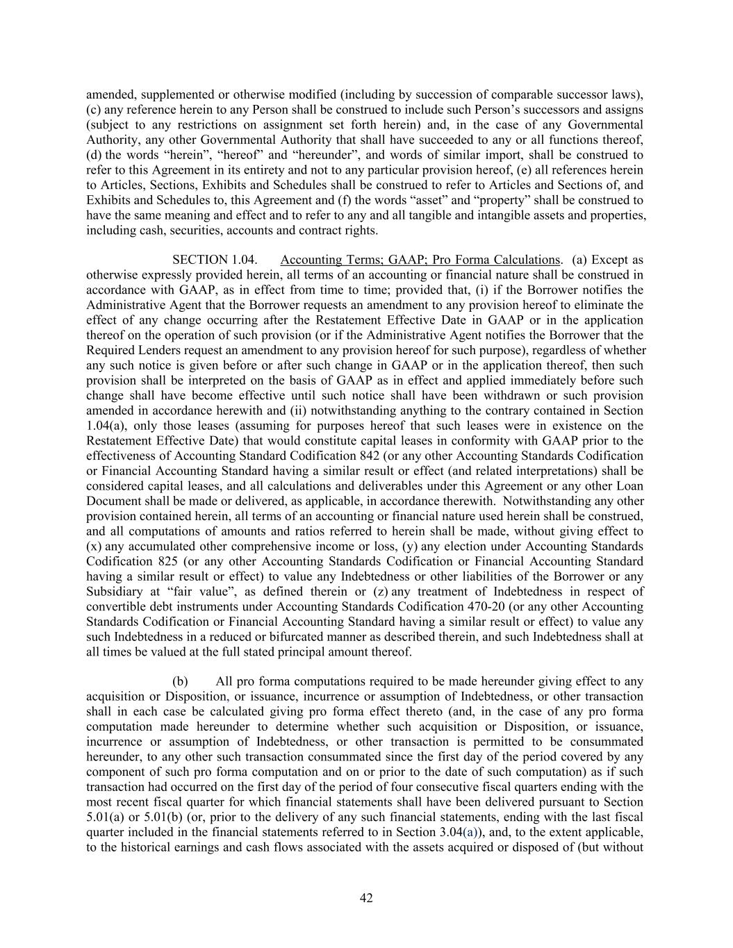 amended, supplemented or otherwise modified (including by succession of comparable successor laws), (c) any reference herein to any Person shall be construed to include such Person’s successors and assigns (subject to any restrictions on assignment set forth herein) and, in the case of any Governmental Authority, any other Governmental Authority that shall have succeeded to any or all functions thereof, (d) the words “herein”, “hereof” and “hereunder”, and words of similar import, shall be construed to refer to this Agreement in its entirety and not to any particular provision hereof, (e) all references herein to Articles, Sections, Exhibits and Schedules shall be construed to refer to Articles and Sections of, and Exhibits and Schedules to, this Agreement and (f) the words “asset” and “property” shall be construed to have the same meaning and effect and to refer to any and all tangible and intangible assets and properties, including cash, securities, accounts and contract rights. SECTION 1.04. Accounting Terms; GAAP; Pro Forma Calculations. (a) Except as otherwise expressly provided herein, all terms of an accounting or financial nature shall be construed in accordance with GAAP, as in effect from time to time; provided that, (i) if the Borrower notifies the Administrative Agent that the Borrower requests an amendment to any provision hereof to eliminate the effect of any change occurring after the Restatement Effective Date in GAAP or in the application thereof on the operation of such provision (or if the Administrative Agent notifies the Borrower that the Required Lenders request an amendment to any provision hereof for such purpose), regardless of whether any such notice is given before or after such change in GAAP or in the application thereof, then such provision shall be interpreted on the basis of GAAP as in effect and applied immediately before such change shall have become effective until such notice shall have been withdrawn or such provision amended in accordance herewith and (ii) notwithstanding anything to the contrary contained in Section 1.04(a), only those leases (assuming for purposes hereof that such leases were in existence on the Restatement Effective Date) that would constitute capital leases in conformity with GAAP prior to the effectiveness of Accounting Standard Codification 842 (or any other Accounting Standards Codification or Financial Accounting Standard having a similar result or effect (and related interpretations) shall be considered capital leases, and all calculations and deliverables under this Agreement or any other Loan Document shall be made or delivered, as applicable, in accordance therewith. Notwithstanding any other provision contained herein, all terms of an accounting or financial nature used herein shall be construed, and all computations of amounts and ratios referred to herein shall be made, without giving effect to (x) any accumulated other comprehensive income or loss, (y) any election under Accounting Standards Codification 825 (or any other Accounting Standards Codification or Financial Accounting Standard having a similar result or effect) to value any Indebtedness or other liabilities of the Borrower or any Subsidiary at “fair value”, as defined therein or (z) any treatment of Indebtedness in respect of convertible debt instruments under Accounting Standards Codification 470-20 (or any other Accounting Standards Codification or Financial Accounting Standard having a similar result or effect) to value any such Indebtedness in a reduced or bifurcated manner as described therein, and such Indebtedness shall at all times be valued at the full stated principal amount thereof. (b) All pro forma computations required to be made hereunder giving effect to any acquisition or Disposition, or issuance, incurrence or assumption of Indebtedness, or other transaction shall in each case be calculated giving pro forma effect thereto (and, in the case of any pro forma computation made hereunder to determine whether such acquisition or Disposition, or issuance, incurrence or assumption of Indebtedness, or other transaction is permitted to be consummated hereunder, to any other such transaction consummated since the first day of the period covered by any component of such pro forma computation and on or prior to the date of such computation) as if such transaction had occurred on the first day of the period of four consecutive fiscal quarters ending with the most recent fiscal quarter for which financial statements shall have been delivered pursuant to Section 5.01(a) or 5.01(b) (or, prior to the delivery of any such financial statements, ending with the last fiscal quarter included in the financial statements referred to in Section 3.04(a)), and, to the extent applicable, to the historical earnings and cash flows associated with the assets acquired or disposed of (but without 42