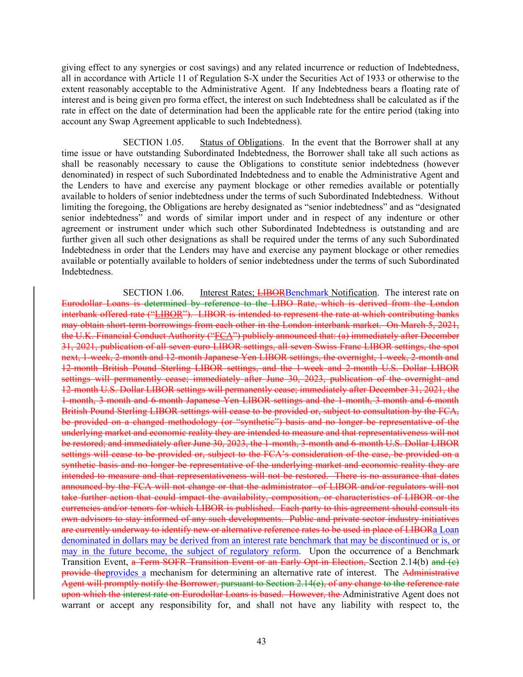 giving effect to any synergies or cost savings) and any related incurrence or reduction of Indebtedness, all in accordance with Article 11 of Regulation S-X under the Securities Act of 1933 or otherwise to the extent reasonably acceptable to the Administrative Agent. If any Indebtedness bears a floating rate of interest and is being given pro forma effect, the interest on such Indebtedness shall be calculated as if the rate in effect on the date of determination had been the applicable rate for the entire period (taking into account any Swap Agreement applicable to such Indebtedness). SECTION 1.05. Status of Obligations. In the event that the Borrower shall at any time issue or have outstanding Subordinated Indebtedness, the Borrower shall take all such actions as shall be reasonably necessary to cause the Obligations to constitute senior indebtedness (however denominated) in respect of such Subordinated Indebtedness and to enable the Administrative Agent and the Lenders to have and exercise any payment blockage or other remedies available or potentially available to holders of senior indebtedness under the terms of such Subordinated Indebtedness. Without limiting the foregoing, the Obligations are hereby designated as “senior indebtedness” and as “designated senior indebtedness” and words of similar import under and in respect of any indenture or other agreement or instrument under which such other Subordinated Indebtedness is outstanding and are further given all such other designations as shall be required under the terms of any such Subordinated Indebtedness in order that the Lenders may have and exercise any payment blockage or other remedies available or potentially available to holders of senior indebtedness under the terms of such Subordinated Indebtedness. SECTION 1.06. Interest Rates; LIBORBenchmark Notification. The interest rate on Eurodollar Loans is determined by reference to the LIBO Rate, which is derived from the London interbank offered rate (“LIBOR”). LIBOR is intended to represent the rate at which contributing banks may obtain short-term borrowings from each other in the London interbank market. On March 5, 2021, the U.K. Financial Conduct Authority (“FCA”) publicly announced that: (a) immediately after December 31, 2021, publication of all seven euro LIBOR settings, all seven Swiss Franc LIBOR settings, the spot next, 1-week, 2-month and 12-month Japanese Yen LIBOR settings, the overnight, 1-week, 2-month and 12-month British Pound Sterling LIBOR settings, and the 1-week and 2-month U.S. Dollar LIBOR settings will permanently cease; immediately after June 30, 2023, publication of the overnight and 12-month U.S. Dollar LIBOR settings will permanently cease; immediately after December 31, 2021, the 1-month, 3-month and 6-month Japanese Yen LIBOR settings and the 1-month, 3-month and 6-month British Pound Sterling LIBOR settings will cease to be provided or, subject to consultation by the FCA, be provided on a changed methodology (or “synthetic”) basis and no longer be representative of the underlying market and economic reality they are intended to measure and that representativeness will not be restored; and immediately after June 30, 2023, the 1-month, 3-month and 6-month U.S. Dollar LIBOR settings will cease to be provided or, subject to the FCA’s consideration of the case, be provided on a synthetic basis and no longer be representative of the underlying market and economic reality they are intended to measure and that representativeness will not be restored. There is no assurance that dates announced by the FCA will not change or that the administrator of LIBOR and/or regulators will not take further action that could impact the availability, composition, or characteristics of LIBOR or the currencies and/or tenors for which LIBOR is published. Each party to this agreement should consult its own advisors to stay informed of any such developments. Public and private sector industry initiatives are currently underway to identify new or alternative reference rates to be used in place of LIBORa Loan denominated in dollars may be derived from an interest rate benchmark that may be discontinued or is, or may in the future become, the subject of regulatory reform. Upon the occurrence of a Benchmark Transition Event, a Term SOFR Transition Event or an Early Opt-in Election, Section 2.14(b) and (c) provide theprovides a mechanism for determining an alternative rate of interest. The Administrative Agent will promptly notify the Borrower, pursuant to Section 2.14(e), of any change to the reference rate upon which the interest rate on Eurodollar Loans is based. However, the Administrative Agent does not warrant or accept any responsibility for, and shall not have any liability with respect to, the 43