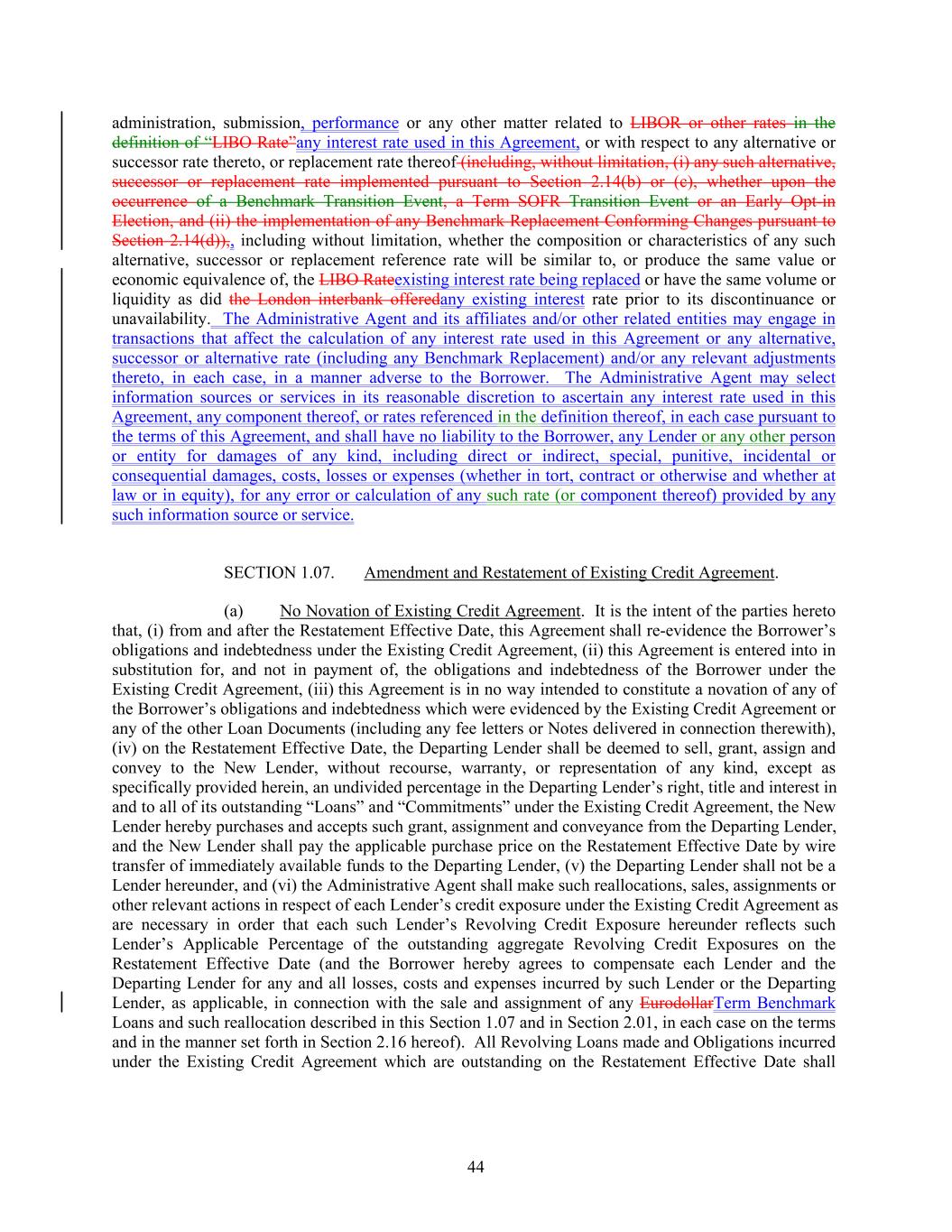 administration, submission, performance or any other matter related to LIBOR or other rates in the definition of “LIBO Rate”any interest rate used in this Agreement, or with respect to any alternative or successor rate thereto, or replacement rate thereof (including, without limitation, (i) any such alternative, successor or replacement rate implemented pursuant to Section 2.14(b) or (c), whether upon the occurrence of a Benchmark Transition Event, a Term SOFR Transition Event or an Early Opt-in Election, and (ii) the implementation of any Benchmark Replacement Conforming Changes pursuant to Section 2.14(d)),, including without limitation, whether the composition or characteristics of any such alternative, successor or replacement reference rate will be similar to, or produce the same value or economic equivalence of, the LIBO Rateexisting interest rate being replaced or have the same volume or liquidity as did the London interbank offeredany existing interest rate prior to its discontinuance or unavailability. The Administrative Agent and its affiliates and/or other related entities may engage in transactions that affect the calculation of any interest rate used in this Agreement or any alternative, successor or alternative rate (including any Benchmark Replacement) and/or any relevant adjustments thereto, in each case, in a manner adverse to the Borrower. The Administrative Agent may select information sources or services in its reasonable discretion to ascertain any interest rate used in this Agreement, any component thereof, or rates referenced in the definition thereof, in each case pursuant to the terms of this Agreement, and shall have no liability to the Borrower, any Lender or any other person or entity for damages of any kind, including direct or indirect, special, punitive, incidental or consequential damages, costs, losses or expenses (whether in tort, contract or otherwise and whether at law or in equity), for any error or calculation of any such rate (or component thereof) provided by any such information source or service. SECTION 1.07. Amendment and Restatement of Existing Credit Agreement. (a) No Novation of Existing Credit Agreement. It is the intent of the parties hereto that, (i) from and after the Restatement Effective Date, this Agreement shall re-evidence the Borrower’s obligations and indebtedness under the Existing Credit Agreement, (ii) this Agreement is entered into in substitution for, and not in payment of, the obligations and indebtedness of the Borrower under the Existing Credit Agreement, (iii) this Agreement is in no way intended to constitute a novation of any of the Borrower’s obligations and indebtedness which were evidenced by the Existing Credit Agreement or any of the other Loan Documents (including any fee letters or Notes delivered in connection therewith), (iv) on the Restatement Effective Date, the Departing Lender shall be deemed to sell, grant, assign and convey to the New Lender, without recourse, warranty, or representation of any kind, except as specifically provided herein, an undivided percentage in the Departing Lender’s right, title and interest in and to all of its outstanding “Loans” and “Commitments” under the Existing Credit Agreement, the New Lender hereby purchases and accepts such grant, assignment and conveyance from the Departing Lender, and the New Lender shall pay the applicable purchase price on the Restatement Effective Date by wire transfer of immediately available funds to the Departing Lender, (v) the Departing Lender shall not be a Lender hereunder, and (vi) the Administrative Agent shall make such reallocations, sales, assignments or other relevant actions in respect of each Lender’s credit exposure under the Existing Credit Agreement as are necessary in order that each such Lender’s Revolving Credit Exposure hereunder reflects such Lender’s Applicable Percentage of the outstanding aggregate Revolving Credit Exposures on the Restatement Effective Date (and the Borrower hereby agrees to compensate each Lender and the Departing Lender for any and all losses, costs and expenses incurred by such Lender or the Departing Lender, as applicable, in connection with the sale and assignment of any EurodollarTerm Benchmark Loans and such reallocation described in this Section 1.07 and in Section 2.01, in each case on the terms and in the manner set forth in Section 2.16 hereof). All Revolving Loans made and Obligations incurred under the Existing Credit Agreement which are outstanding on the Restatement Effective Date shall 44