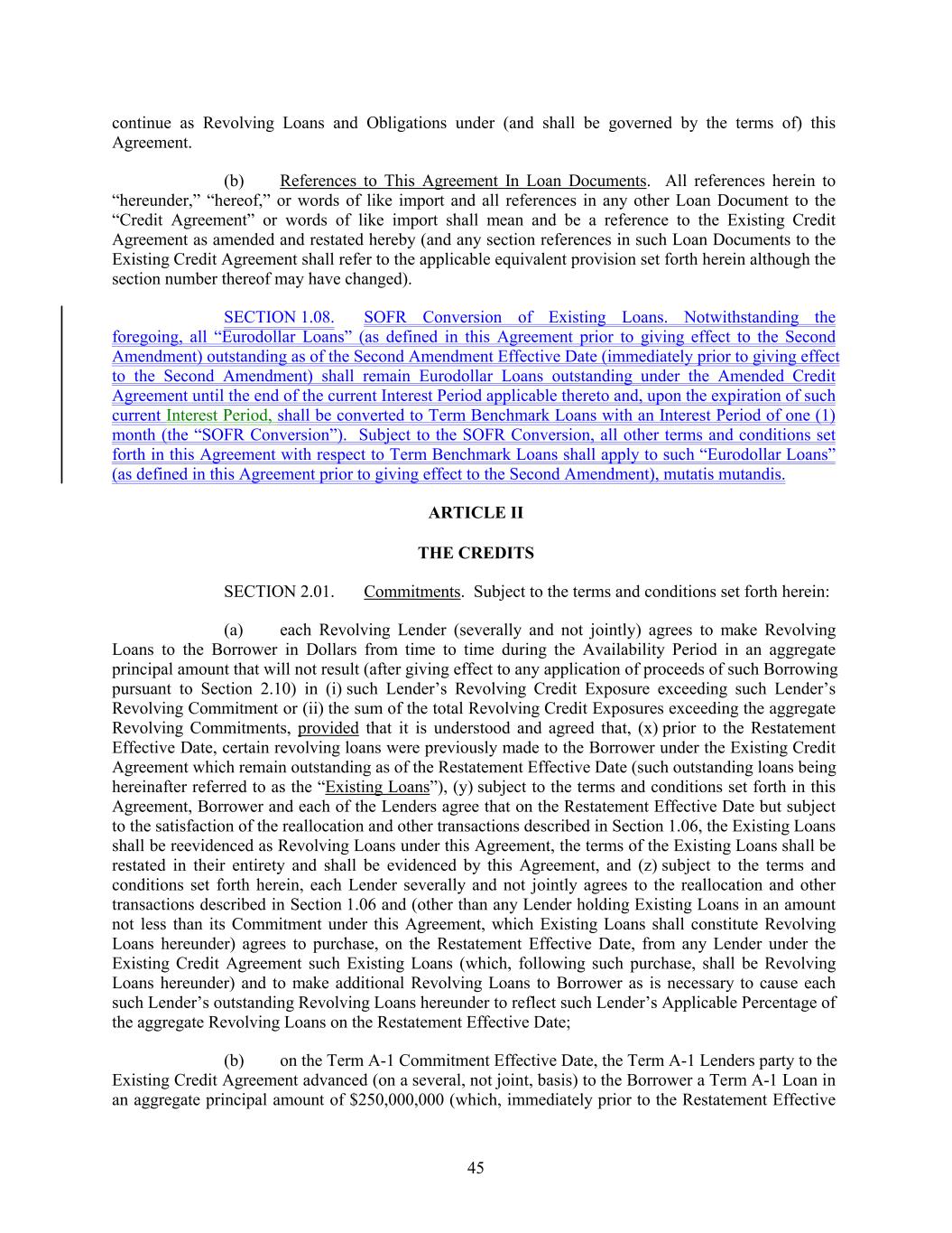 continue as Revolving Loans and Obligations under (and shall be governed by the terms of) this Agreement. (b) References to This Agreement In Loan Documents. All references herein to “hereunder,” “hereof,” or words of like import and all references in any other Loan Document to the “Credit Agreement” or words of like import shall mean and be a reference to the Existing Credit Agreement as amended and restated hereby (and any section references in such Loan Documents to the Existing Credit Agreement shall refer to the applicable equivalent provision set forth herein although the section number thereof may have changed). SECTION 1.08. SOFR Conversion of Existing Loans. Notwithstanding the foregoing, all “Eurodollar Loans” (as defined in this Agreement prior to giving effect to the Second Amendment) outstanding as of the Second Amendment Effective Date (immediately prior to giving effect to the Second Amendment) shall remain Eurodollar Loans outstanding under the Amended Credit Agreement until the end of the current Interest Period applicable thereto and, upon the expiration of such current Interest Period, shall be converted to Term Benchmark Loans with an Interest Period of one (1) month (the “SOFR Conversion”). Subject to the SOFR Conversion, all other terms and conditions set forth in this Agreement with respect to Term Benchmark Loans shall apply to such “Eurodollar Loans” (as defined in this Agreement prior to giving effect to the Second Amendment), mutatis mutandis. ARTICLE II THE CREDITS SECTION 2.01. Commitments. Subject to the terms and conditions set forth herein: (a) each Revolving Lender (severally and not jointly) agrees to make Revolving Loans to the Borrower in Dollars from time to time during the Availability Period in an aggregate principal amount that will not result (after giving effect to any application of proceeds of such Borrowing pursuant to Section 2.10) in (i) such Lender’s Revolving Credit Exposure exceeding such Lender’s Revolving Commitment or (ii) the sum of the total Revolving Credit Exposures exceeding the aggregate Revolving Commitments, provided that it is understood and agreed that, (x) prior to the Restatement Effective Date, certain revolving loans were previously made to the Borrower under the Existing Credit Agreement which remain outstanding as of the Restatement Effective Date (such outstanding loans being hereinafter referred to as the “Existing Loans”), (y) subject to the terms and conditions set forth in this Agreement, Borrower and each of the Lenders agree that on the Restatement Effective Date but subject to the satisfaction of the reallocation and other transactions described in Section 1.06, the Existing Loans shall be reevidenced as Revolving Loans under this Agreement, the terms of the Existing Loans shall be restated in their entirety and shall be evidenced by this Agreement, and (z) subject to the terms and conditions set forth herein, each Lender severally and not jointly agrees to the reallocation and other transactions described in Section 1.06 and (other than any Lender holding Existing Loans in an amount not less than its Commitment under this Agreement, which Existing Loans shall constitute Revolving Loans hereunder) agrees to purchase, on the Restatement Effective Date, from any Lender under the Existing Credit Agreement such Existing Loans (which, following such purchase, shall be Revolving Loans hereunder) and to make additional Revolving Loans to Borrower as is necessary to cause each such Lender’s outstanding Revolving Loans hereunder to reflect such Lender’s Applicable Percentage of the aggregate Revolving Loans on the Restatement Effective Date; (b) on the Term A-1 Commitment Effective Date, the Term A-1 Lenders party to the Existing Credit Agreement advanced (on a several, not joint, basis) to the Borrower a Term A-1 Loan in an aggregate principal amount of $250,000,000 (which, immediately prior to the Restatement Effective 45