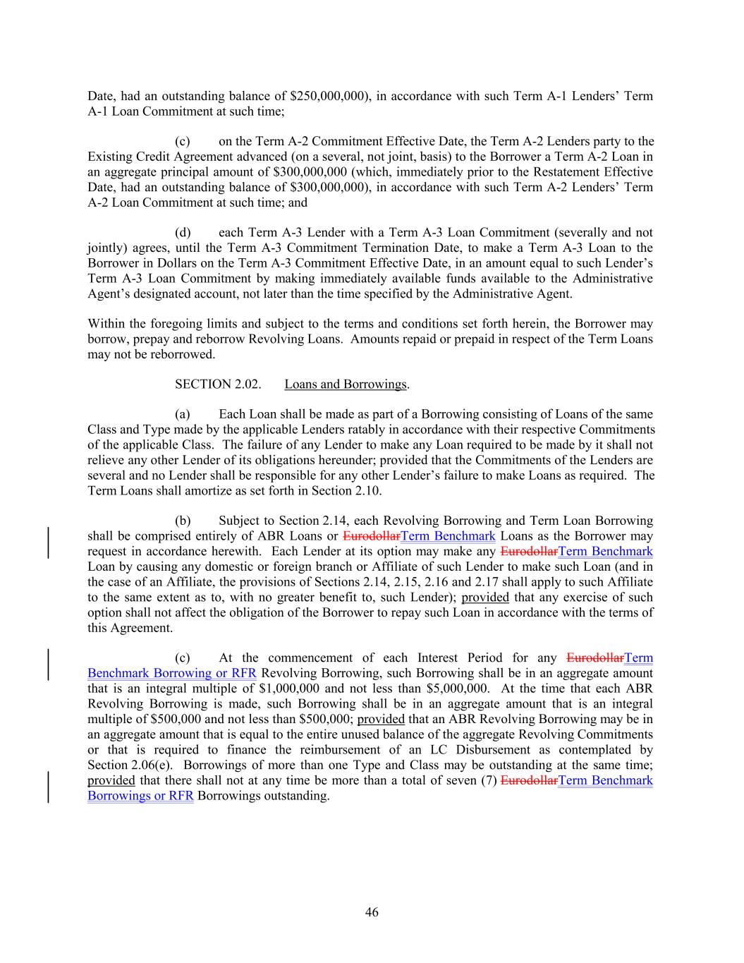 Date, had an outstanding balance of $250,000,000), in accordance with such Term A-1 Lenders’ Term A-1 Loan Commitment at such time; (c) on the Term A-2 Commitment Effective Date, the Term A-2 Lenders party to the Existing Credit Agreement advanced (on a several, not joint, basis) to the Borrower a Term A-2 Loan in an aggregate principal amount of $300,000,000 (which, immediately prior to the Restatement Effective Date, had an outstanding balance of $300,000,000), in accordance with such Term A-2 Lenders’ Term A-2 Loan Commitment at such time; and (d) each Term A-3 Lender with a Term A-3 Loan Commitment (severally and not jointly) agrees, until the Term A-3 Commitment Termination Date, to make a Term A-3 Loan to the Borrower in Dollars on the Term A-3 Commitment Effective Date, in an amount equal to such Lender’s Term A-3 Loan Commitment by making immediately available funds available to the Administrative Agent’s designated account, not later than the time specified by the Administrative Agent. Within the foregoing limits and subject to the terms and conditions set forth herein, the Borrower may borrow, prepay and reborrow Revolving Loans. Amounts repaid or prepaid in respect of the Term Loans may not be reborrowed. SECTION 2.02. Loans and Borrowings. (a) Each Loan shall be made as part of a Borrowing consisting of Loans of the same Class and Type made by the applicable Lenders ratably in accordance with their respective Commitments of the applicable Class. The failure of any Lender to make any Loan required to be made by it shall not relieve any other Lender of its obligations hereunder; provided that the Commitments of the Lenders are several and no Lender shall be responsible for any other Lender’s failure to make Loans as required. The Term Loans shall amortize as set forth in Section 2.10. (b) Subject to Section 2.14, each Revolving Borrowing and Term Loan Borrowing shall be comprised entirely of ABR Loans or EurodollarTerm Benchmark Loans as the Borrower may request in accordance herewith. Each Lender at its option may make any EurodollarTerm Benchmark Loan by causing any domestic or foreign branch or Affiliate of such Lender to make such Loan (and in the case of an Affiliate, the provisions of Sections 2.14, 2.15, 2.16 and 2.17 shall apply to such Affiliate to the same extent as to, with no greater benefit to, such Lender); provided that any exercise of such option shall not affect the obligation of the Borrower to repay such Loan in accordance with the terms of this Agreement. (c) At the commencement of each Interest Period for any EurodollarTerm Benchmark Borrowing or RFR Revolving Borrowing, such Borrowing shall be in an aggregate amount that is an integral multiple of $1,000,000 and not less than $5,000,000. At the time that each ABR Revolving Borrowing is made, such Borrowing shall be in an aggregate amount that is an integral multiple of $500,000 and not less than $500,000; provided that an ABR Revolving Borrowing may be in an aggregate amount that is equal to the entire unused balance of the aggregate Revolving Commitments or that is required to finance the reimbursement of an LC Disbursement as contemplated by Section 2.06(e). Borrowings of more than one Type and Class may be outstanding at the same time; provided that there shall not at any time be more than a total of seven (7) EurodollarTerm Benchmark Borrowings or RFR Borrowings outstanding. 46
