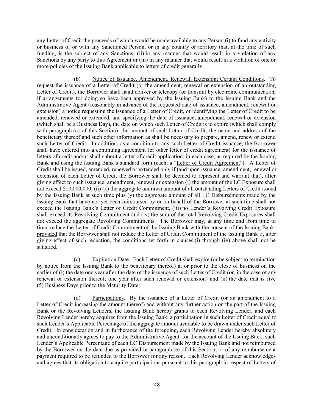 any Letter of Credit the proceeds of which would be made available to any Person (i) to fund any activity or business of or with any Sanctioned Person, or in any country or territory that, at the time of such funding, is the subject of any Sanctions, (ii) in any manner that would result in a violation of any Sanctions by any party to this Agreement or (iii) in any manner that would result in a violation of one or more policies of the Issuing Bank applicable to letters of credit generally. (b) Notice of Issuance, Amendment, Renewal, Extension; Certain Conditions. To request the issuance of a Letter of Credit (or the amendment, renewal or extension of an outstanding Letter of Credit), the Borrower shall hand deliver or telecopy (or transmit by electronic communication, if arrangements for doing so have been approved by the Issuing Bank) to the Issuing Bank and the Administrative Agent (reasonably in advance of the requested date of issuance, amendment, renewal or extension) a notice requesting the issuance of a Letter of Credit, or identifying the Letter of Credit to be amended, renewed or extended, and specifying the date of issuance, amendment, renewal or extension (which shall be a Business Day), the date on which such Letter of Credit is to expire (which shall comply with paragraph (c) of this Section), the amount of such Letter of Credit, the name and address of the beneficiary thereof and such other information as shall be necessary to prepare, amend, renew or extend such Letter of Credit. In addition, as a condition to any such Letter of Credit issuance, the Borrower shall have entered into a continuing agreement (or other letter of credit agreement) for the issuance of letters of credit and/or shall submit a letter of credit application, in each case, as required by the Issuing Bank and using the Issuing Bank’s standard form (each, a “Letter of Credit Agreement”). A Letter of Credit shall be issued, amended, renewed or extended only if (and upon issuance, amendment, renewal or extension of each Letter of Credit the Borrower shall be deemed to represent and warrant that), after giving effect to such issuance, amendment, renewal or extension (i) the amount of the LC Exposure shall not exceed $10,000,000, (ii) (x) the aggregate undrawn amount of all outstanding Letters of Credit issued by the Issuing Bank at such time plus (y) the aggregate amount of all LC Disbursements made by the Issuing Bank that have not yet been reimbursed by or on behalf of the Borrower at such time shall not exceed the Issuing Bank’s Letter of Credit Commitment, (iii) no Lender’s Revolving Credit Exposure shall exceed its Revolving Commitment and (iv) the sum of the total Revolving Credit Exposures shall not exceed the aggregate Revolving Commitments. The Borrower may, at any time and from time to time, reduce the Letter of Credit Commitment of the Issuing Bank with the consent of the Issuing Bank; provided that the Borrower shall not reduce the Letter of Credit Commitment of the Issuing Bank if, after giving effect of such reduction, the conditions set forth in clauses (i) through (iv) above shall not be satisfied. (c) Expiration Date. Each Letter of Credit shall expire (or be subject to termination by notice from the Issuing Bank to the beneficiary thereof) at or prior to the close of business on the earlier of (i) the date one year after the date of the issuance of such Letter of Credit (or, in the case of any renewal or extension thereof, one year after such renewal or extension) and (ii) the date that is five (5) Business Days prior to the Maturity Date. (d) Participations. By the issuance of a Letter of Credit (or an amendment to a Letter of Credit increasing the amount thereof) and without any further action on the part of the Issuing Bank or the Revolving Lenders, the Issuing Bank hereby grants to each Revolving Lender, and each Revolving Lender hereby acquires from the Issuing Bank, a participation in such Letter of Credit equal to such Lender’s Applicable Percentage of the aggregate amount available to be drawn under such Letter of Credit. In consideration and in furtherance of the foregoing, each Revolving Lender hereby absolutely and unconditionally agrees to pay to the Administrative Agent, for the account of the Issuing Bank, such Lender’s Applicable Percentage of each LC Disbursement made by the Issuing Bank and not reimbursed by the Borrower on the date due as provided in paragraph (e) of this Section, or of any reimbursement payment required to be refunded to the Borrower for any reason. Each Revolving Lender acknowledges and agrees that its obligation to acquire participations pursuant to this paragraph in respect of Letters of 48