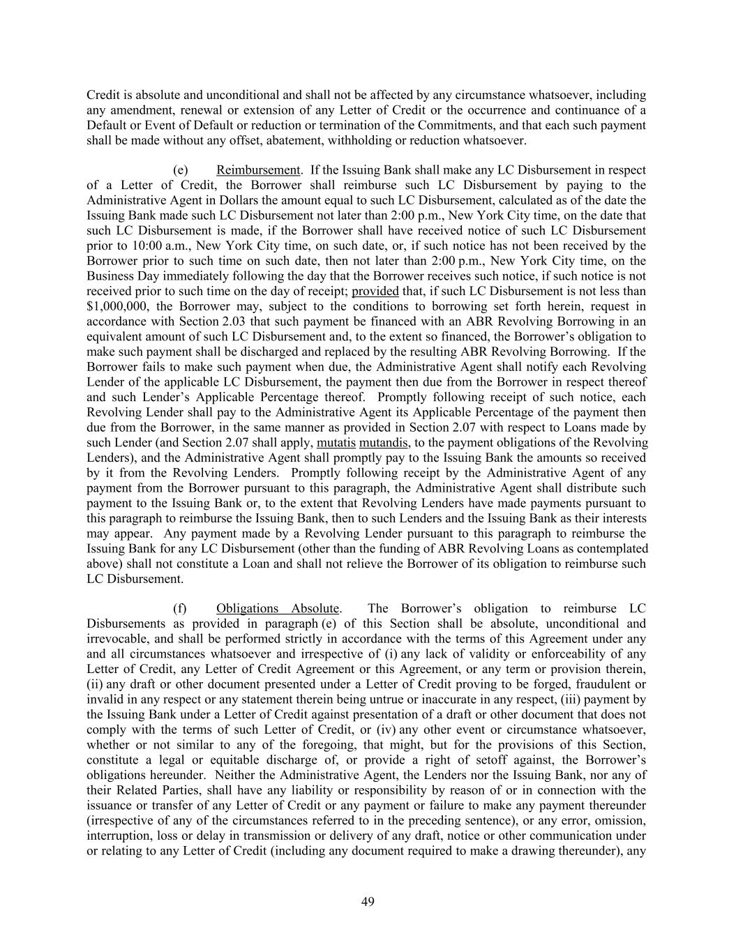 Credit is absolute and unconditional and shall not be affected by any circumstance whatsoever, including any amendment, renewal or extension of any Letter of Credit or the occurrence and continuance of a Default or Event of Default or reduction or termination of the Commitments, and that each such payment shall be made without any offset, abatement, withholding or reduction whatsoever. (e) Reimbursement. If the Issuing Bank shall make any LC Disbursement in respect of a Letter of Credit, the Borrower shall reimburse such LC Disbursement by paying to the Administrative Agent in Dollars the amount equal to such LC Disbursement, calculated as of the date the Issuing Bank made such LC Disbursement not later than 2:00 p.m., New York City time, on the date that such LC Disbursement is made, if the Borrower shall have received notice of such LC Disbursement prior to 10:00 a.m., New York City time, on such date, or, if such notice has not been received by the Borrower prior to such time on such date, then not later than 2:00 p.m., New York City time, on the Business Day immediately following the day that the Borrower receives such notice, if such notice is not received prior to such time on the day of receipt; provided that, if such LC Disbursement is not less than $1,000,000, the Borrower may, subject to the conditions to borrowing set forth herein, request in accordance with Section 2.03 that such payment be financed with an ABR Revolving Borrowing in an equivalent amount of such LC Disbursement and, to the extent so financed, the Borrower’s obligation to make such payment shall be discharged and replaced by the resulting ABR Revolving Borrowing. If the Borrower fails to make such payment when due, the Administrative Agent shall notify each Revolving Lender of the applicable LC Disbursement, the payment then due from the Borrower in respect thereof and such Lender’s Applicable Percentage thereof. Promptly following receipt of such notice, each Revolving Lender shall pay to the Administrative Agent its Applicable Percentage of the payment then due from the Borrower, in the same manner as provided in Section 2.07 with respect to Loans made by such Lender (and Section 2.07 shall apply, mutatis mutandis, to the payment obligations of the Revolving Lenders), and the Administrative Agent shall promptly pay to the Issuing Bank the amounts so received by it from the Revolving Lenders. Promptly following receipt by the Administrative Agent of any payment from the Borrower pursuant to this paragraph, the Administrative Agent shall distribute such payment to the Issuing Bank or, to the extent that Revolving Lenders have made payments pursuant to this paragraph to reimburse the Issuing Bank, then to such Lenders and the Issuing Bank as their interests may appear. Any payment made by a Revolving Lender pursuant to this paragraph to reimburse the Issuing Bank for any LC Disbursement (other than the funding of ABR Revolving Loans as contemplated above) shall not constitute a Loan and shall not relieve the Borrower of its obligation to reimburse such LC Disbursement. (f) Obligations Absolute. The Borrower’s obligation to reimburse LC Disbursements as provided in paragraph (e) of this Section shall be absolute, unconditional and irrevocable, and shall be performed strictly in accordance with the terms of this Agreement under any and all circumstances whatsoever and irrespective of (i) any lack of validity or enforceability of any Letter of Credit, any Letter of Credit Agreement or this Agreement, or any term or provision therein, (ii) any draft or other document presented under a Letter of Credit proving to be forged, fraudulent or invalid in any respect or any statement therein being untrue or inaccurate in any respect, (iii) payment by the Issuing Bank under a Letter of Credit against presentation of a draft or other document that does not comply with the terms of such Letter of Credit, or (iv) any other event or circumstance whatsoever, whether or not similar to any of the foregoing, that might, but for the provisions of this Section, constitute a legal or equitable discharge of, or provide a right of setoff against, the Borrower’s obligations hereunder. Neither the Administrative Agent, the Lenders nor the Issuing Bank, nor any of their Related Parties, shall have any liability or responsibility by reason of or in connection with the issuance or transfer of any Letter of Credit or any payment or failure to make any payment thereunder (irrespective of any of the circumstances referred to in the preceding sentence), or any error, omission, interruption, loss or delay in transmission or delivery of any draft, notice or other communication under or relating to any Letter of Credit (including any document required to make a drawing thereunder), any 49