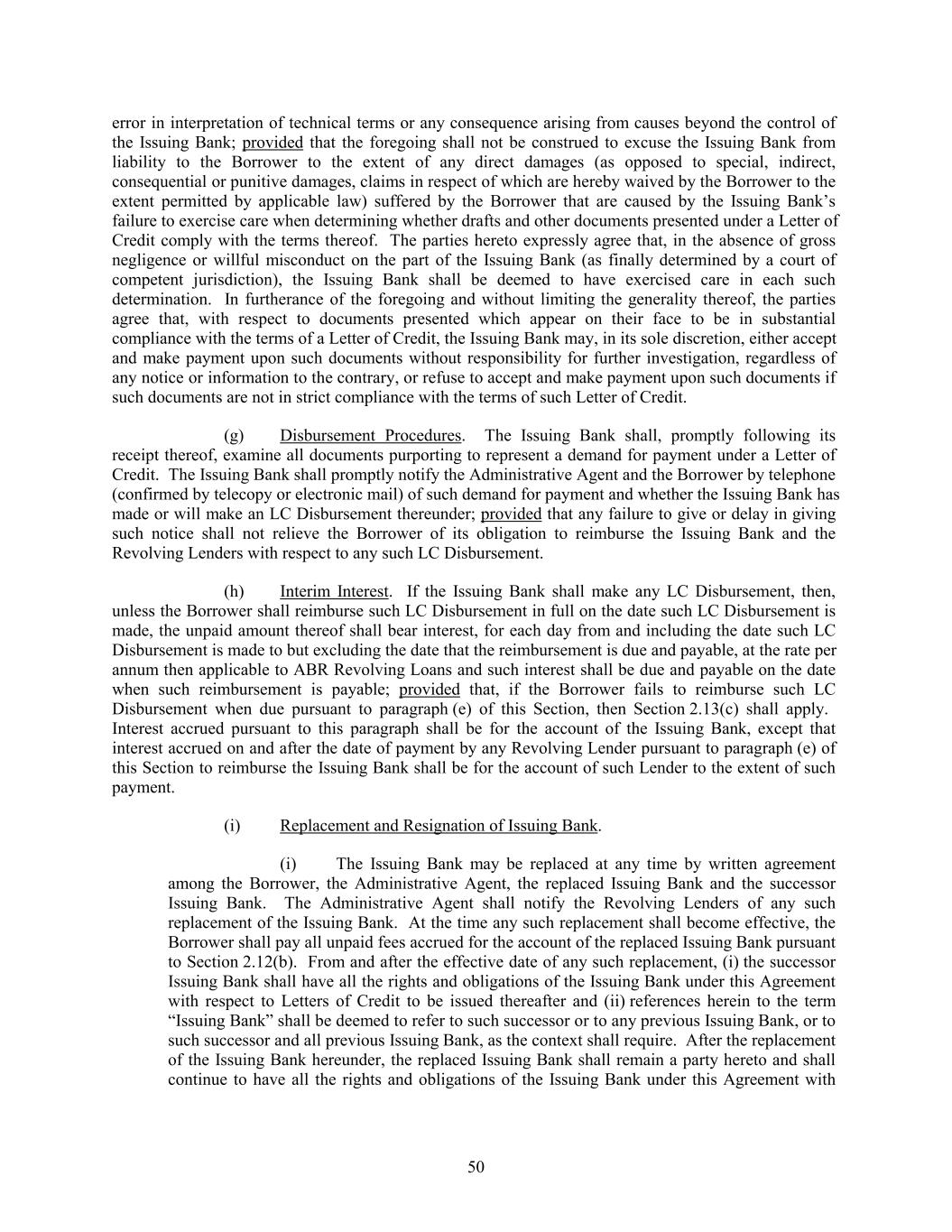 error in interpretation of technical terms or any consequence arising from causes beyond the control of the Issuing Bank; provided that the foregoing shall not be construed to excuse the Issuing Bank from liability to the Borrower to the extent of any direct damages (as opposed to special, indirect, consequential or punitive damages, claims in respect of which are hereby waived by the Borrower to the extent permitted by applicable law) suffered by the Borrower that are caused by the Issuing Bank’s failure to exercise care when determining whether drafts and other documents presented under a Letter of Credit comply with the terms thereof. The parties hereto expressly agree that, in the absence of gross negligence or willful misconduct on the part of the Issuing Bank (as finally determined by a court of competent jurisdiction), the Issuing Bank shall be deemed to have exercised care in each such determination. In furtherance of the foregoing and without limiting the generality thereof, the parties agree that, with respect to documents presented which appear on their face to be in substantial compliance with the terms of a Letter of Credit, the Issuing Bank may, in its sole discretion, either accept and make payment upon such documents without responsibility for further investigation, regardless of any notice or information to the contrary, or refuse to accept and make payment upon such documents if such documents are not in strict compliance with the terms of such Letter of Credit. (g) Disbursement Procedures. The Issuing Bank shall, promptly following its receipt thereof, examine all documents purporting to represent a demand for payment under a Letter of Credit. The Issuing Bank shall promptly notify the Administrative Agent and the Borrower by telephone (confirmed by telecopy or electronic mail) of such demand for payment and whether the Issuing Bank has made or will make an LC Disbursement thereunder; provided that any failure to give or delay in giving such notice shall not relieve the Borrower of its obligation to reimburse the Issuing Bank and the Revolving Lenders with respect to any such LC Disbursement. (h) Interim Interest. If the Issuing Bank shall make any LC Disbursement, then, unless the Borrower shall reimburse such LC Disbursement in full on the date such LC Disbursement is made, the unpaid amount thereof shall bear interest, for each day from and including the date such LC Disbursement is made to but excluding the date that the reimbursement is due and payable, at the rate per annum then applicable to ABR Revolving Loans and such interest shall be due and payable on the date when such reimbursement is payable; provided that, if the Borrower fails to reimburse such LC Disbursement when due pursuant to paragraph (e) of this Section, then Section 2.13(c) shall apply. Interest accrued pursuant to this paragraph shall be for the account of the Issuing Bank, except that interest accrued on and after the date of payment by any Revolving Lender pursuant to paragraph (e) of this Section to reimburse the Issuing Bank shall be for the account of such Lender to the extent of such payment. (i) Replacement and Resignation of Issuing Bank. (i) The Issuing Bank may be replaced at any time by written agreement among the Borrower, the Administrative Agent, the replaced Issuing Bank and the successor Issuing Bank. The Administrative Agent shall notify the Revolving Lenders of any such replacement of the Issuing Bank. At the time any such replacement shall become effective, the Borrower shall pay all unpaid fees accrued for the account of the replaced Issuing Bank pursuant to Section 2.12(b). From and after the effective date of any such replacement, (i) the successor Issuing Bank shall have all the rights and obligations of the Issuing Bank under this Agreement with respect to Letters of Credit to be issued thereafter and (ii) references herein to the term “Issuing Bank” shall be deemed to refer to such successor or to any previous Issuing Bank, or to such successor and all previous Issuing Bank, as the context shall require. After the replacement of the Issuing Bank hereunder, the replaced Issuing Bank shall remain a party hereto and shall continue to have all the rights and obligations of the Issuing Bank under this Agreement with 50