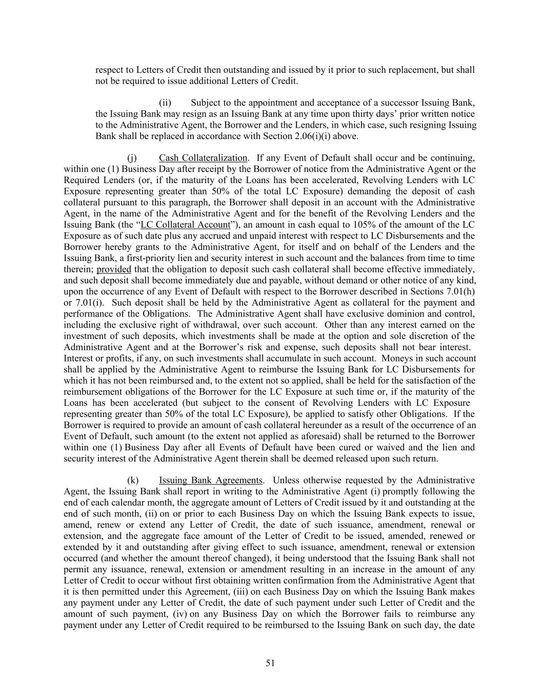respect to Letters of Credit then outstanding and issued by it prior to such replacement, but shall not be required to issue additional Letters of Credit. (ii) Subject to the appointment and acceptance of a successor Issuing Bank, the Issuing Bank may resign as an Issuing Bank at any time upon thirty days’ prior written notice to the Administrative Agent, the Borrower and the Lenders, in which case, such resigning Issuing Bank shall be replaced in accordance with Section 2.06(i)(i) above. (j) Cash Collateralization. If any Event of Default shall occur and be continuing, within one (1) Business Day after receipt by the Borrower of notice from the Administrative Agent or the Required Lenders (or, if the maturity of the Loans has been accelerated, Revolving Lenders with LC Exposure representing greater than 50% of the total LC Exposure) demanding the deposit of cash collateral pursuant to this paragraph, the Borrower shall deposit in an account with the Administrative Agent, in the name of the Administrative Agent and for the benefit of the Revolving Lenders and the Issuing Bank (the “LC Collateral Account”), an amount in cash equal to 105% of the amount of the LC Exposure as of such date plus any accrued and unpaid interest with respect to LC Disbursements and the Borrower hereby grants to the Administrative Agent, for itself and on behalf of the Lenders and the Issuing Bank, a first-priority lien and security interest in such account and the balances from time to time therein; provided that the obligation to deposit such cash collateral shall become effective immediately, and such deposit shall become immediately due and payable, without demand or other notice of any kind, upon the occurrence of any Event of Default with respect to the Borrower described in Sections 7.01(h) or 7.01(i). Such deposit shall be held by the Administrative Agent as collateral for the payment and performance of the Obligations. The Administrative Agent shall have exclusive dominion and control, including the exclusive right of withdrawal, over such account. Other than any interest earned on the investment of such deposits, which investments shall be made at the option and sole discretion of the Administrative Agent and at the Borrower’s risk and expense, such deposits shall not bear interest. Interest or profits, if any, on such investments shall accumulate in such account. Moneys in such account shall be applied by the Administrative Agent to reimburse the Issuing Bank for LC Disbursements for which it has not been reimbursed and, to the extent not so applied, shall be held for the satisfaction of the reimbursement obligations of the Borrower for the LC Exposure at such time or, if the maturity of the Loans has been accelerated (but subject to the consent of Revolving Lenders with LC Exposure representing greater than 50% of the total LC Exposure), be applied to satisfy other Obligations. If the Borrower is required to provide an amount of cash collateral hereunder as a result of the occurrence of an Event of Default, such amount (to the extent not applied as aforesaid) shall be returned to the Borrower within one (1) Business Day after all Events of Default have been cured or waived and the lien and security interest of the Administrative Agent therein shall be deemed released upon such return. (k) Issuing Bank Agreements. Unless otherwise requested by the Administrative Agent, the Issuing Bank shall report in writing to the Administrative Agent (i) promptly following the end of each calendar month, the aggregate amount of Letters of Credit issued by it and outstanding at the end of such month, (ii) on or prior to each Business Day on which the Issuing Bank expects to issue, amend, renew or extend any Letter of Credit, the date of such issuance, amendment, renewal or extension, and the aggregate face amount of the Letter of Credit to be issued, amended, renewed or extended by it and outstanding after giving effect to such issuance, amendment, renewal or extension occurred (and whether the amount thereof changed), it being understood that the Issuing Bank shall not permit any issuance, renewal, extension or amendment resulting in an increase in the amount of any Letter of Credit to occur without first obtaining written confirmation from the Administrative Agent that it is then permitted under this Agreement, (iii) on each Business Day on which the Issuing Bank makes any payment under any Letter of Credit, the date of such payment under such Letter of Credit and the amount of such payment, (iv) on any Business Day on which the Borrower fails to reimburse any payment under any Letter of Credit required to be reimbursed to the Issuing Bank on such day, the date 51