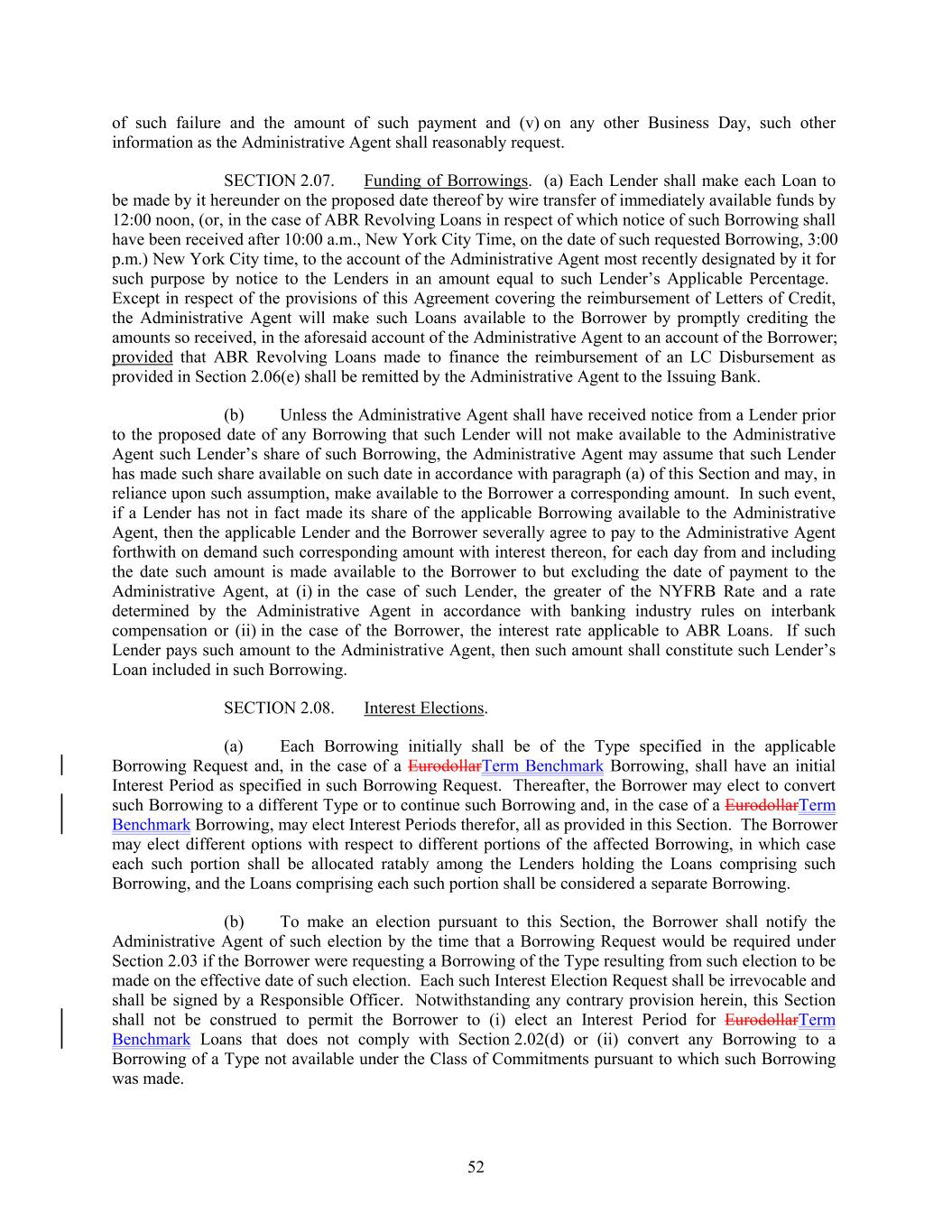 of such failure and the amount of such payment and (v) on any other Business Day, such other information as the Administrative Agent shall reasonably request. SECTION 2.07. Funding of Borrowings. (a) Each Lender shall make each Loan to be made by it hereunder on the proposed date thereof by wire transfer of immediately available funds by 12:00 noon, (or, in the case of ABR Revolving Loans in respect of which notice of such Borrowing shall have been received after 10:00 a.m., New York City Time, on the date of such requested Borrowing, 3:00 p.m.) New York City time, to the account of the Administrative Agent most recently designated by it for such purpose by notice to the Lenders in an amount equal to such Lender’s Applicable Percentage. Except in respect of the provisions of this Agreement covering the reimbursement of Letters of Credit, the Administrative Agent will make such Loans available to the Borrower by promptly crediting the amounts so received, in the aforesaid account of the Administrative Agent to an account of the Borrower; provided that ABR Revolving Loans made to finance the reimbursement of an LC Disbursement as provided in Section 2.06(e) shall be remitted by the Administrative Agent to the Issuing Bank. (b) Unless the Administrative Agent shall have received notice from a Lender prior to the proposed date of any Borrowing that such Lender will not make available to the Administrative Agent such Lender’s share of such Borrowing, the Administrative Agent may assume that such Lender has made such share available on such date in accordance with paragraph (a) of this Section and may, in reliance upon such assumption, make available to the Borrower a corresponding amount. In such event, if a Lender has not in fact made its share of the applicable Borrowing available to the Administrative Agent, then the applicable Lender and the Borrower severally agree to pay to the Administrative Agent forthwith on demand such corresponding amount with interest thereon, for each day from and including the date such amount is made available to the Borrower to but excluding the date of payment to the Administrative Agent, at (i) in the case of such Lender, the greater of the NYFRB Rate and a rate determined by the Administrative Agent in accordance with banking industry rules on interbank compensation or (ii) in the case of the Borrower, the interest rate applicable to ABR Loans. If such Lender pays such amount to the Administrative Agent, then such amount shall constitute such Lender’s Loan included in such Borrowing. SECTION 2.08. Interest Elections. (a) Each Borrowing initially shall be of the Type specified in the applicable Borrowing Request and, in the case of a EurodollarTerm Benchmark Borrowing, shall have an initial Interest Period as specified in such Borrowing Request. Thereafter, the Borrower may elect to convert such Borrowing to a different Type or to continue such Borrowing and, in the case of a EurodollarTerm Benchmark Borrowing, may elect Interest Periods therefor, all as provided in this Section. The Borrower may elect different options with respect to different portions of the affected Borrowing, in which case each such portion shall be allocated ratably among the Lenders holding the Loans comprising such Borrowing, and the Loans comprising each such portion shall be considered a separate Borrowing. (b) To make an election pursuant to this Section, the Borrower shall notify the Administrative Agent of such election by the time that a Borrowing Request would be required under Section 2.03 if the Borrower were requesting a Borrowing of the Type resulting from such election to be made on the effective date of such election. Each such Interest Election Request shall be irrevocable and shall be signed by a Responsible Officer. Notwithstanding any contrary provision herein, this Section shall not be construed to permit the Borrower to (i) elect an Interest Period for EurodollarTerm Benchmark Loans that does not comply with Section 2.02(d) or (ii) convert any Borrowing to a Borrowing of a Type not available under the Class of Commitments pursuant to which such Borrowing was made. 52