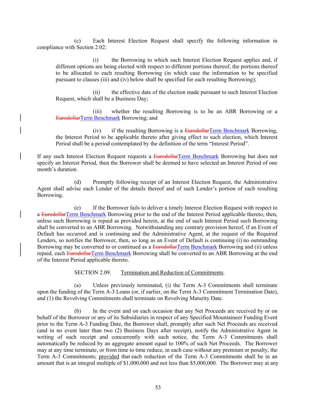 (c) Each Interest Election Request shall specify the following information in compliance with Section 2.02: (i) the Borrowing to which such Interest Election Request applies and, if different options are being elected with respect to different portions thereof, the portions thereof to be allocated to each resulting Borrowing (in which case the information to be specified pursuant to clauses (iii) and (iv) below shall be specified for each resulting Borrowing); (ii) the effective date of the election made pursuant to such Interest Election Request, which shall be a Business Day; (iii) whether the resulting Borrowing is to be an ABR Borrowing or a EurodollarTerm Benchmark Borrowing; and (iv) if the resulting Borrowing is a EurodollarTerm Benchmark Borrowing, the Interest Period to be applicable thereto after giving effect to such election, which Interest Period shall be a period contemplated by the definition of the term “Interest Period”. If any such Interest Election Request requests a EurodollarTerm Benchmark Borrowing but does not specify an Interest Period, then the Borrower shall be deemed to have selected an Interest Period of one month’s duration. (d) Promptly following receipt of an Interest Election Request, the Administrative Agent shall advise each Lender of the details thereof and of such Lender’s portion of each resulting Borrowing. (e) If the Borrower fails to deliver a timely Interest Election Request with respect to a EurodollarTerm Benchmark Borrowing prior to the end of the Interest Period applicable thereto, then, unless such Borrowing is repaid as provided herein, at the end of such Interest Period such Borrowing shall be converted to an ABR Borrowing. Notwithstanding any contrary provision hereof, if an Event of Default has occurred and is continuing and the Administrative Agent, at the request of the Required Lenders, so notifies the Borrower, then, so long as an Event of Default is continuing (i) no outstanding Borrowing may be converted to or continued as a EurodollarTerm Benchmark Borrowing and (ii) unless repaid, each EurodollarTerm Benchmark Borrowing shall be converted to an ABR Borrowing at the end of the Interest Period applicable thereto. SECTION 2.09. Termination and Reduction of Commitments. (a) Unless previously terminated, (i) the Term A-3 Commitments shall terminate upon the funding of the Term A-3 Loans (or, if earlier, on the Term A-3 Commitment Termination Date), and (1) the Revolving Commitments shall terminate on Revolving Maturity Date. (b) In the event and on each occasion that any Net Proceeds are received by or on behalf of the Borrower or any of its Subsidiaries in respect of any Specified Mountaineer Funding Event prior to the Term A-3 Funding Date, the Borrower shall, promptly after such Net Proceeds are received (and in no event later than two (2) Business Days after receipt), notify the Administrative Agent in writing of such receipt and concurrently with such notice, the Term A-3 Commitments shall automatically be reduced by an aggregate amount equal to 100% of such Net Proceeds. The Borrower may at any time terminate, or from time to time reduce, in each case without any premium or penalty, the Term A-3 Commitments; provided that each reduction of the Term A-3 Commitments shall be in an amount that is an integral multiple of $1,000,000 and not less than $5,000,000. The Borrower may at any 53