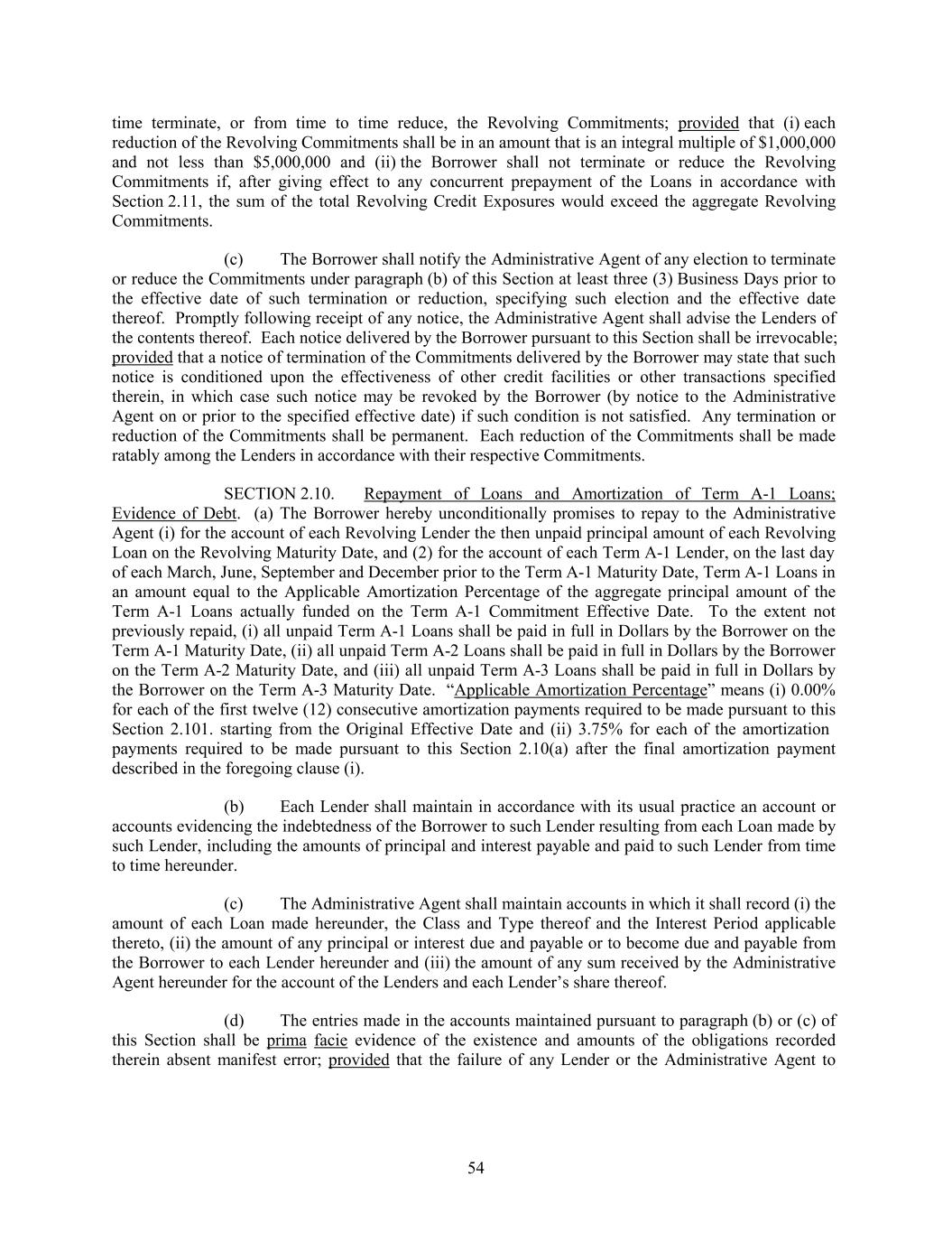 time terminate, or from time to time reduce, the Revolving Commitments; provided that (i) each reduction of the Revolving Commitments shall be in an amount that is an integral multiple of $1,000,000 and not less than $5,000,000 and (ii) the Borrower shall not terminate or reduce the Revolving Commitments if, after giving effect to any concurrent prepayment of the Loans in accordance with Section 2.11, the sum of the total Revolving Credit Exposures would exceed the aggregate Revolving Commitments. (c) The Borrower shall notify the Administrative Agent of any election to terminate or reduce the Commitments under paragraph (b) of this Section at least three (3) Business Days prior to the effective date of such termination or reduction, specifying such election and the effective date thereof. Promptly following receipt of any notice, the Administrative Agent shall advise the Lenders of the contents thereof. Each notice delivered by the Borrower pursuant to this Section shall be irrevocable; provided that a notice of termination of the Commitments delivered by the Borrower may state that such notice is conditioned upon the effectiveness of other credit facilities or other transactions specified therein, in which case such notice may be revoked by the Borrower (by notice to the Administrative Agent on or prior to the specified effective date) if such condition is not satisfied. Any termination or reduction of the Commitments shall be permanent. Each reduction of the Commitments shall be made ratably among the Lenders in accordance with their respective Commitments. SECTION 2.10. Repayment of Loans and Amortization of Term A-1 Loans; Evidence of Debt. (a) The Borrower hereby unconditionally promises to repay to the Administrative Agent (i) for the account of each Revolving Lender the then unpaid principal amount of each Revolving Loan on the Revolving Maturity Date, and (2) for the account of each Term A-1 Lender, on the last day of each March, June, September and December prior to the Term A-1 Maturity Date, Term A-1 Loans in an amount equal to the Applicable Amortization Percentage of the aggregate principal amount of the Term A-1 Loans actually funded on the Term A-1 Commitment Effective Date. To the extent not previously repaid, (i) all unpaid Term A-1 Loans shall be paid in full in Dollars by the Borrower on the Term A-1 Maturity Date, (ii) all unpaid Term A-2 Loans shall be paid in full in Dollars by the Borrower on the Term A-2 Maturity Date, and (iii) all unpaid Term A-3 Loans shall be paid in full in Dollars by the Borrower on the Term A-3 Maturity Date. “Applicable Amortization Percentage” means (i) 0.00% for each of the first twelve (12) consecutive amortization payments required to be made pursuant to this Section 2.101. starting from the Original Effective Date and (ii) 3.75% for each of the amortization payments required to be made pursuant to this Section 2.10(a) after the final amortization payment described in the foregoing clause (i). (b) Each Lender shall maintain in accordance with its usual practice an account or accounts evidencing the indebtedness of the Borrower to such Lender resulting from each Loan made by such Lender, including the amounts of principal and interest payable and paid to such Lender from time to time hereunder. (c) The Administrative Agent shall maintain accounts in which it shall record (i) the amount of each Loan made hereunder, the Class and Type thereof and the Interest Period applicable thereto, (ii) the amount of any principal or interest due and payable or to become due and payable from the Borrower to each Lender hereunder and (iii) the amount of any sum received by the Administrative Agent hereunder for the account of the Lenders and each Lender’s share thereof. (d) The entries made in the accounts maintained pursuant to paragraph (b) or (c) of this Section shall be prima facie evidence of the existence and amounts of the obligations recorded therein absent manifest error; provided that the failure of any Lender or the Administrative Agent to 54