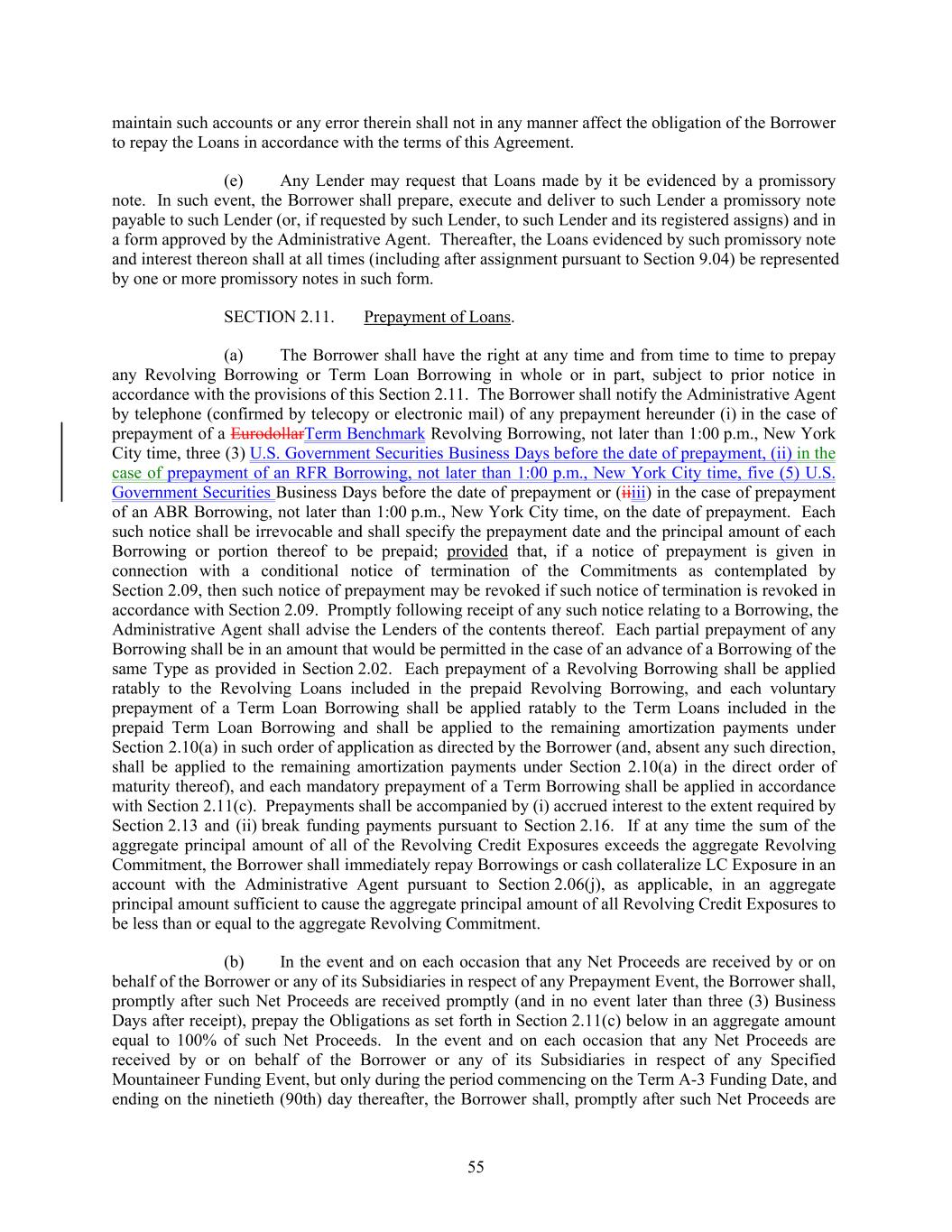 maintain such accounts or any error therein shall not in any manner affect the obligation of the Borrower to repay the Loans in accordance with the terms of this Agreement. (e) Any Lender may request that Loans made by it be evidenced by a promissory note. In such event, the Borrower shall prepare, execute and deliver to such Lender a promissory note payable to such Lender (or, if requested by such Lender, to such Lender and its registered assigns) and in a form approved by the Administrative Agent. Thereafter, the Loans evidenced by such promissory note and interest thereon shall at all times (including after assignment pursuant to Section 9.04) be represented by one or more promissory notes in such form. SECTION 2.11. Prepayment of Loans. (a) The Borrower shall have the right at any time and from time to time to prepay any Revolving Borrowing or Term Loan Borrowing in whole or in part, subject to prior notice in accordance with the provisions of this Section 2.11. The Borrower shall notify the Administrative Agent by telephone (confirmed by telecopy or electronic mail) of any prepayment hereunder (i) in the case of prepayment of a EurodollarTerm Benchmark Revolving Borrowing, not later than 1:00 p.m., New York City time, three (3) U.S. Government Securities Business Days before the date of prepayment, (ii) in the case of prepayment of an RFR Borrowing, not later than 1:00 p.m., New York City time, five (5) U.S. Government Securities Business Days before the date of prepayment or (iiiii) in the case of prepayment of an ABR Borrowing, not later than 1:00 p.m., New York City time, on the date of prepayment. Each such notice shall be irrevocable and shall specify the prepayment date and the principal amount of each Borrowing or portion thereof to be prepaid; provided that, if a notice of prepayment is given in connection with a conditional notice of termination of the Commitments as contemplated by Section 2.09, then such notice of prepayment may be revoked if such notice of termination is revoked in accordance with Section 2.09. Promptly following receipt of any such notice relating to a Borrowing, the Administrative Agent shall advise the Lenders of the contents thereof. Each partial prepayment of any Borrowing shall be in an amount that would be permitted in the case of an advance of a Borrowing of the same Type as provided in Section 2.02. Each prepayment of a Revolving Borrowing shall be applied ratably to the Revolving Loans included in the prepaid Revolving Borrowing, and each voluntary prepayment of a Term Loan Borrowing shall be applied ratably to the Term Loans included in the prepaid Term Loan Borrowing and shall be applied to the remaining amortization payments under Section 2.10(a) in such order of application as directed by the Borrower (and, absent any such direction, shall be applied to the remaining amortization payments under Section 2.10(a) in the direct order of maturity thereof), and each mandatory prepayment of a Term Borrowing shall be applied in accordance with Section 2.11(c). Prepayments shall be accompanied by (i) accrued interest to the extent required by Section 2.13 and (ii) break funding payments pursuant to Section 2.16. If at any time the sum of the aggregate principal amount of all of the Revolving Credit Exposures exceeds the aggregate Revolving Commitment, the Borrower shall immediately repay Borrowings or cash collateralize LC Exposure in an account with the Administrative Agent pursuant to Section 2.06(j), as applicable, in an aggregate principal amount sufficient to cause the aggregate principal amount of all Revolving Credit Exposures to be less than or equal to the aggregate Revolving Commitment. (b) In the event and on each occasion that any Net Proceeds are received by or on behalf of the Borrower or any of its Subsidiaries in respect of any Prepayment Event, the Borrower shall, promptly after such Net Proceeds are received promptly (and in no event later than three (3) Business Days after receipt), prepay the Obligations as set forth in Section 2.11(c) below in an aggregate amount equal to 100% of such Net Proceeds. In the event and on each occasion that any Net Proceeds are received by or on behalf of the Borrower or any of its Subsidiaries in respect of any Specified Mountaineer Funding Event, but only during the period commencing on the Term A-3 Funding Date, and ending on the ninetieth (90th) day thereafter, the Borrower shall, promptly after such Net Proceeds are 55