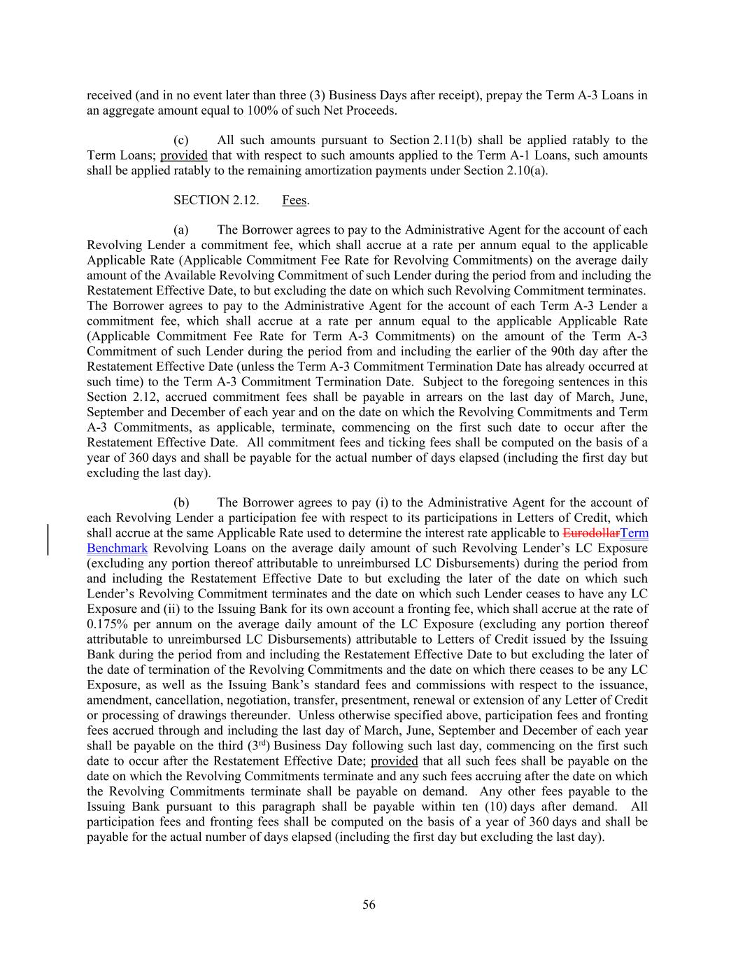 received (and in no event later than three (3) Business Days after receipt), prepay the Term A-3 Loans in an aggregate amount equal to 100% of such Net Proceeds. (c) All such amounts pursuant to Section 2.11(b) shall be applied ratably to the Term Loans; provided that with respect to such amounts applied to the Term A-1 Loans, such amounts shall be applied ratably to the remaining amortization payments under Section 2.10(a). SECTION 2.12. Fees. (a) The Borrower agrees to pay to the Administrative Agent for the account of each Revolving Lender a commitment fee, which shall accrue at a rate per annum equal to the applicable Applicable Rate (Applicable Commitment Fee Rate for Revolving Commitments) on the average daily amount of the Available Revolving Commitment of such Lender during the period from and including the Restatement Effective Date, to but excluding the date on which such Revolving Commitment terminates. The Borrower agrees to pay to the Administrative Agent for the account of each Term A-3 Lender a commitment fee, which shall accrue at a rate per annum equal to the applicable Applicable Rate (Applicable Commitment Fee Rate for Term A-3 Commitments) on the amount of the Term A-3 Commitment of such Lender during the period from and including the earlier of the 90th day after the Restatement Effective Date (unless the Term A-3 Commitment Termination Date has already occurred at such time) to the Term A-3 Commitment Termination Date. Subject to the foregoing sentences in this Section 2.12, accrued commitment fees shall be payable in arrears on the last day of March, June, September and December of each year and on the date on which the Revolving Commitments and Term A-3 Commitments, as applicable, terminate, commencing on the first such date to occur after the Restatement Effective Date. All commitment fees and ticking fees shall be computed on the basis of a year of 360 days and shall be payable for the actual number of days elapsed (including the first day but excluding the last day). (b) The Borrower agrees to pay (i) to the Administrative Agent for the account of each Revolving Lender a participation fee with respect to its participations in Letters of Credit, which shall accrue at the same Applicable Rate used to determine the interest rate applicable to EurodollarTerm Benchmark Revolving Loans on the average daily amount of such Revolving Lender’s LC Exposure (excluding any portion thereof attributable to unreimbursed LC Disbursements) during the period from and including the Restatement Effective Date to but excluding the later of the date on which such Lender’s Revolving Commitment terminates and the date on which such Lender ceases to have any LC Exposure and (ii) to the Issuing Bank for its own account a fronting fee, which shall accrue at the rate of 0.175% per annum on the average daily amount of the LC Exposure (excluding any portion thereof attributable to unreimbursed LC Disbursements) attributable to Letters of Credit issued by the Issuing Bank during the period from and including the Restatement Effective Date to but excluding the later of the date of termination of the Revolving Commitments and the date on which there ceases to be any LC Exposure, as well as the Issuing Bank’s standard fees and commissions with respect to the issuance, amendment, cancellation, negotiation, transfer, presentment, renewal or extension of any Letter of Credit or processing of drawings thereunder. Unless otherwise specified above, participation fees and fronting fees accrued through and including the last day of March, June, September and December of each year shall be payable on the third (3rd) Business Day following such last day, commencing on the first such date to occur after the Restatement Effective Date; provided that all such fees shall be payable on the date on which the Revolving Commitments terminate and any such fees accruing after the date on which the Revolving Commitments terminate shall be payable on demand. Any other fees payable to the Issuing Bank pursuant to this paragraph shall be payable within ten (10) days after demand. All participation fees and fronting fees shall be computed on the basis of a year of 360 days and shall be payable for the actual number of days elapsed (including the first day but excluding the last day). 56