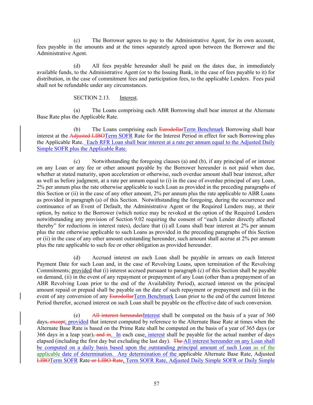 (c) The Borrower agrees to pay to the Administrative Agent, for its own account, fees payable in the amounts and at the times separately agreed upon between the Borrower and the Administrative Agent. (d) All fees payable hereunder shall be paid on the dates due, in immediately available funds, to the Administrative Agent (or to the Issuing Bank, in the case of fees payable to it) for distribution, in the case of commitment fees and participation fees, to the applicable Lenders. Fees paid shall not be refundable under any circumstances. SECTION 2.13. Interest. (a) The Loans comprising each ABR Borrowing shall bear interest at the Alternate Base Rate plus the Applicable Rate. (b) The Loans comprising each EurodollarTerm Benchmark Borrowing shall bear interest at the Adjusted LIBOTerm SOFR Rate for the Interest Period in effect for such Borrowing plus the Applicable Rate. Each RFR Loan shall bear interest at a rate per annum equal to the Adjusted Daily Simple SOFR plus the Applicable Rate. (c) Notwithstanding the foregoing clauses (a) and (b), if any principal of or interest on any Loan or any fee or other amount payable by the Borrower hereunder is not paid when due, whether at stated maturity, upon acceleration or otherwise, such overdue amount shall bear interest, after as well as before judgment, at a rate per annum equal to (i) in the case of overdue principal of any Loan, 2% per annum plus the rate otherwise applicable to such Loan as provided in the preceding paragraphs of this Section or (ii) in the case of any other amount, 2% per annum plus the rate applicable to ABR Loans as provided in paragraph (a) of this Section. Notwithstanding the foregoing, during the occurrence and continuance of an Event of Default, the Administrative Agent or the Required Lenders may, at their option, by notice to the Borrower (which notice may be revoked at the option of the Required Lenders notwithstanding any provision of Section 9.02 requiring the consent of “each Lender directly affected thereby” for reductions in interest rates), declare that (i) all Loans shall bear interest at 2% per annum plus the rate otherwise applicable to such Loans as provided in the preceding paragraphs of this Section or (ii) in the case of any other amount outstanding hereunder, such amount shall accrue at 2% per annum plus the rate applicable to such fee or other obligation as provided hereunder. (d) Accrued interest on each Loan shall be payable in arrears on each Interest Payment Date for such Loan and, in the case of Revolving Loans, upon termination of the Revolving Commitments; provided that (i) interest accrued pursuant to paragraph (c) of this Section shall be payable on demand, (ii) in the event of any repayment or prepayment of any Loan (other than a prepayment of an ABR Revolving Loan prior to the end of the Availability Period), accrued interest on the principal amount repaid or prepaid shall be payable on the date of such repayment or prepayment and (iii) in the event of any conversion of any EurodollarTerm Benchmark Loan prior to the end of the current Interest Period therefor, accrued interest on such Loan shall be payable on the effective date of such conversion. (e) All interest hereunderInterest shall be computed on the basis of a year of 360 days, except; provided that interest computed by reference to the Alternate Base Rate at times when the Alternate Base Rate is based on the Prime Rate shall be computed on the basis of a year of 365 days (or 366 days in a leap year), and in. In each case, interest shall be payable for the actual number of days elapsed (including the first day but excluding the last day). The All interest hereunder on any Loan shall be computed on a daily basis based upon the outstanding principal amount of such Loan as of the applicable date of determination. Any determination of the applicable Alternate Base Rate, Adjusted LIBOTerm SOFR Rate or LIBO Rate, Term SOFR Rate, Adjusted Daily Simple SOFR or Daily Simple 57