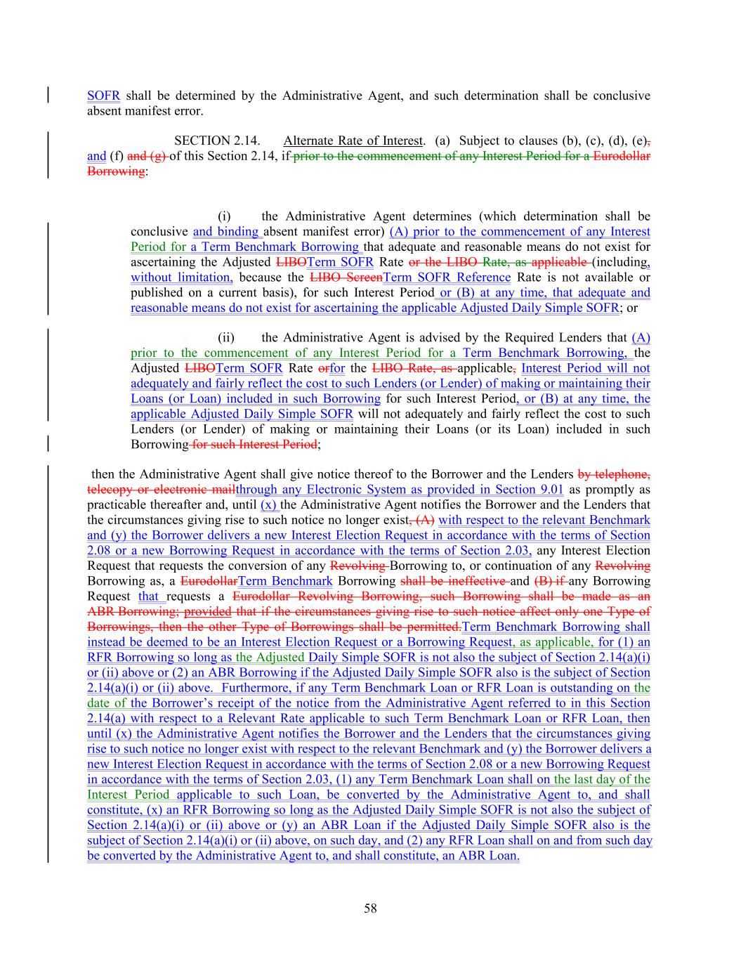 SOFR shall be determined by the Administrative Agent, and such determination shall be conclusive absent manifest error. SECTION 2.14. Alternate Rate of Interest. (a) Subject to clauses (b), (c), (d), (e), and (f) and (g) of this Section 2.14, if prior to the commencement of any Interest Period for a Eurodollar Borrowing: (i) the Administrative Agent determines (which determination shall be conclusive and binding absent manifest error) (A) prior to the commencement of any Interest Period for a Term Benchmark Borrowing that adequate and reasonable means do not exist for ascertaining the Adjusted LIBOTerm SOFR Rate or the LIBO Rate, as applicable (including, without limitation, because the LIBO ScreenTerm SOFR Reference Rate is not available or published on a current basis), for such Interest Period or (B) at any time, that adequate and reasonable means do not exist for ascertaining the applicable Adjusted Daily Simple SOFR; or (ii) the Administrative Agent is advised by the Required Lenders that (A) prior to the commencement of any Interest Period for a Term Benchmark Borrowing, the Adjusted LIBOTerm SOFR Rate orfor the LIBO Rate, as applicable, Interest Period will not adequately and fairly reflect the cost to such Lenders (or Lender) of making or maintaining their Loans (or Loan) included in such Borrowing for such Interest Period, or (B) at any time, the applicable Adjusted Daily Simple SOFR will not adequately and fairly reflect the cost to such Lenders (or Lender) of making or maintaining their Loans (or its Loan) included in such Borrowing for such Interest Period; then the Administrative Agent shall give notice thereof to the Borrower and the Lenders by telephone, telecopy or electronic mailthrough any Electronic System as provided in Section 9.01 as promptly as practicable thereafter and, until (x) the Administrative Agent notifies the Borrower and the Lenders that the circumstances giving rise to such notice no longer exist, (A) with respect to the relevant Benchmark and (y) the Borrower delivers a new Interest Election Request in accordance with the terms of Section 2.08 or a new Borrowing Request in accordance with the terms of Section 2.03, any Interest Election Request that requests the conversion of any Revolving Borrowing to, or continuation of any Revolving Borrowing as, a EurodollarTerm Benchmark Borrowing shall be ineffective and (B) if any Borrowing Request that requests a Eurodollar Revolving Borrowing, such Borrowing shall be made as an ABR Borrowing; provided that if the circumstances giving rise to such notice affect only one Type of Borrowings, then the other Type of Borrowings shall be permitted.Term Benchmark Borrowing shall instead be deemed to be an Interest Election Request or a Borrowing Request, as applicable, for (1) an RFR Borrowing so long as the Adjusted Daily Simple SOFR is not also the subject of Section 2.14(a)(i) or (ii) above or (2) an ABR Borrowing if the Adjusted Daily Simple SOFR also is the subject of Section 2.14(a)(i) or (ii) above. Furthermore, if any Term Benchmark Loan or RFR Loan is outstanding on the date of the Borrower’s receipt of the notice from the Administrative Agent referred to in this Section 2.14(a) with respect to a Relevant Rate applicable to such Term Benchmark Loan or RFR Loan, then until (x) the Administrative Agent notifies the Borrower and the Lenders that the circumstances giving rise to such notice no longer exist with respect to the relevant Benchmark and (y) the Borrower delivers a new Interest Election Request in accordance with the terms of Section 2.08 or a new Borrowing Request in accordance with the terms of Section 2.03, (1) any Term Benchmark Loan shall on the last day of the Interest Period applicable to such Loan, be converted by the Administrative Agent to, and shall constitute, (x) an RFR Borrowing so long as the Adjusted Daily Simple SOFR is not also the subject of Section 2.14(a)(i) or (ii) above or (y) an ABR Loan if the Adjusted Daily Simple SOFR also is the subject of Section 2.14(a)(i) or (ii) above, on such day, and (2) any RFR Loan shall on and from such day be converted by the Administrative Agent to, and shall constitute, an ABR Loan. 58